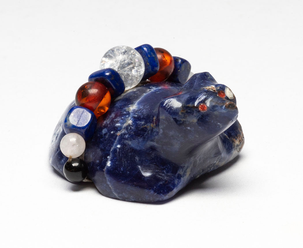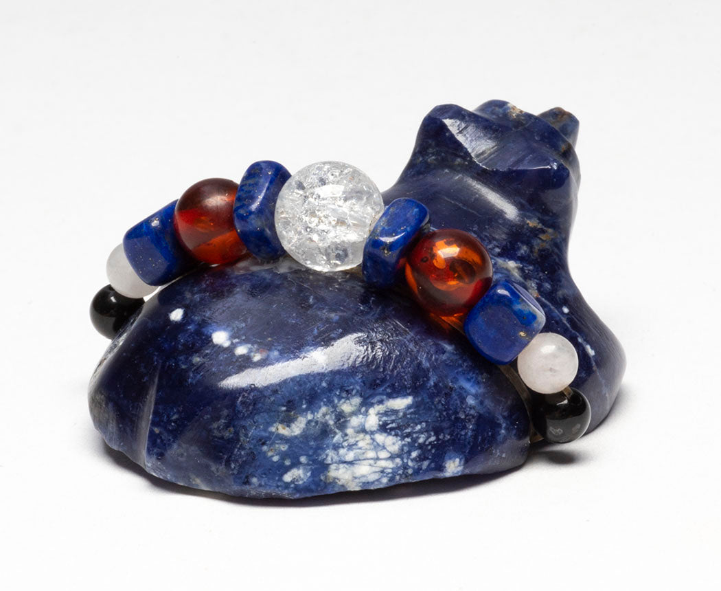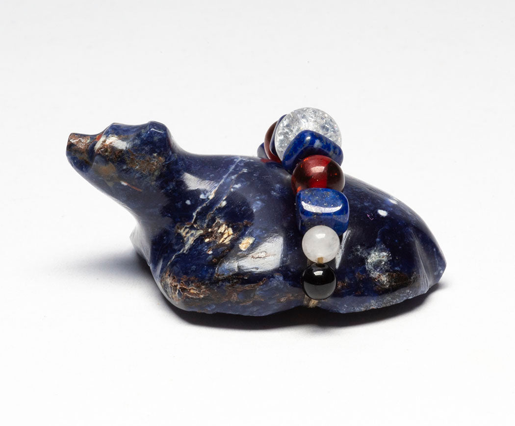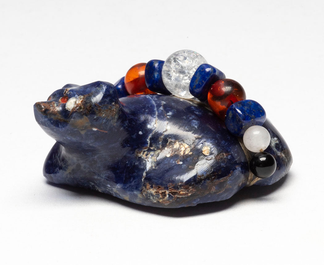 Indigenous teachings about kinship with the natural world reveals we miss out on a lot of positive interactions when we adopt negative attitudes toward wildlife. Cheryl Beyuka told us her coral-eyed Bear is laying down, smoothly sculpted from sodalite. An offering bundle representing gratitude is laced with scrumptious lapis, jet, quartz and perhaps carnelian beads. A stone carving serving as a wonderful reminder to respect and protect wildlife. Bears are forest managers keeping the Earth beautiful for us all. About 2" long, 1 3/4" wide and 3/4" tall.