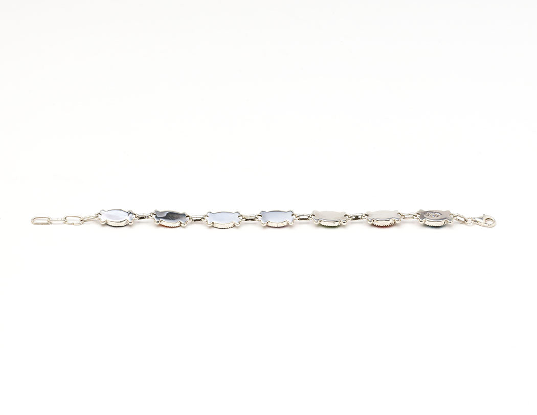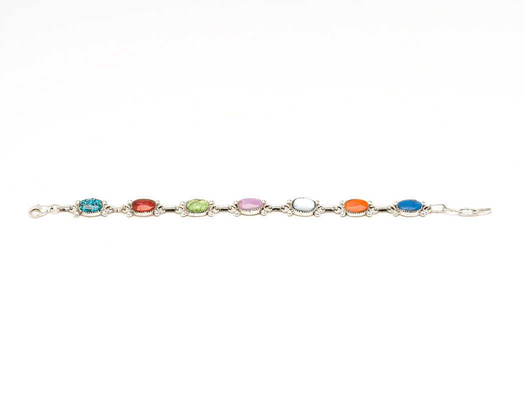 Like a colorful rainbow encircling your wrist, these natural stones and shells are like those magical moments when dark rain clouds part to reveal a magnificent rainbow. Diane Lonjose's handmade sterling silver link bracelet is beautifully balanced. Precious turquoise, lavender-hued phosphosiderite, iridescent mother-of-pearl, bright spiny oyster shell, vivid lapis lazuli and verdant serpentine are stunning together. The joyful link bracelet is about 8" long with an easy to use lobster clasp closure. The bracelet is approximately 3/8" wide and 1/8" tall. Signed by the artist.