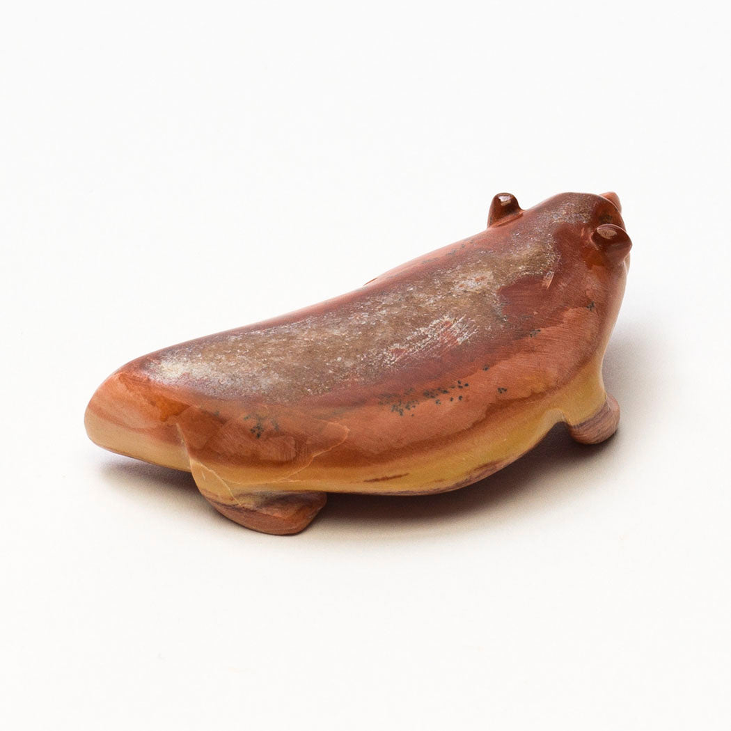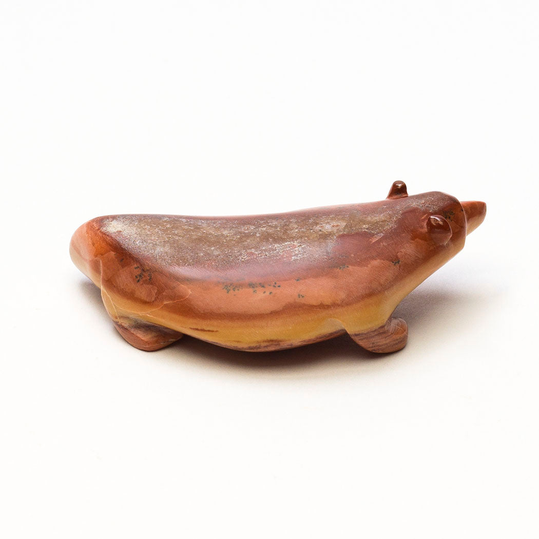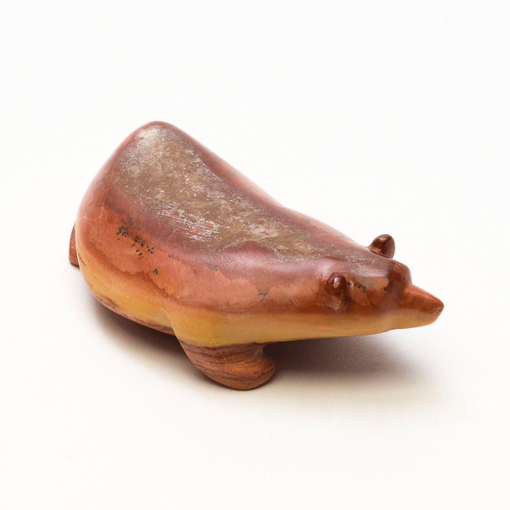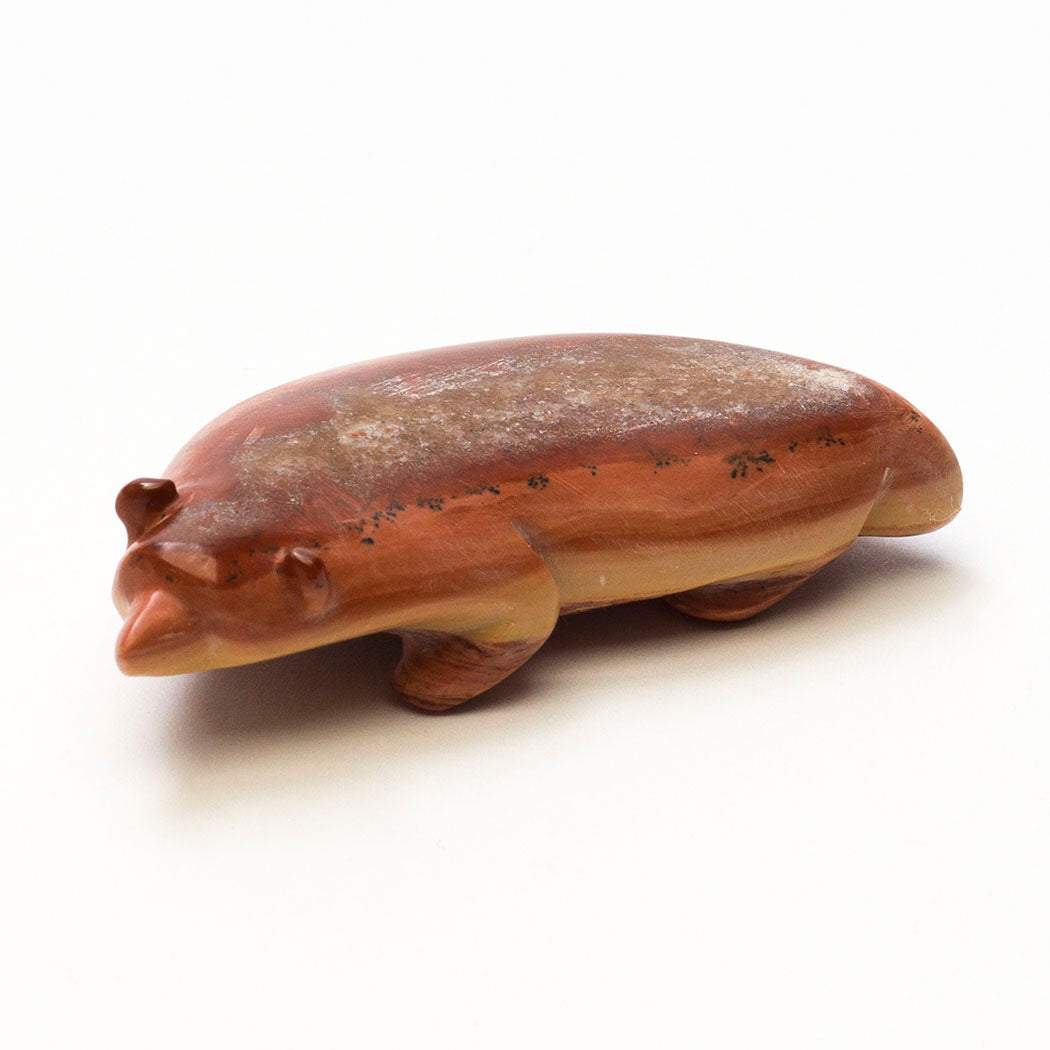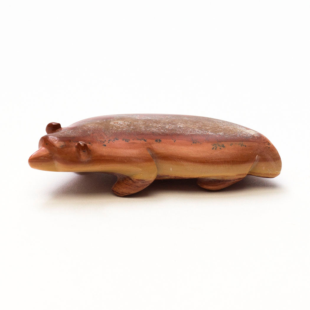 Badgers are assertive tenacious creatures who fearlessly live each day. Their strong spirit or animal medicine teaches us to summon the grit and guts to speak up, one of the greatest freedoms we'll ever have. Smoothly sculpted from a gorgeous dolomite hosting sparkling crystalline variations on the back region, as well as a few dendritic inclusions, Melvin Sandoval's powerful friend is about 2 5/8" long, 1 1/4" wide and 5/8" tall. Ears are attentive.