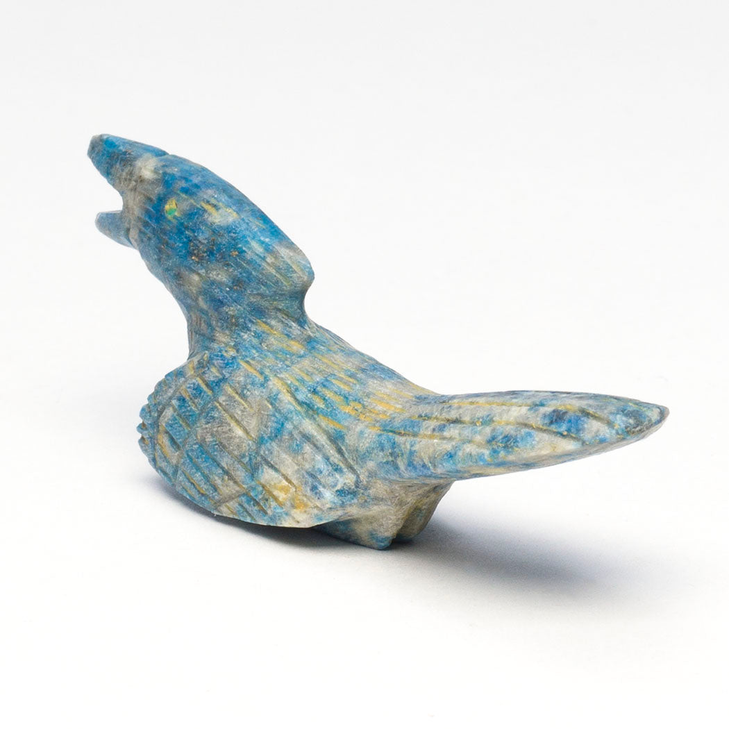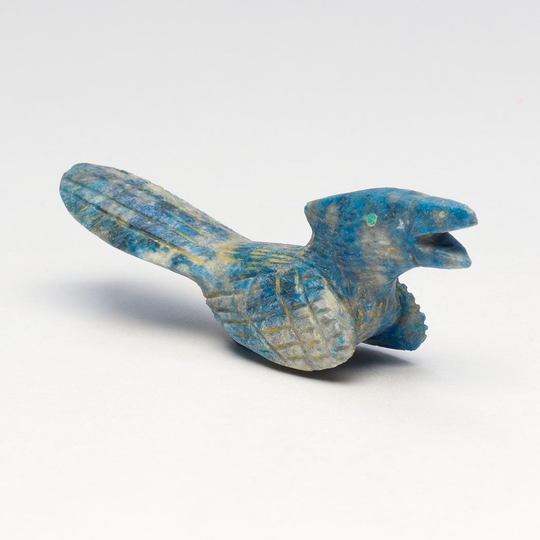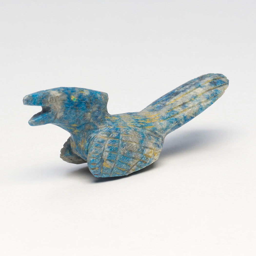 Enchanting roadrunners have long tails for steering and balance while running up to about 15 mph. Dwelling in arid desert country, they get most of the water they need from the food they eat. A special nasal gland helps them excrete excess salt reducing the need to drink fresh water. Bryston Bowannie's wonderful roadrunner is sculpted from denim lapis beloved for its resemblance to faded denim. With much to say, this approximately 2 3/4" long, 3/4" wide and 1" tall feathered friend has nice eyes from turquoise inlays.