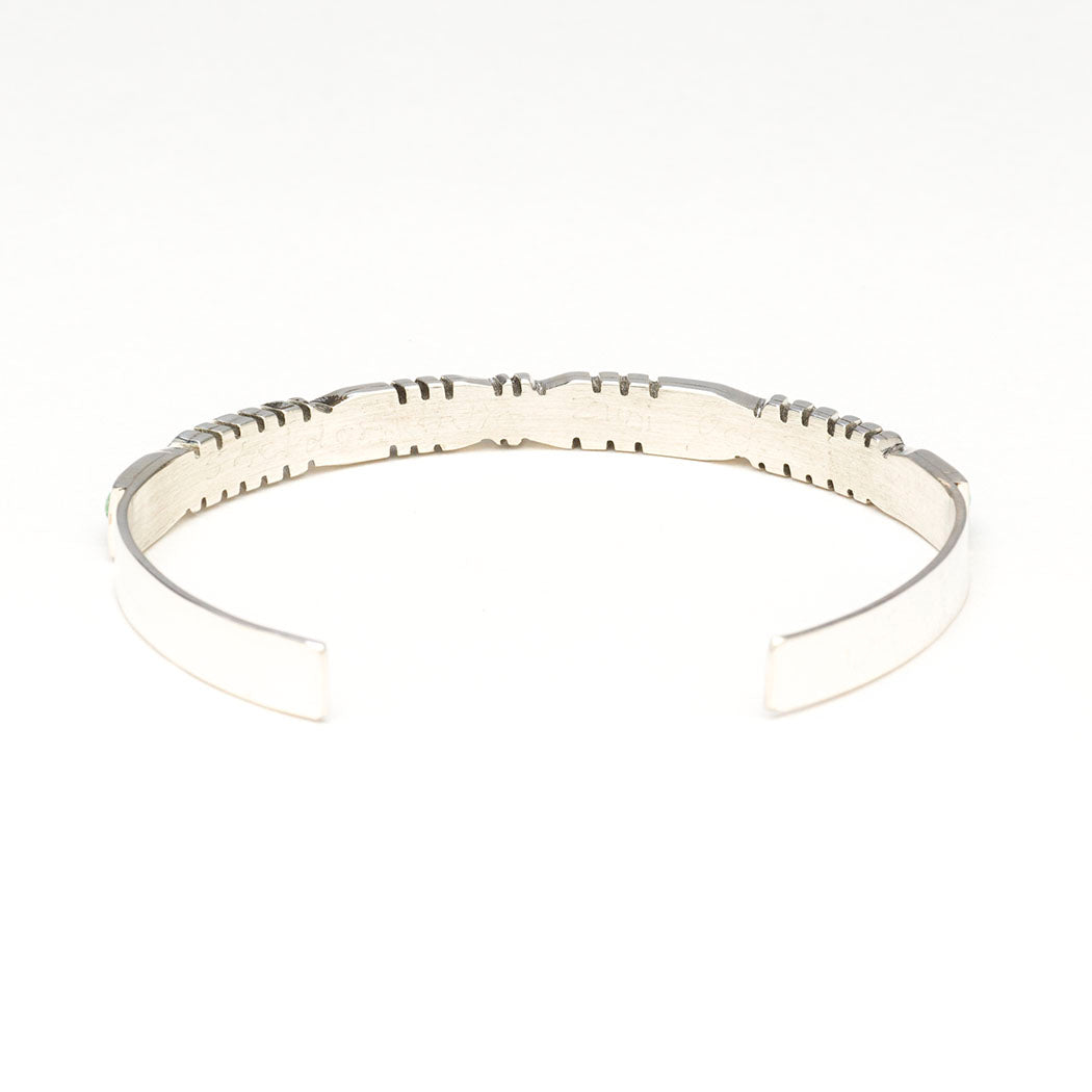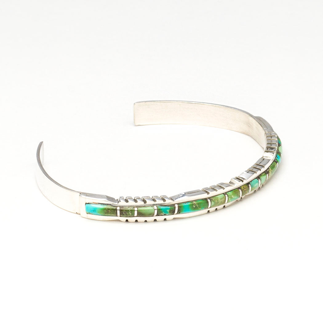 Zuni master jeweler Sheldon Lalio's elegant slim-profiled cuff bracelet is a breeze worn alone or layered with other pieces. Refreshing turquoise stones are skillfully set into sterling silver channels accented by a lovely exterior edge or border achieved through a fine-bladed jeweler's saw. This gorgeous bracelet is about 1/4" wide. The entire inner circumference is about 6 1/2" which includes the opening of approximately 1 1/4". Signed by the artist. Please click