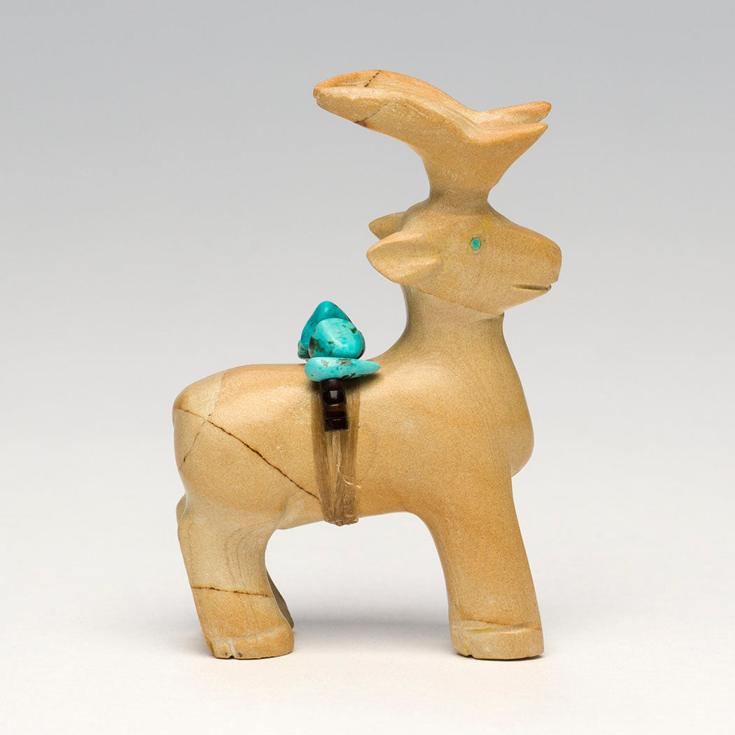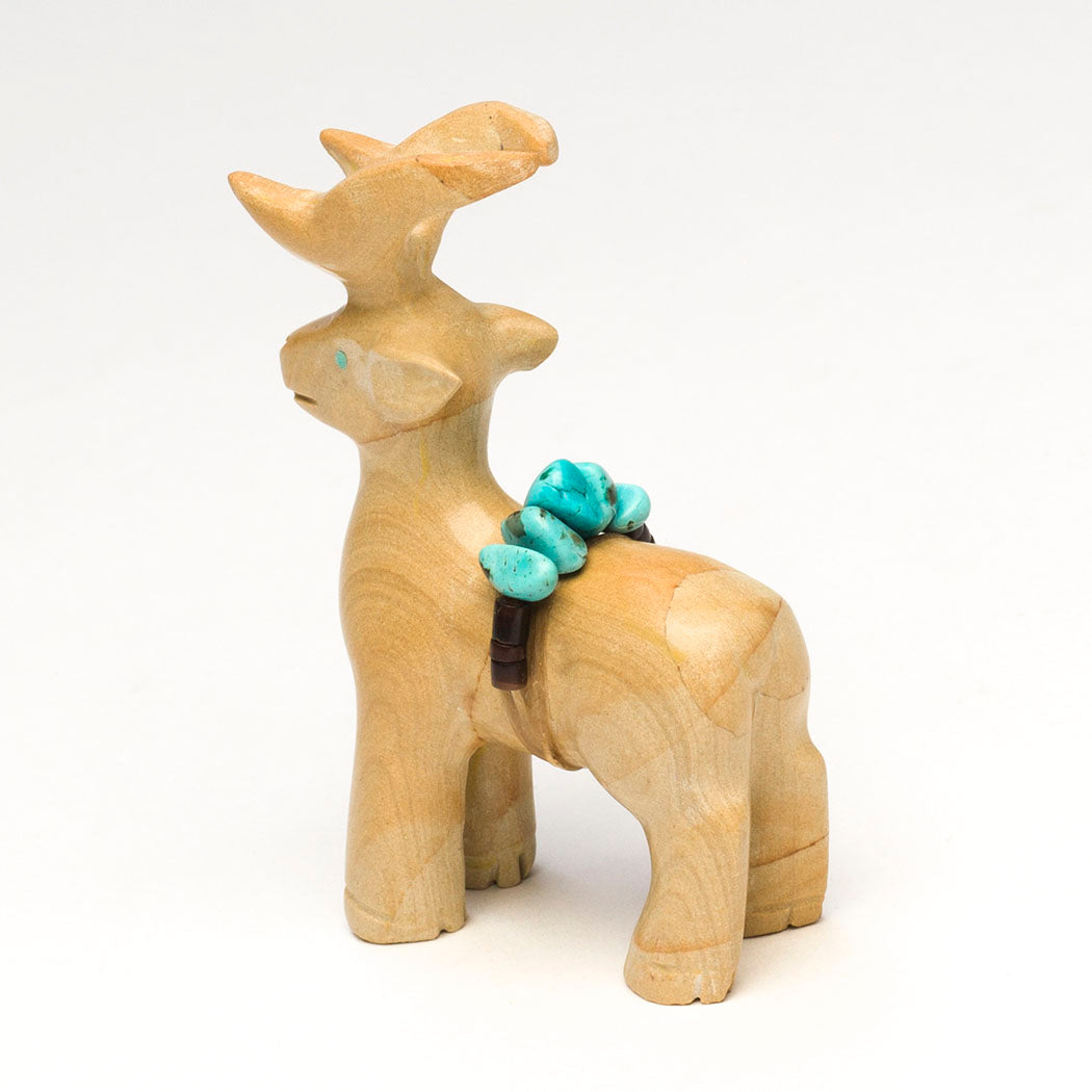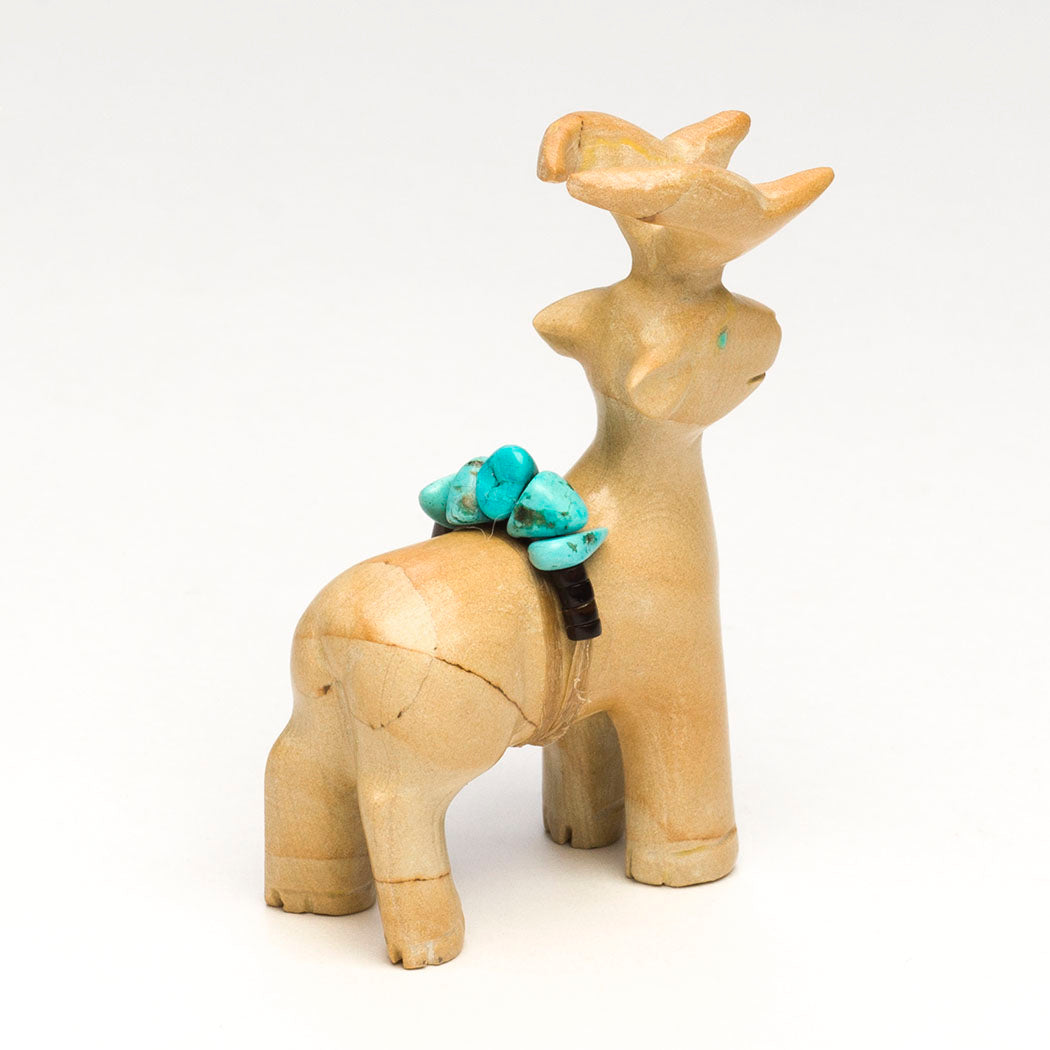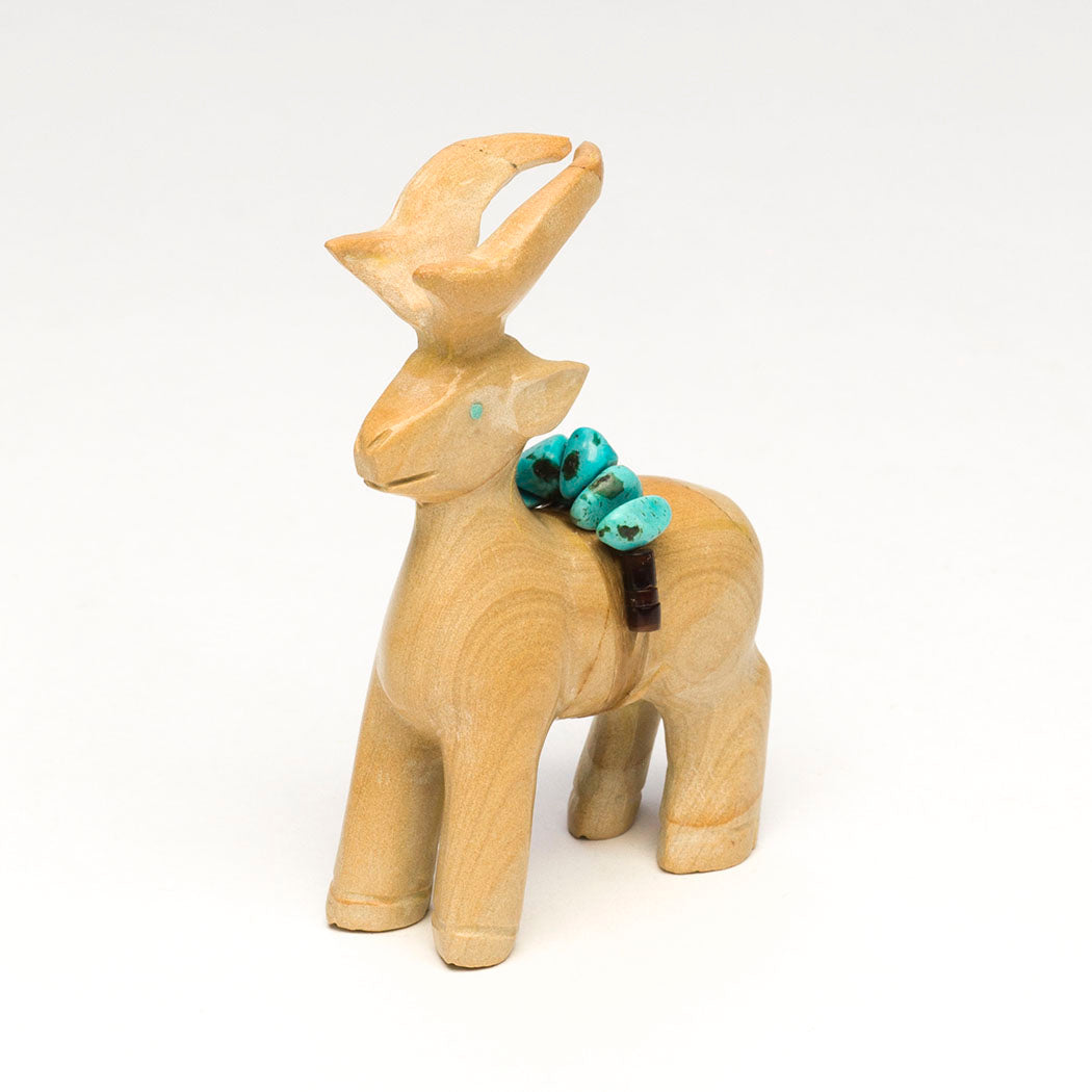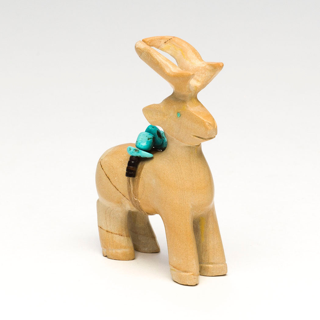 The North American pronghorn is the last of its kind endangered in some areas. They are the only living species with their closest relatives being the giraffe. Like deer, the males are called bucks and the females does however both males and females grow horns, unlike Deer or Elk. Pronghorns shed their horns annually while antelope keep theirs for life. Bryston Bowannie's wonderful picture jasper pronghorn has turquoise eyes and measures roughly 1 3/4" long, 3/4" wide and 2 3/4" tall.
