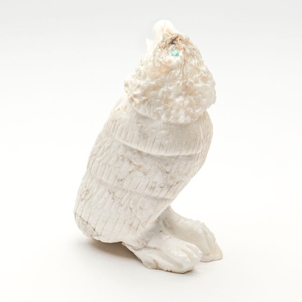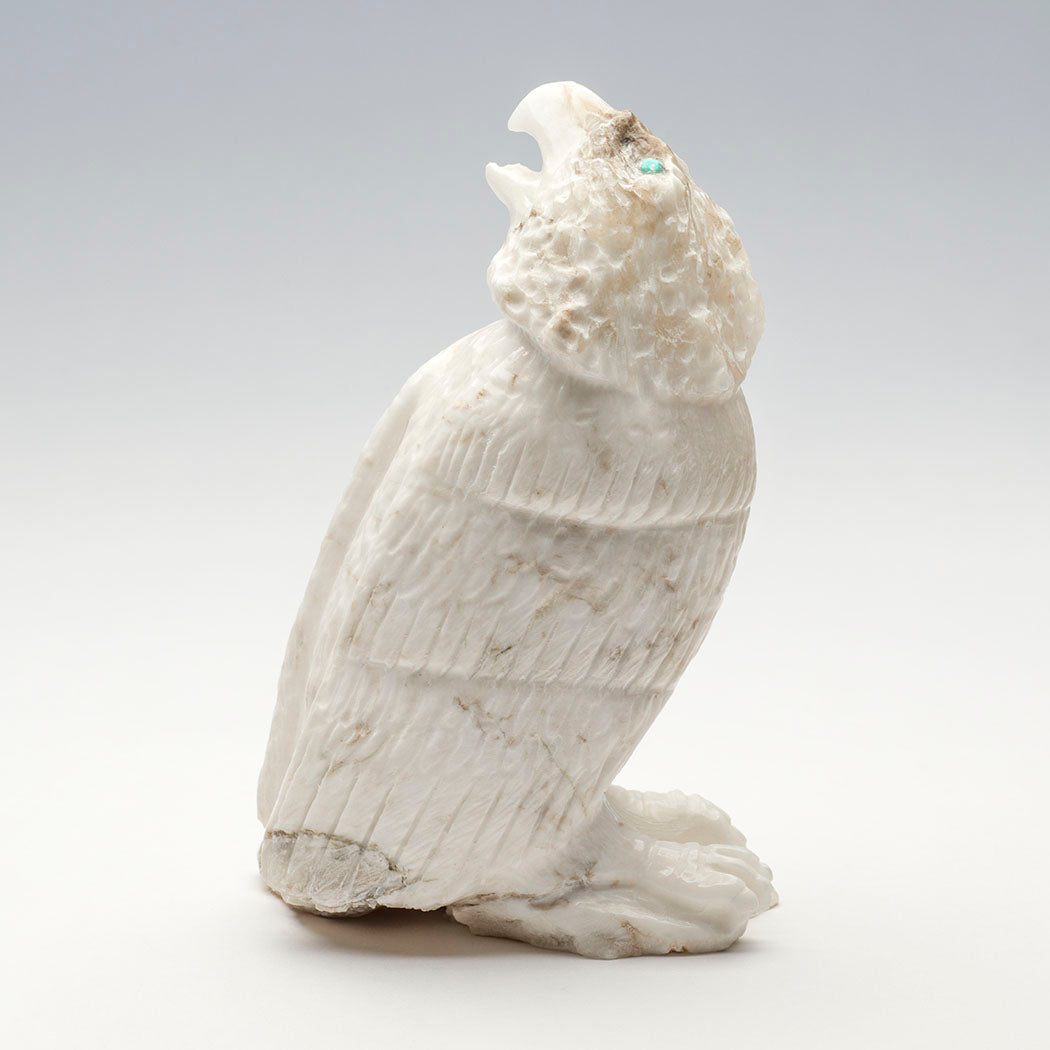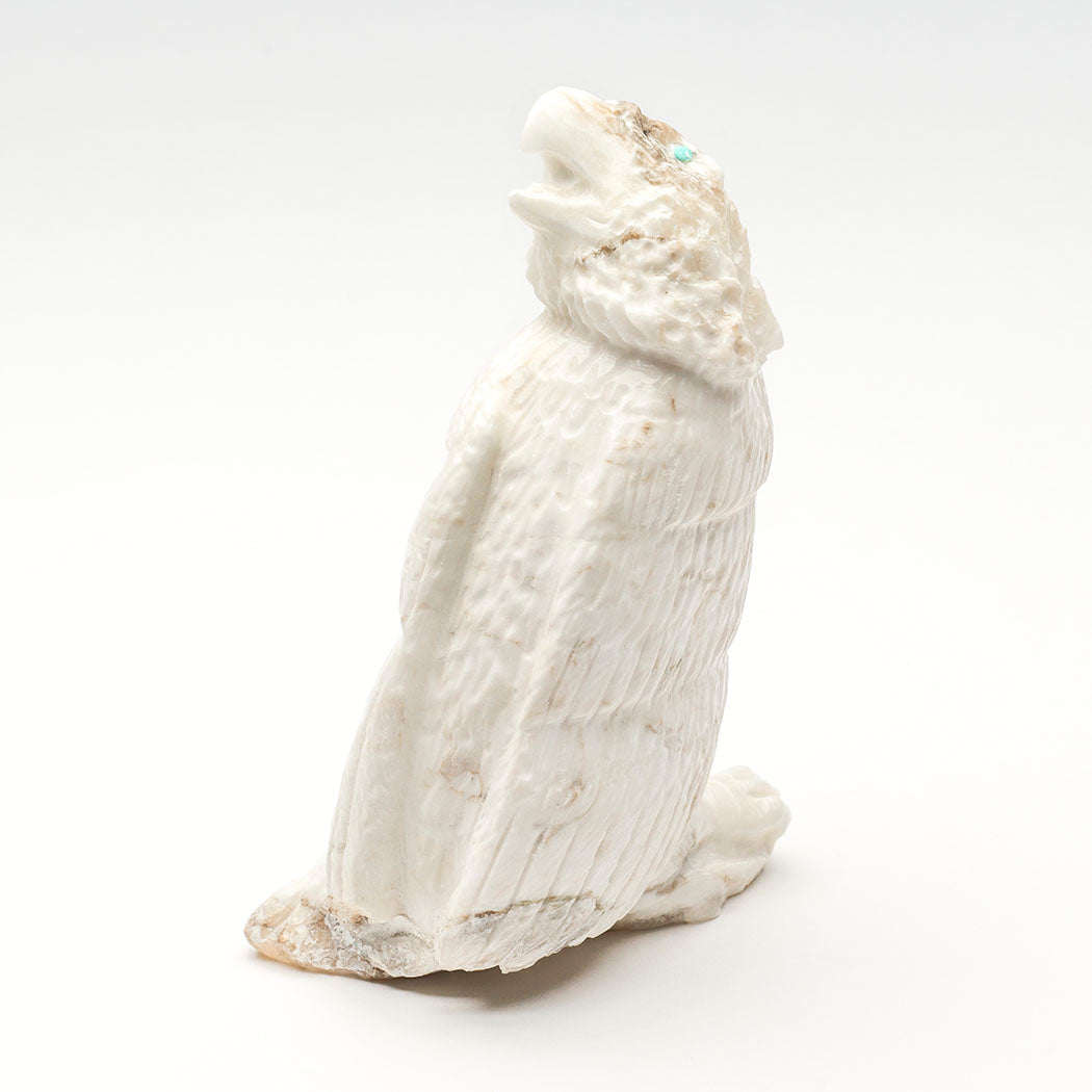 The magnificent Harpy Eagle is one of the largest on Mother Earth. Recently sighted in a rainforest in southern Mexico where it was believed to be locally extinct, Indigenous communities and conservationists wholeheartedly celebrate the critically endangered raptor's presence. Through a special educational program, local participants engage in regular field visits and wildlife monitoring. They've receive training and equipment to aid in the effort. Harpy Eagles face pressure from logging and agricultural expansion. Their food web is threatened too. Creatures like monkeys and sloths that they rely on for food must be protected as well. Plant and animal nutrition that monkeys and sloths count on are also necessary for their survival. Trees are absolutely vital to nesting Harpy Eagles. Clive Hustito's perched Harpy Eagle has been sculpted from marble to a size of approximately 5" tall, 3 1/4" wide and 2 3/8" long. Wise eyes are from turquoise set to a beautifully turned head.