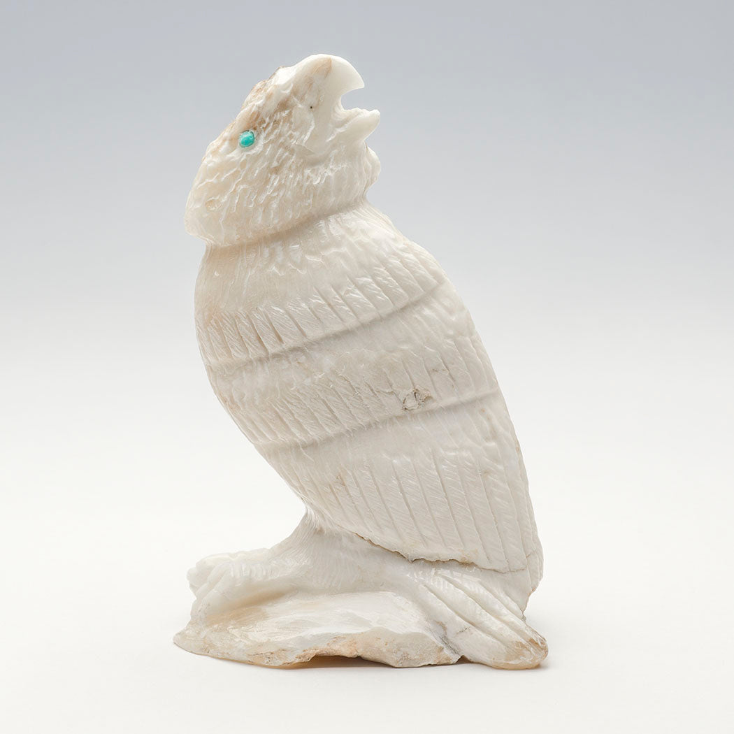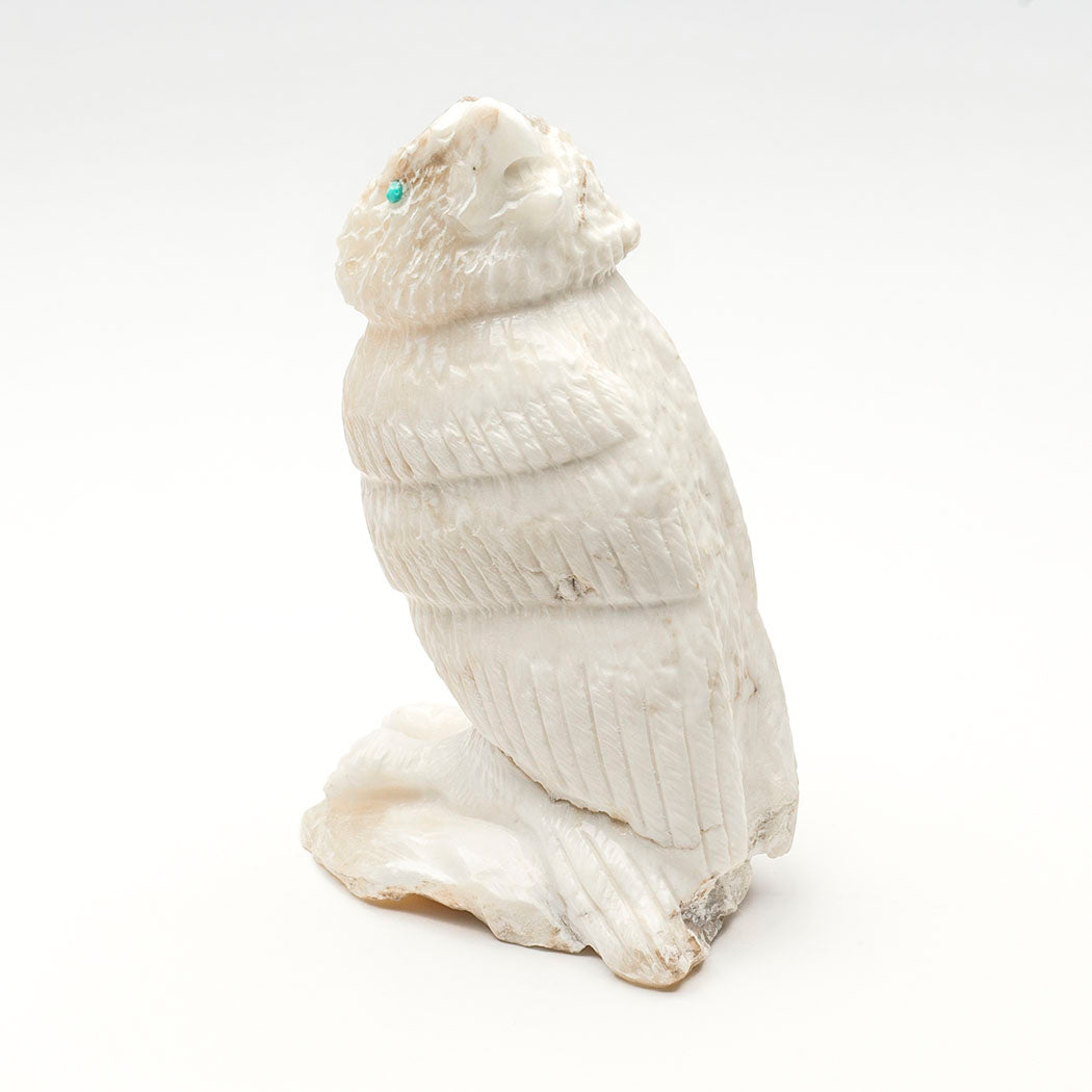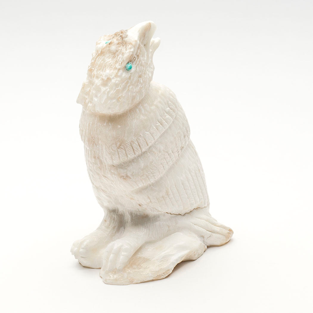 The magnificent Harpy Eagle is one of the largest on Mother Earth. Recently sighted in a rainforest in southern Mexico where it was believed to be locally extinct, Indigenous communities and conservationists wholeheartedly celebrate the critically endangered raptor's presence. Through a special educational program, local participants engage in regular field visits and wildlife monitoring. They've receive training and equipment to aid in the effort. Harpy Eagles face pressure from logging and agricultural expansion. Their food web is threatened too. Creatures like monkeys and sloths that they rely on for food must be protected as well. Plant and animal nutrition that monkeys and sloths count on are also necessary for their survival. Trees are absolutely vital to nesting Harpy Eagles. Clive Hustito's perched Harpy Eagle has been sculpted from marble to a size of approximately 5" tall, 3 1/4" wide and 2 3/8" long. Wise eyes are from turquoise set to a beautifully turned head.