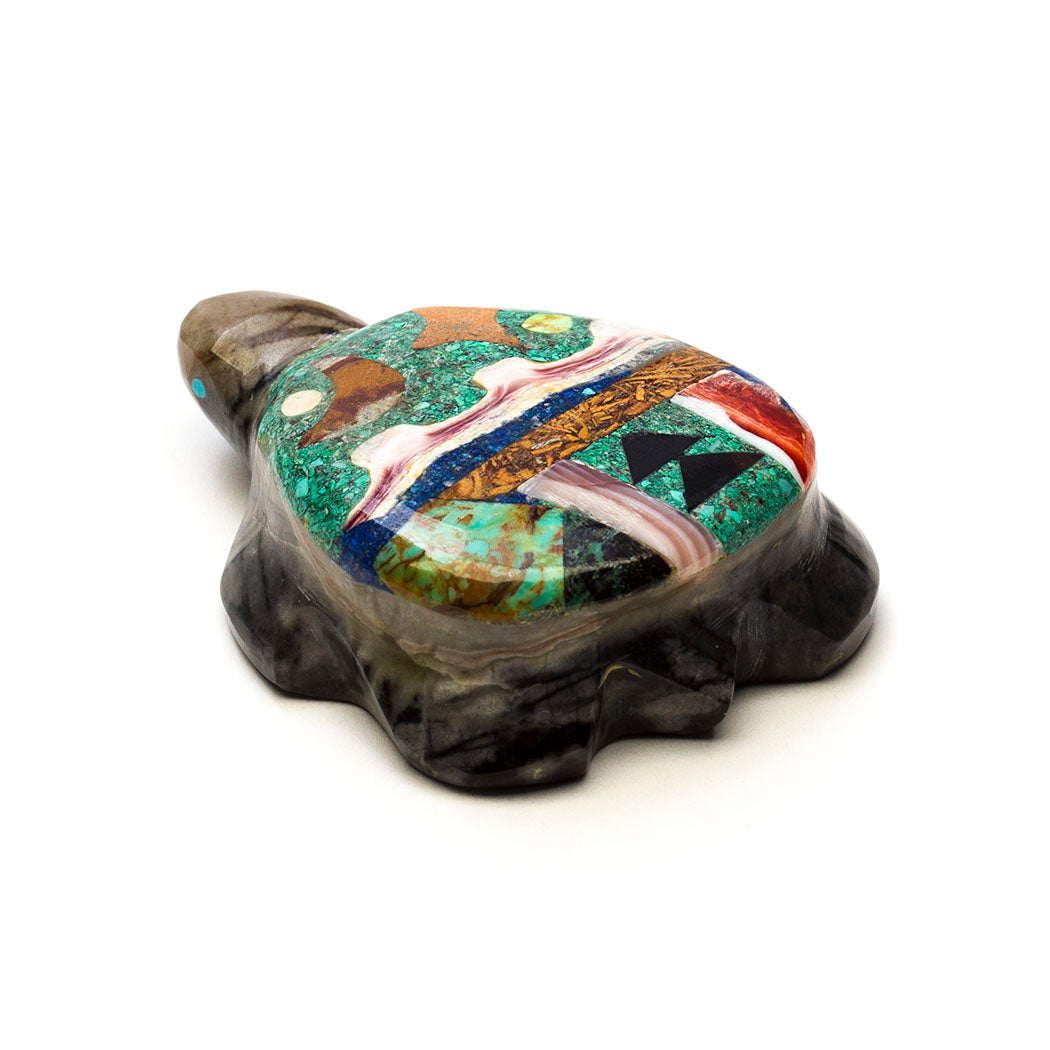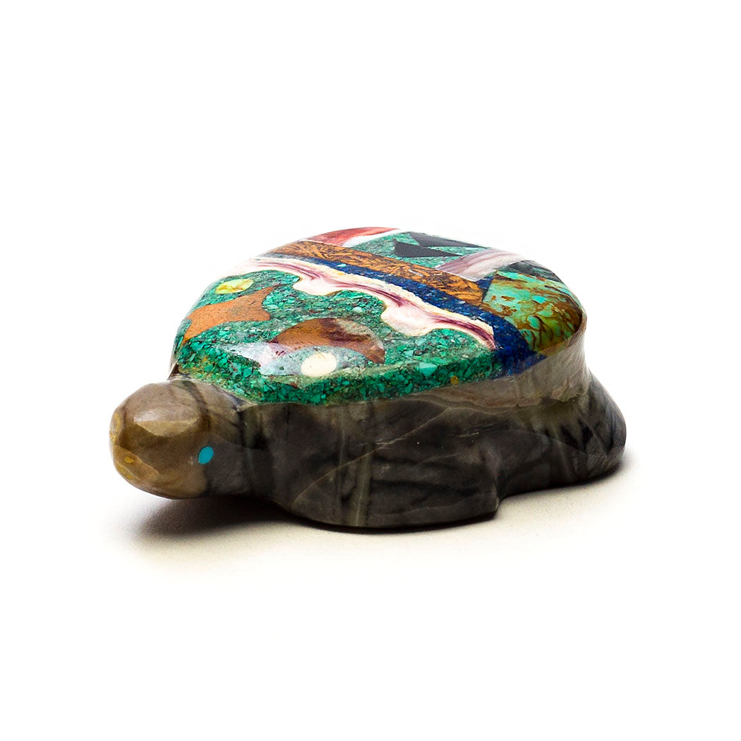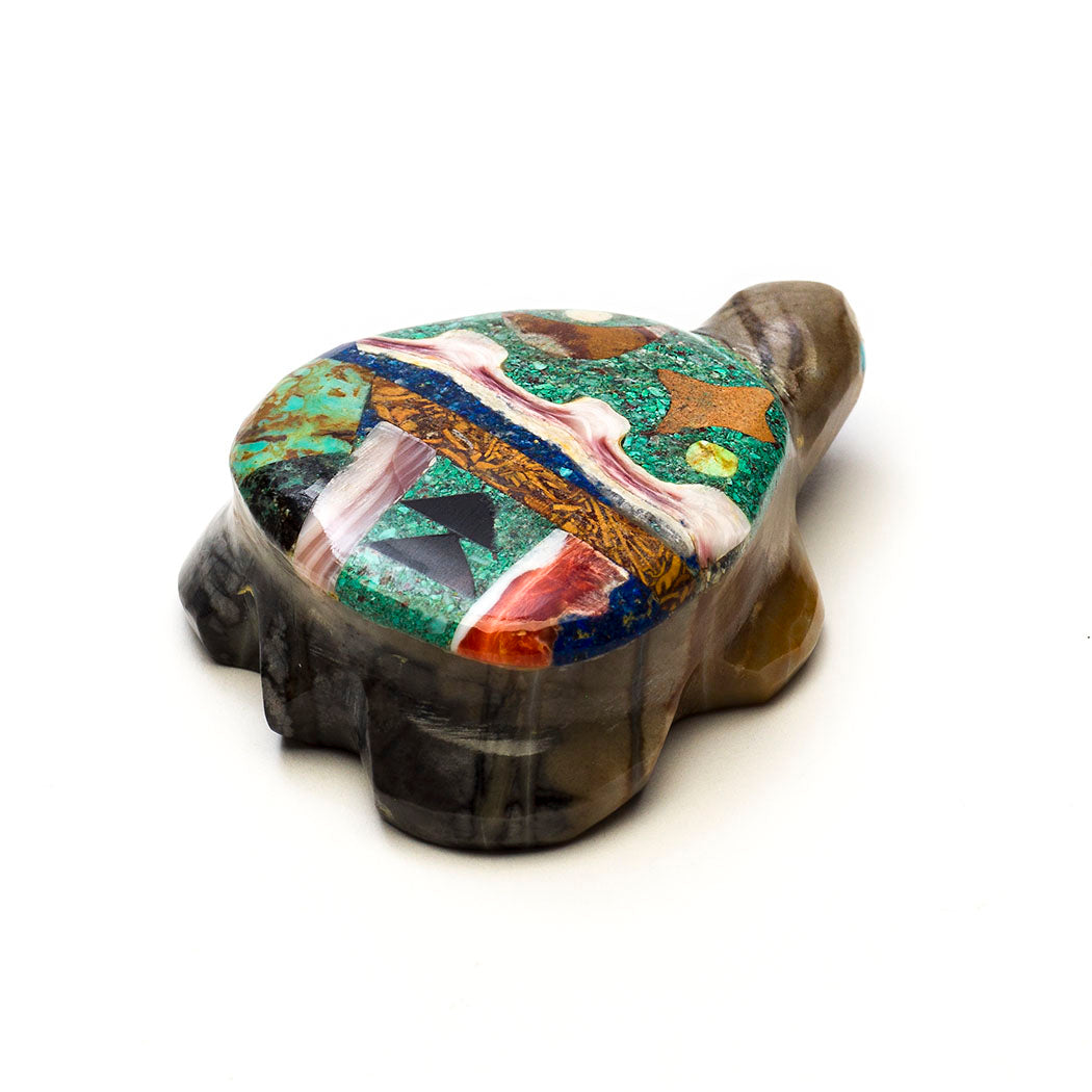 The night's sky is filled with all kinds of wonders such as stars, comets and meteors. Stargazing helps you be a better person because transformative feelings come to the fore revealing what's most important in life. Jayne Quam's Picasso marble Turtle with turquoise inlaid eyes is overlaid with a nightscape mosaic from colorful fish rock serpentine, shell, onyx, travertine, turquoise, crushed turquoise, spiny oyster shell, crushed lapis, fossilized jasper, pen shell, pink mussel shell and zoisite. About 2 1/4" long, 1 5/8" wide and 3/4" tall.
