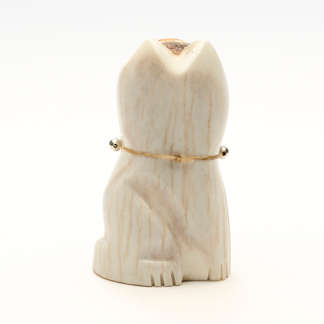 Boldly incised whiskers, inquisitive eyes from turquoise inlays, a triangular-shaped burnished nose and small offering necklace laced with a tiny bell and silver beads are impressive aspects of this approximately 2 1/4" tall, 1 1/4" wide and 1 1/4" deep domestic kitty cat from antler by Robert Michael Weahkee. He said "that I would like to describe my work as whimsical and fun. My favorite medium to carve is elk/deer shed antlers, mostly from Zuni. Spring time is when I get to walk around and look for them, but I also buy from community members."