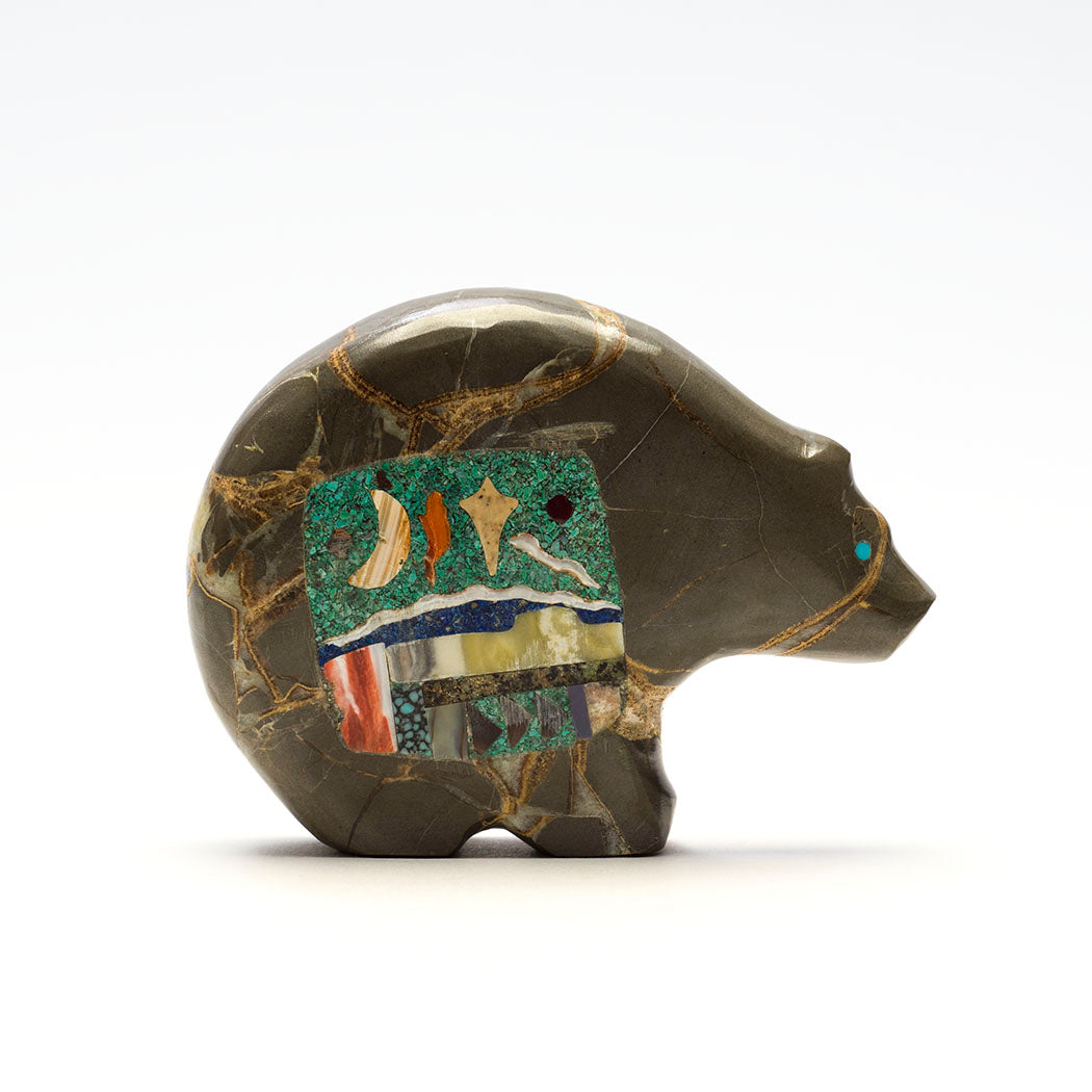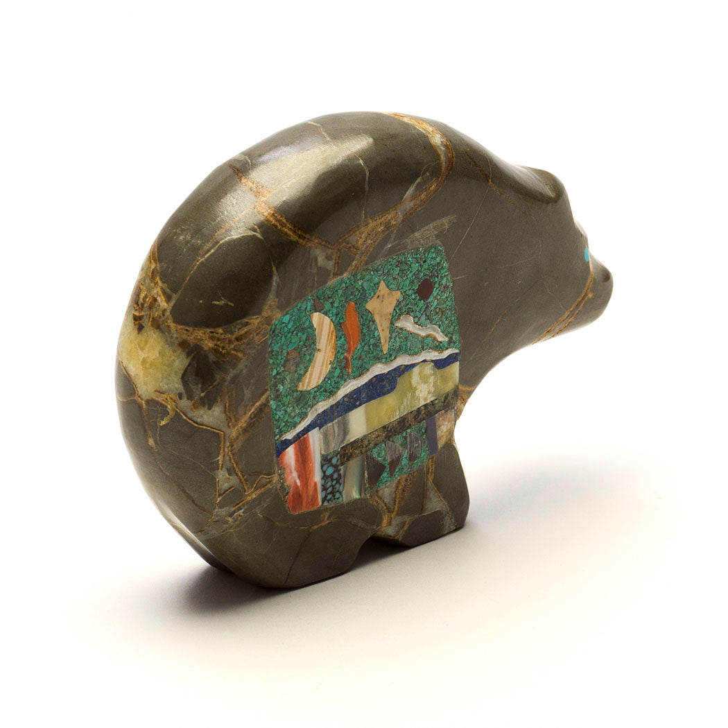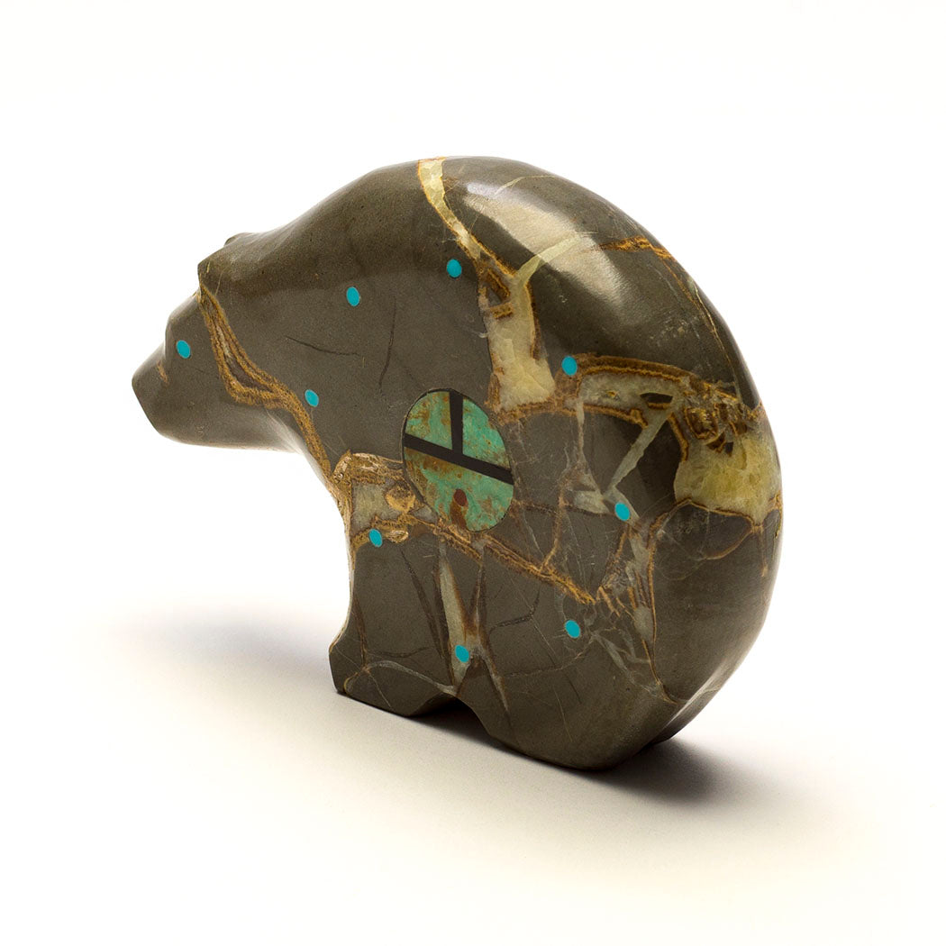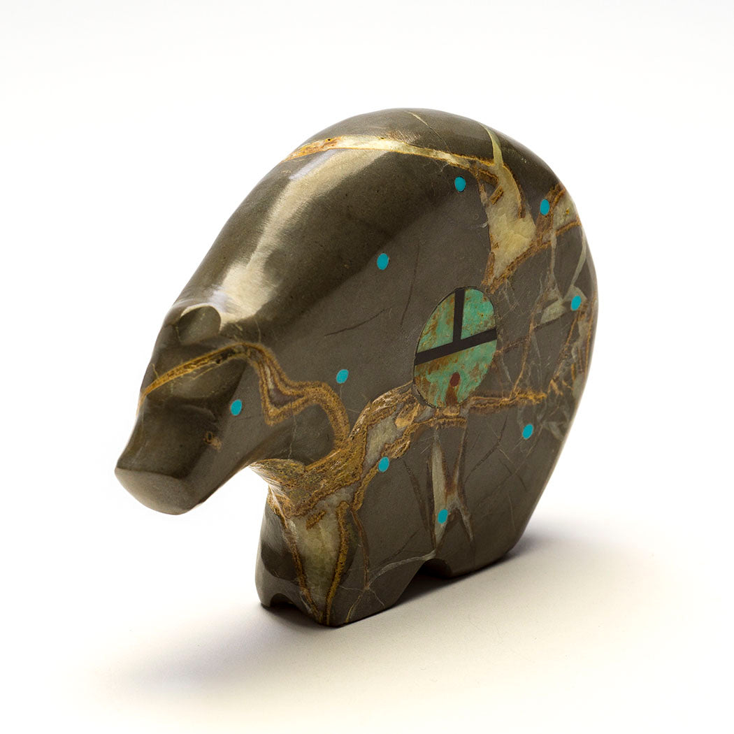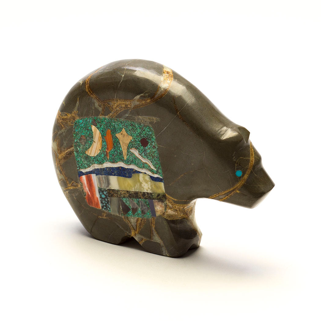 Husband and wife artists Lynn and Jayne Quam have collaborated in carving and inlaying a reversible septarian nodule Bear (or Medicine-Bear). We see a gorgeous inlaid mosaic from crushed turquoise, alunite, onyx, spiny oyster shell, serpentine, crushed lapis, pen shell, abalone, marble, serpentine with augite and fish rock serpentine on one side. The other side hosts an inlaid Zuni Sunface from turquoise, jet and pipestone, with radiating turquoise pieces. A traditional symbol, it represents the elements in balance. A meaningful and versatile bear that has expressive turquoise inlaid eyes. Approximately 3 7/8" long, 1" wide and 2 7/8" tall.