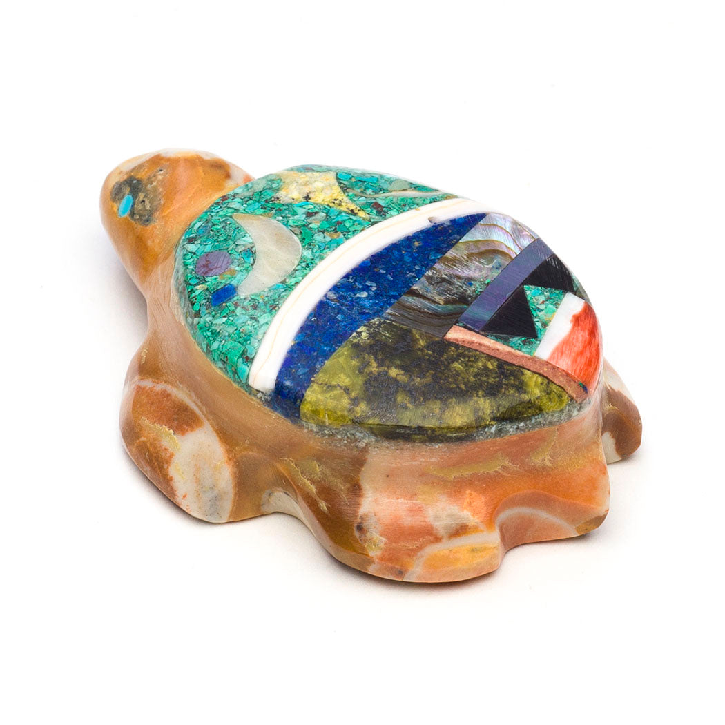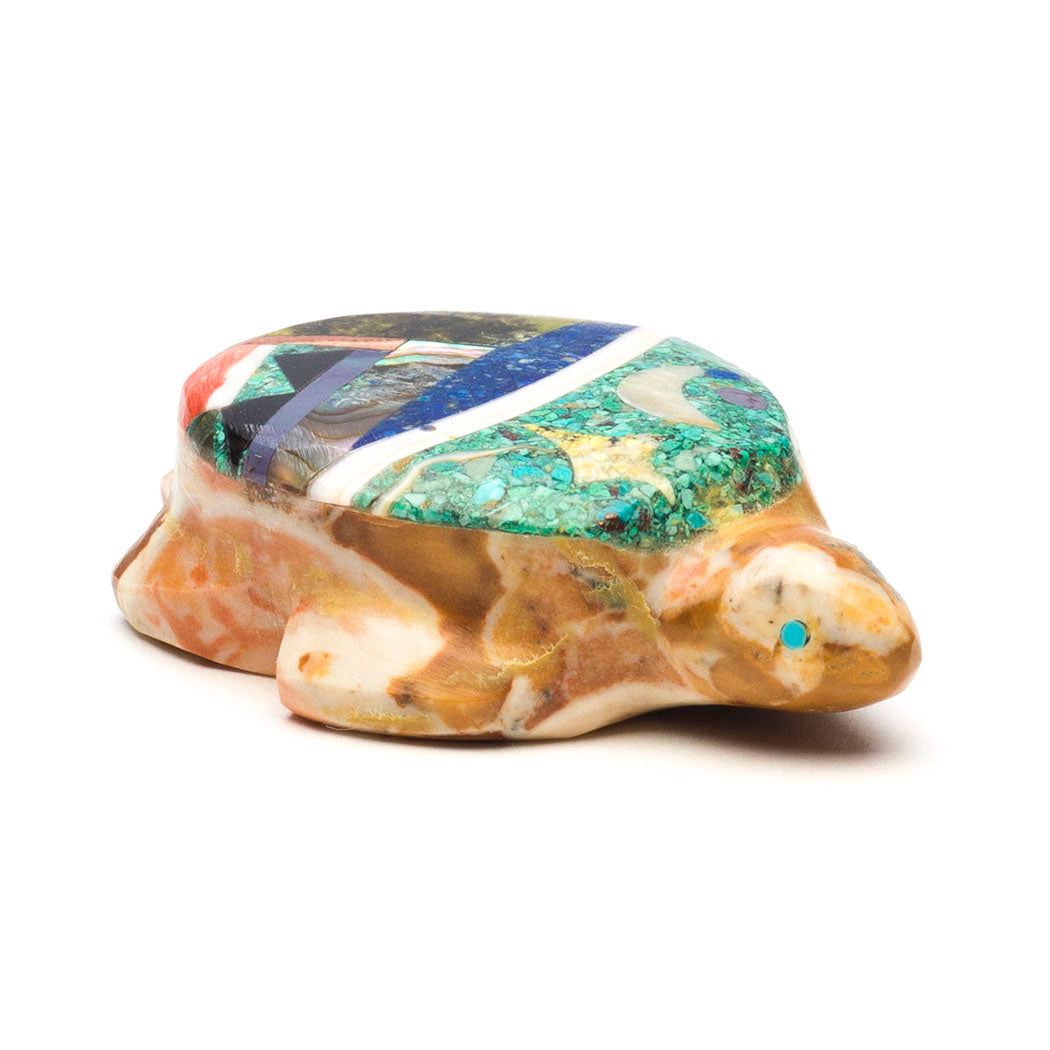 Jayne Quam's lovely tidgilite Turtle has a fancy house or carapace that's a visual experience. An appealing mosaic from exciting materials like crushed turquoise, crushed serpentine, marble, lapis lazuli, shell, crushed lapis, serpentine, rainbow calsilica, abalone, alunite, violite, rhyolite, pen shell and spiny oyster shell are harmoniously arranged in a nighttime scene. Eyes from turquoise inlays are like deep clear pools. About 2" long, 1 1/2" wide and 1/2" tall.