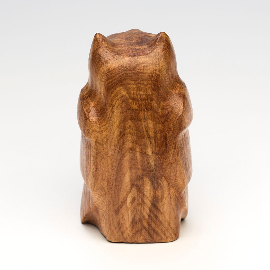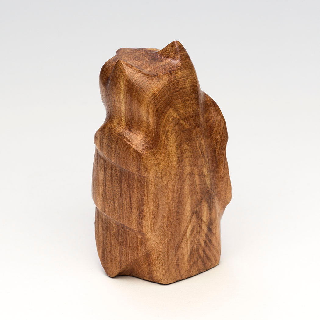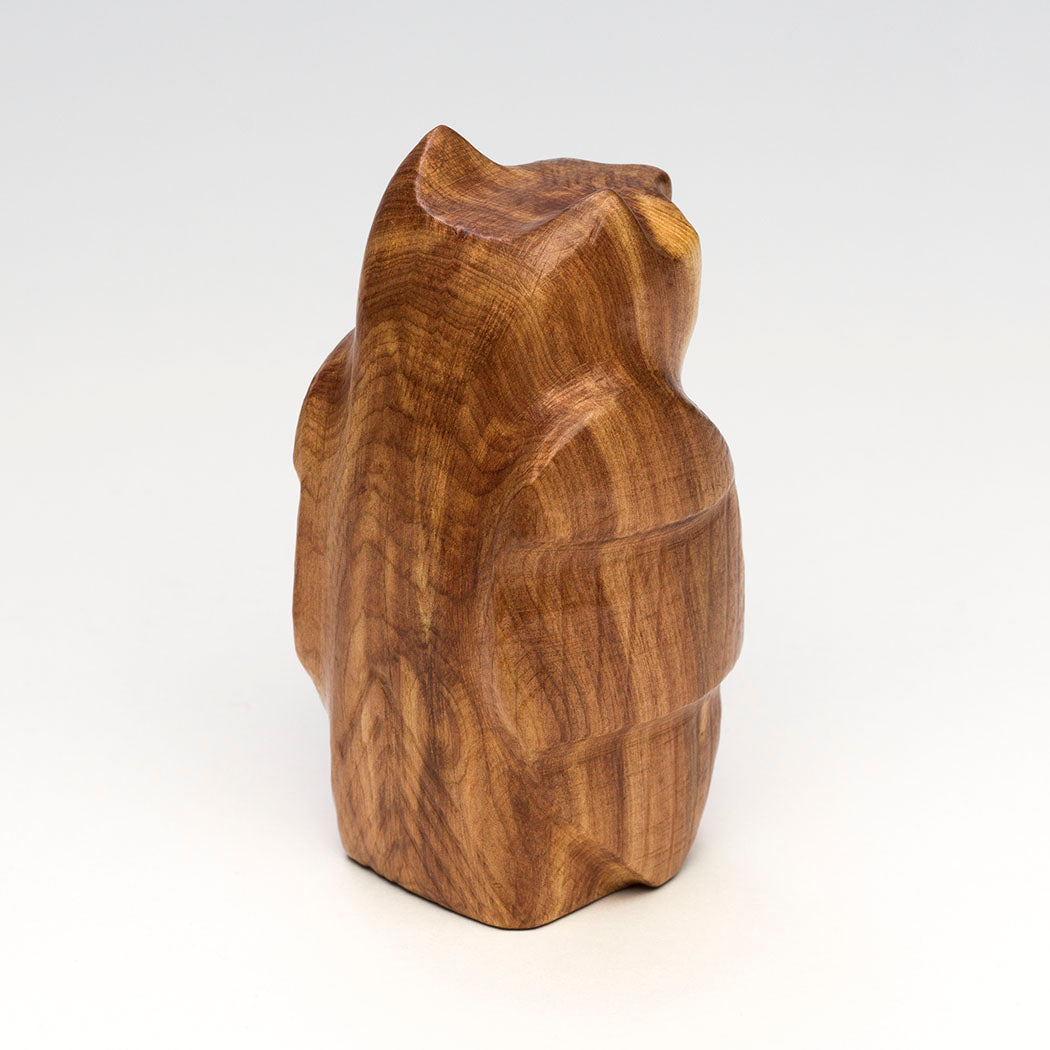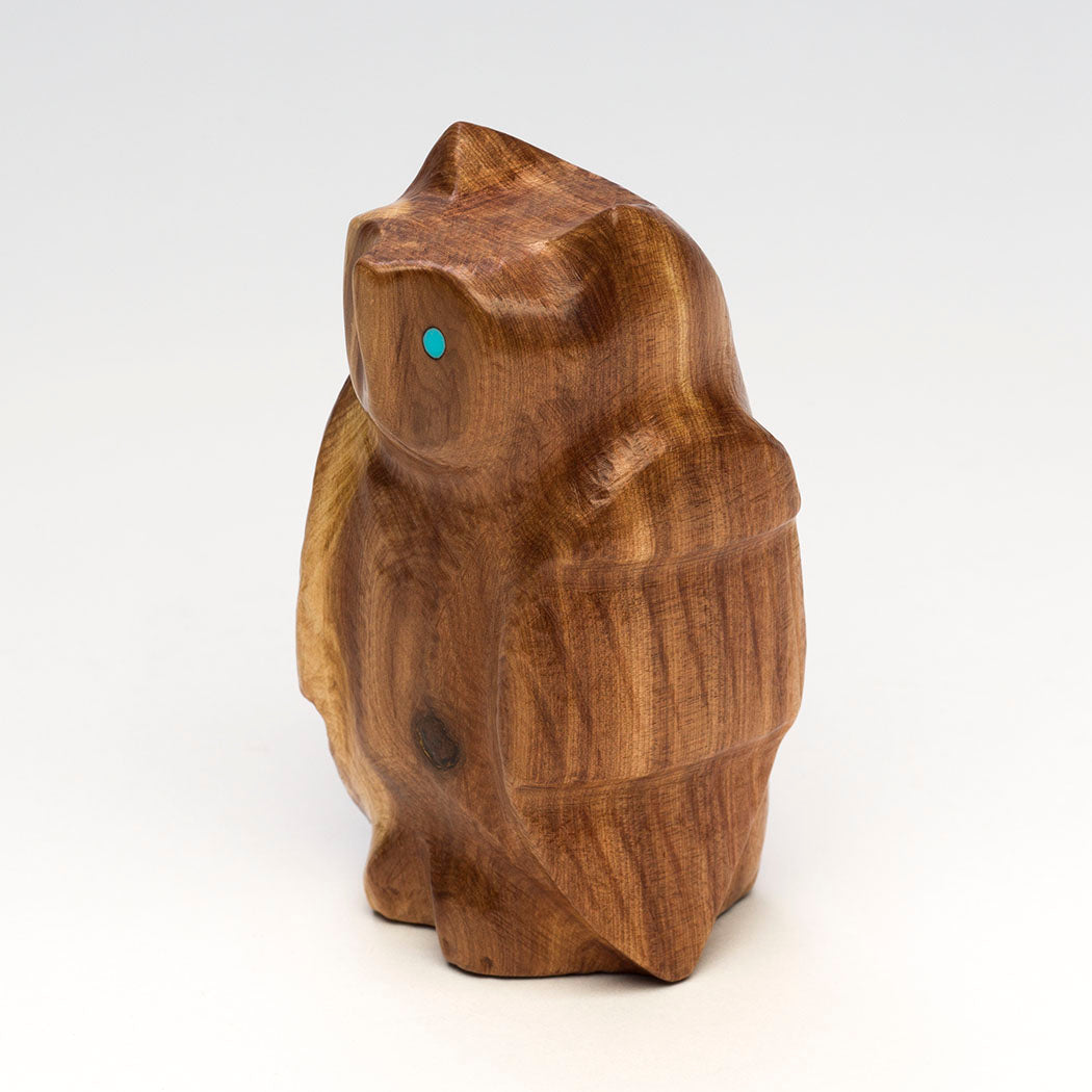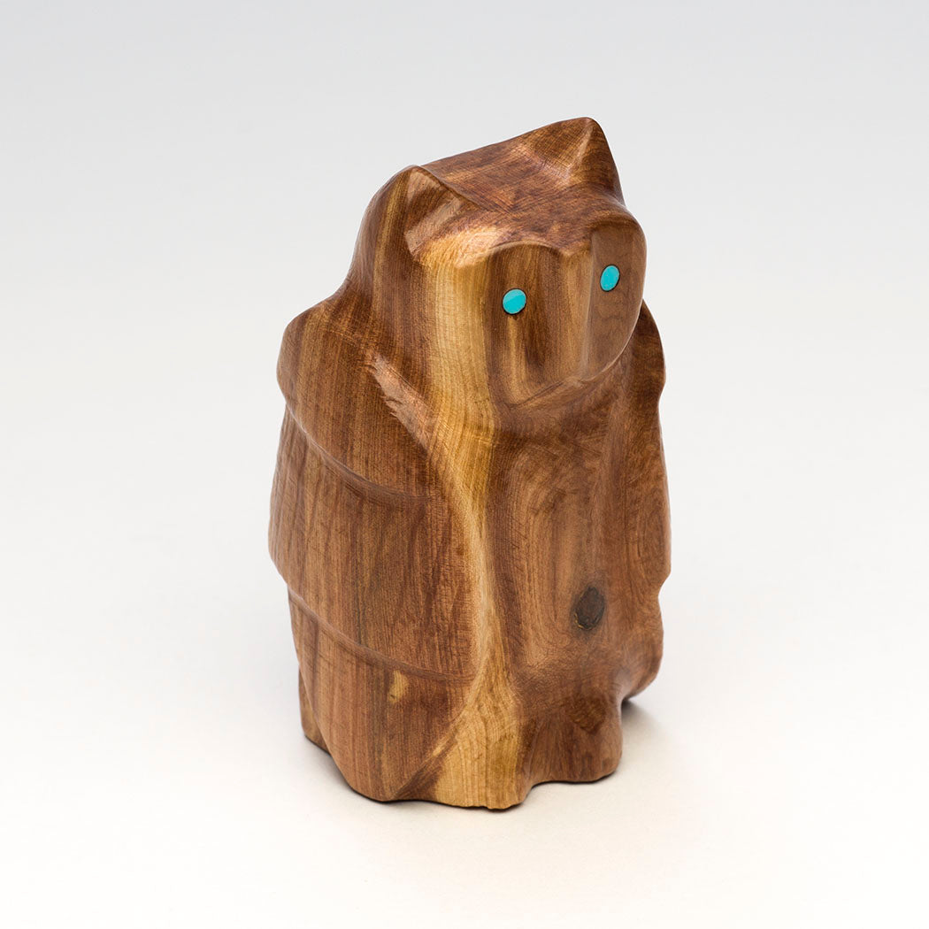Owl medicine is about gaining wisdom and discernment by changing the unknown into the known because an owl can see what others do not. Herbert Halate's lightly fragrant cedar Owl figures things out through sky blue turquoise eyes. The wood's natural grains give a wonderful aged feel. This raptor's posture conveys discernment, it will be a good friend. About 3 1/4" tall, 1 3/4" wide and 1 5/8" deep.