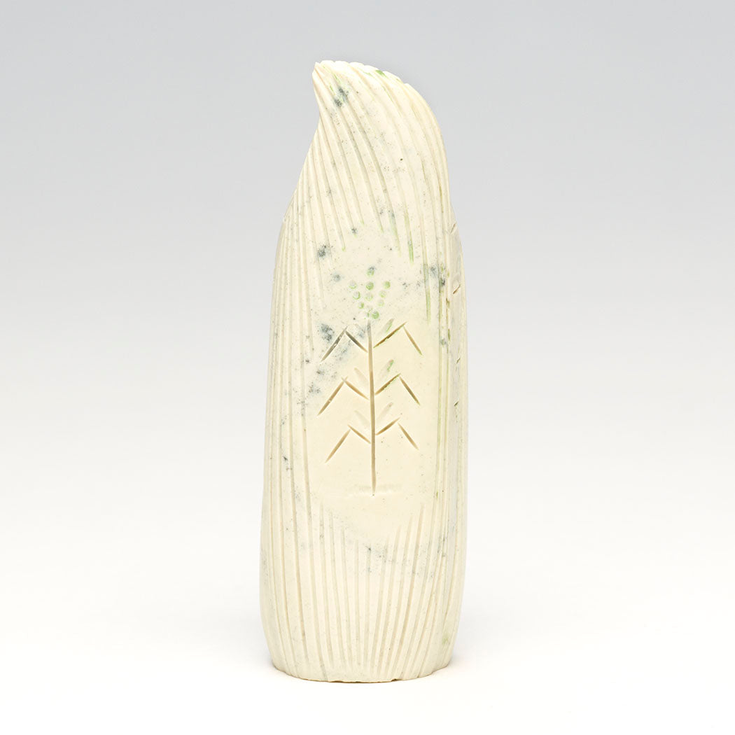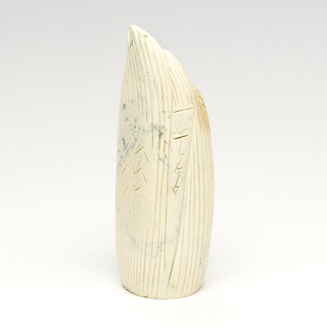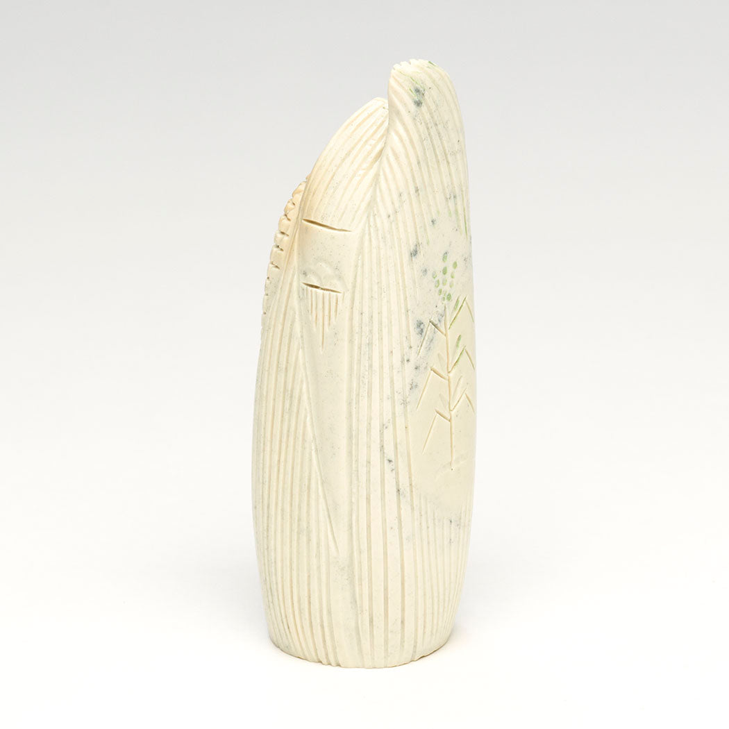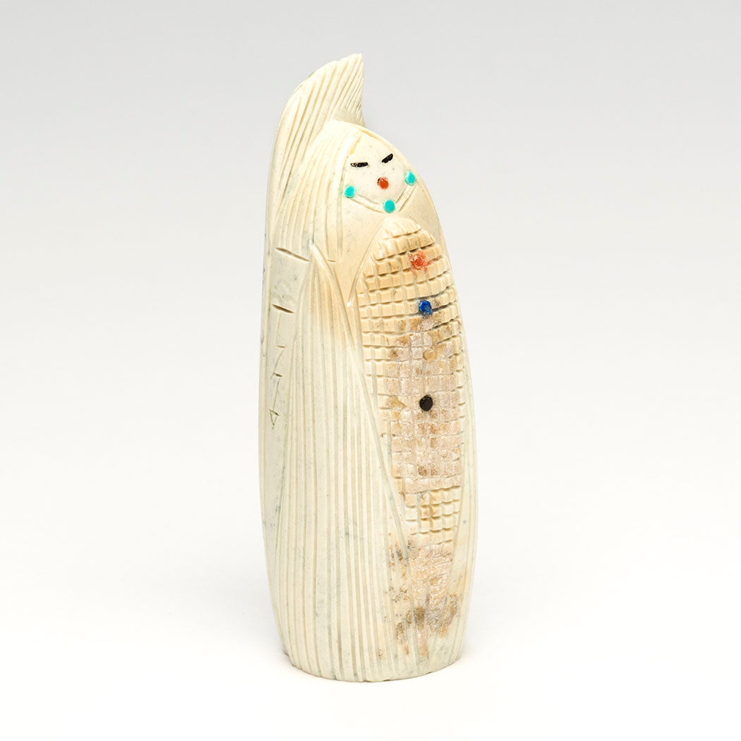 Vivella Cheama is an amazing carver in her own right. Her late husband noted artist Fabian Cheama was a leader behind a realistic and contemporary style of animal carving he started in the early 80's. Their son is carver Eli Cheama and son Adrin is also a wonderful jeweler. Vivella's devotion to detail is manifested in a strong Corn-Maiden sculpted from fish rock serpentine. Her corn body has red coral, lapis, onyx and jet inlays. Facial features are from jet paste and red coral. Three dots of turquoise adorn as well. Growing corn and raincloud elements are beautifully etched on this approximately 3 3/8" tall, 1 1/8" wide and 1 1/8" deep treasure.