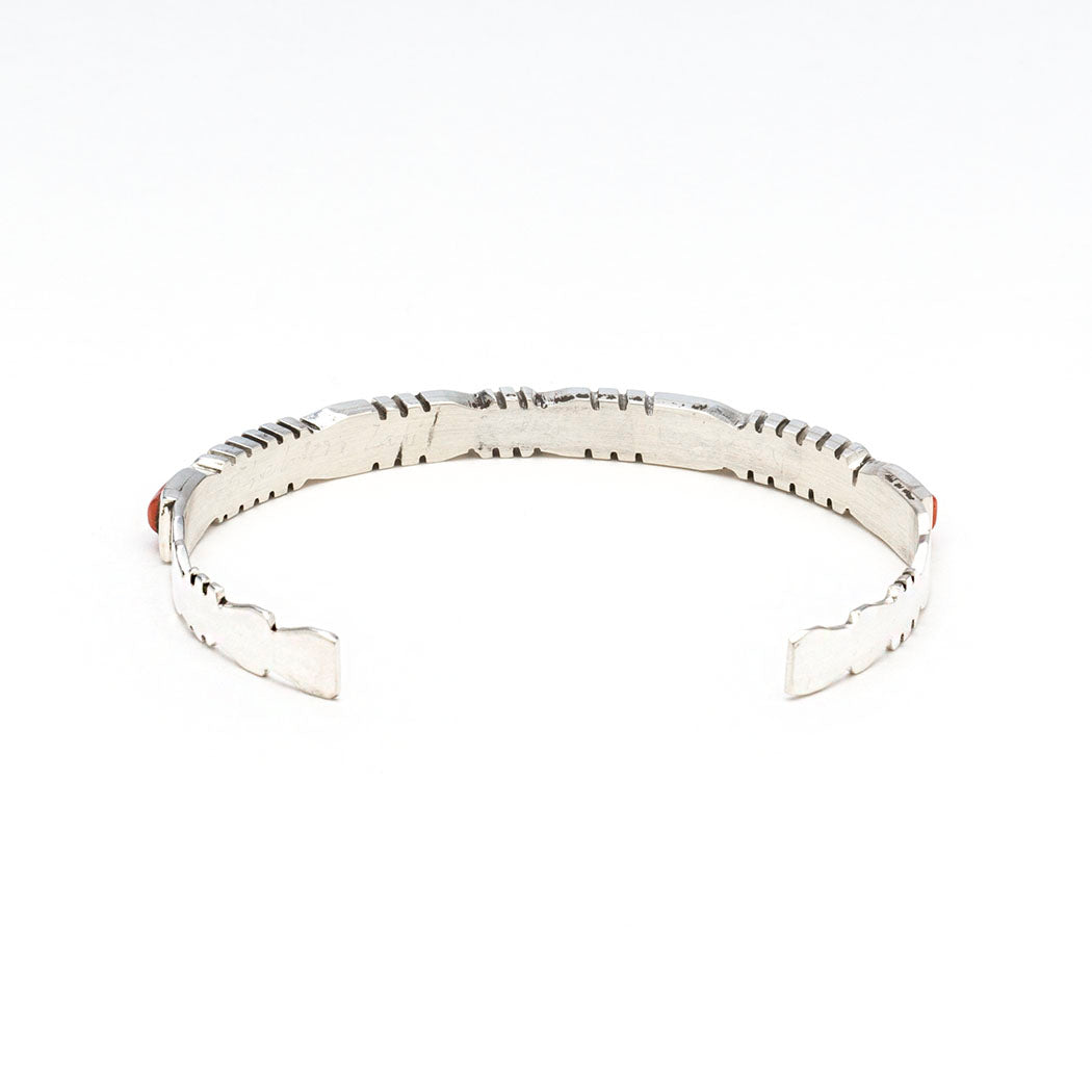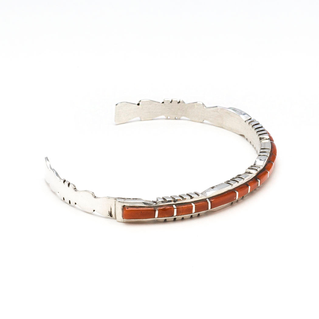 A stunning sterling silver single row cuff bracelet by Sheldon Lalio is fashioned in the channel inlay technique, where silver channels rest meticulously between stone or shell, or in this case bright red coral. The gorgeous cuff's entire inner circumference is about 6 1/2" which includes the opening of approximately 1 3/8". The bracelet's width is a flattering 1/4". Signed by the artist. Please click here for help in determining wrist size and best fit.
