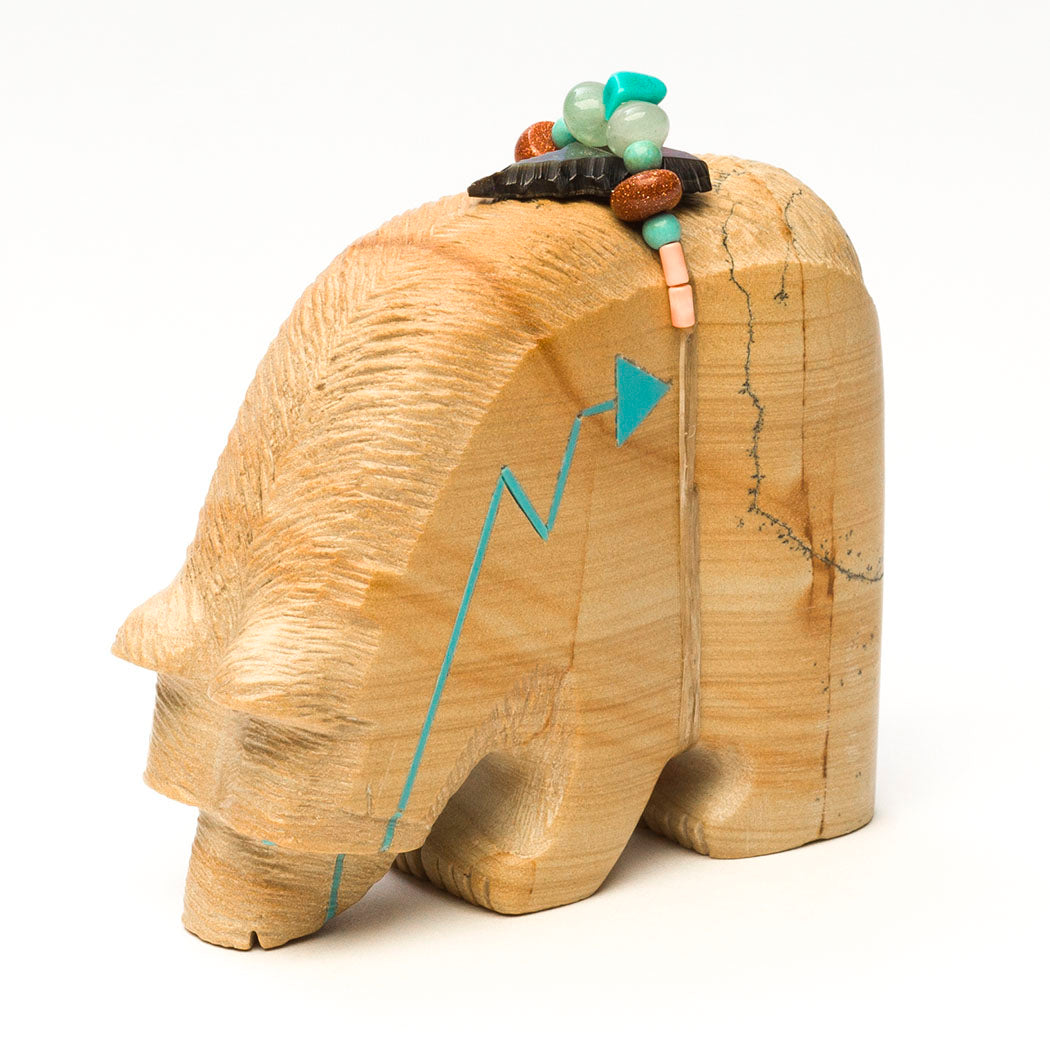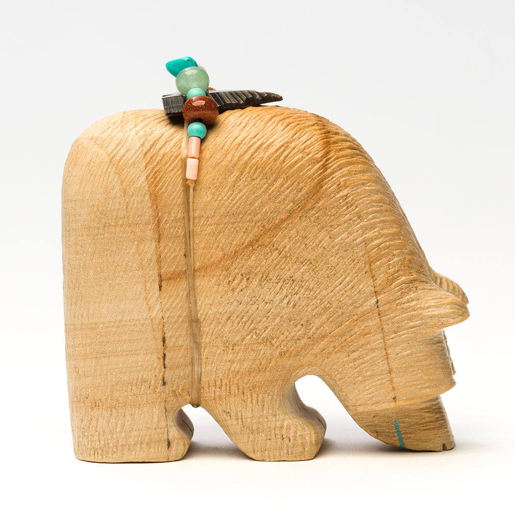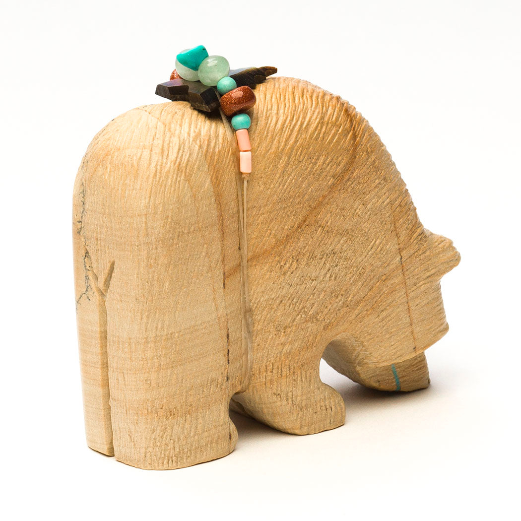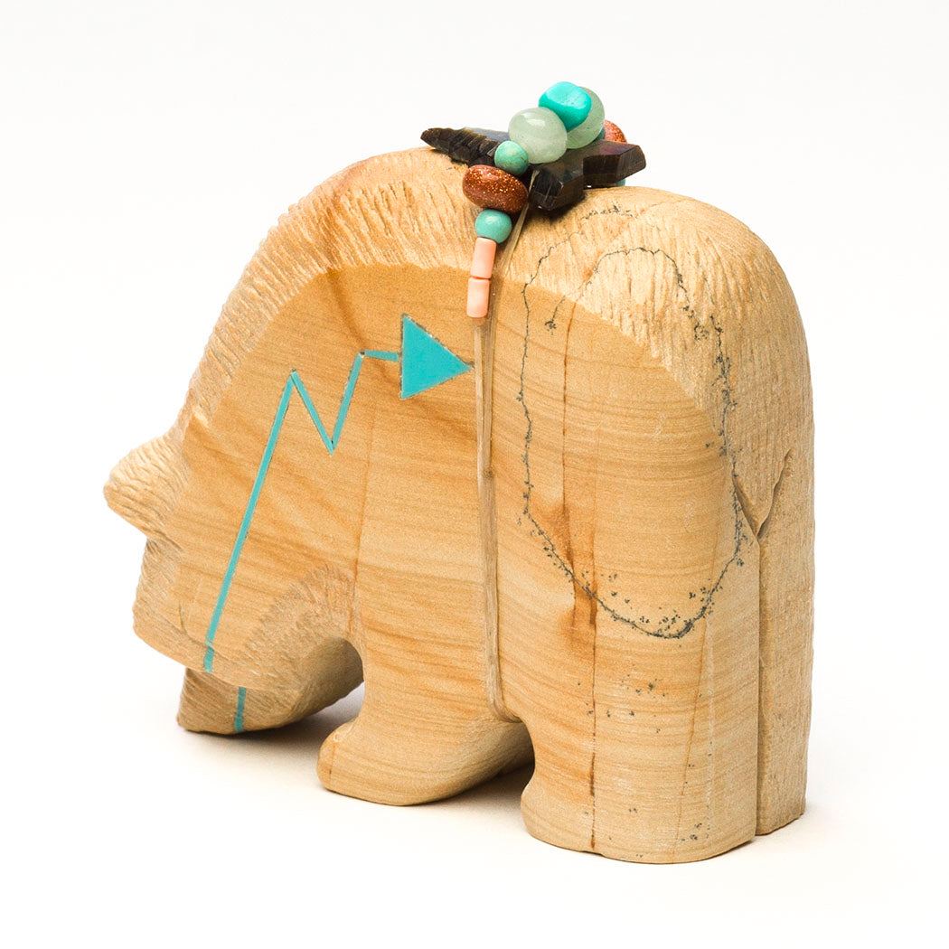 Douglas Martza's "Spirit Within Bear" is a collectible treasure sculpted with love and attention to detail from picture jasper. One side is etched with fur while the reverse side is smoother forming a smaller shaped Bear. Turquoise eyes are set to a gentle face. An alternating heartline or breath path is from meticulously inlaid turquoise. A black lip shell point with beautiful iridescence is accompanied by turquoise, melon shell, chlorite and sparkle brown goldstone beads which compose the offering bundle. This is a gift from the artist thanking a bear for how it lives in nature with strength, healing and power inspiring our own inner bear. About 2 5/8" long, 1" wide and 2 5/8" tall.