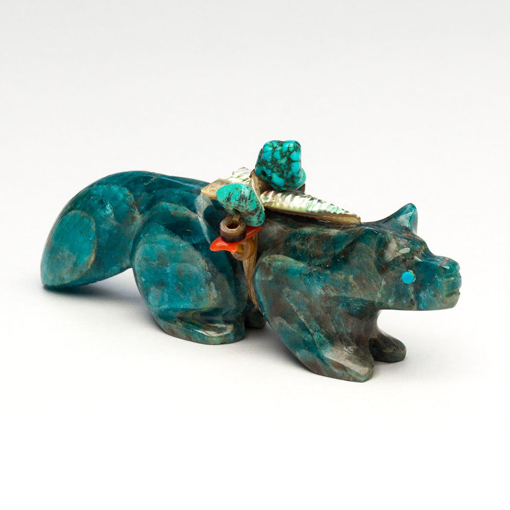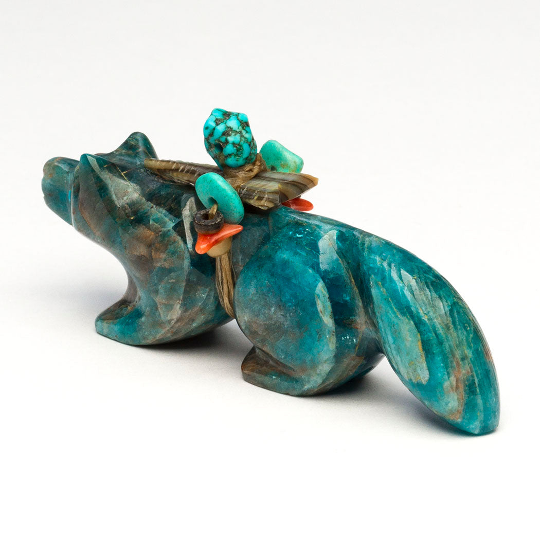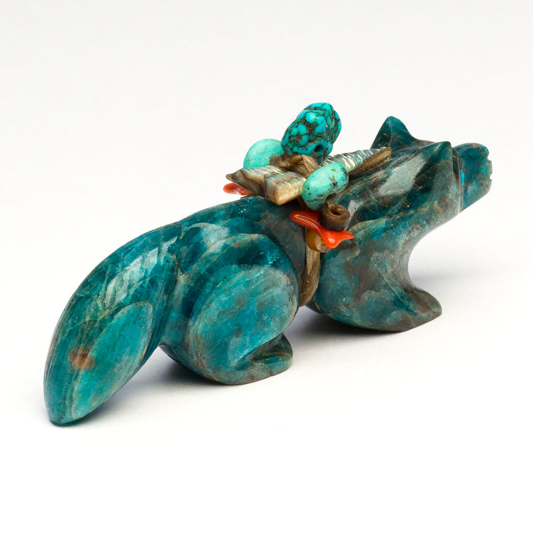 European colonizers brought the idea that wolves are deceitful and sinister. Beneficial wolves have been portrayed as villains in fairy tales, movies and even pharmaceutical television commercials. You can defend wolves by supporting legislation that aims to enhance protections for them. They are vital in keeping ecosystems functioning properly. For the A:Shiwi (The People) wolves are respected for their spiritual significance and are a revered animal within a Six-Direction grouping, associated with strong hunting powers. Rosella and Loubert Soseeah's colorful Wolf (Fox or Coyote) has been sculpted from apatite and inlaid with turquoise eyes. An iridescent abalone point, turquoise, red coral and shell bead offering is a gift of gratitude for important wolves. About 2 1/4" long, 3/4" wide and 1 1/8" tall.