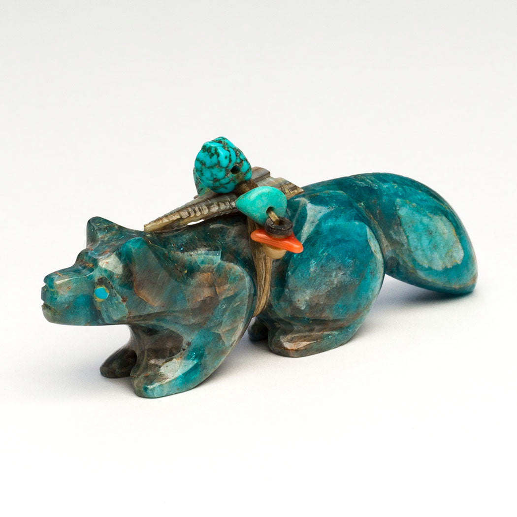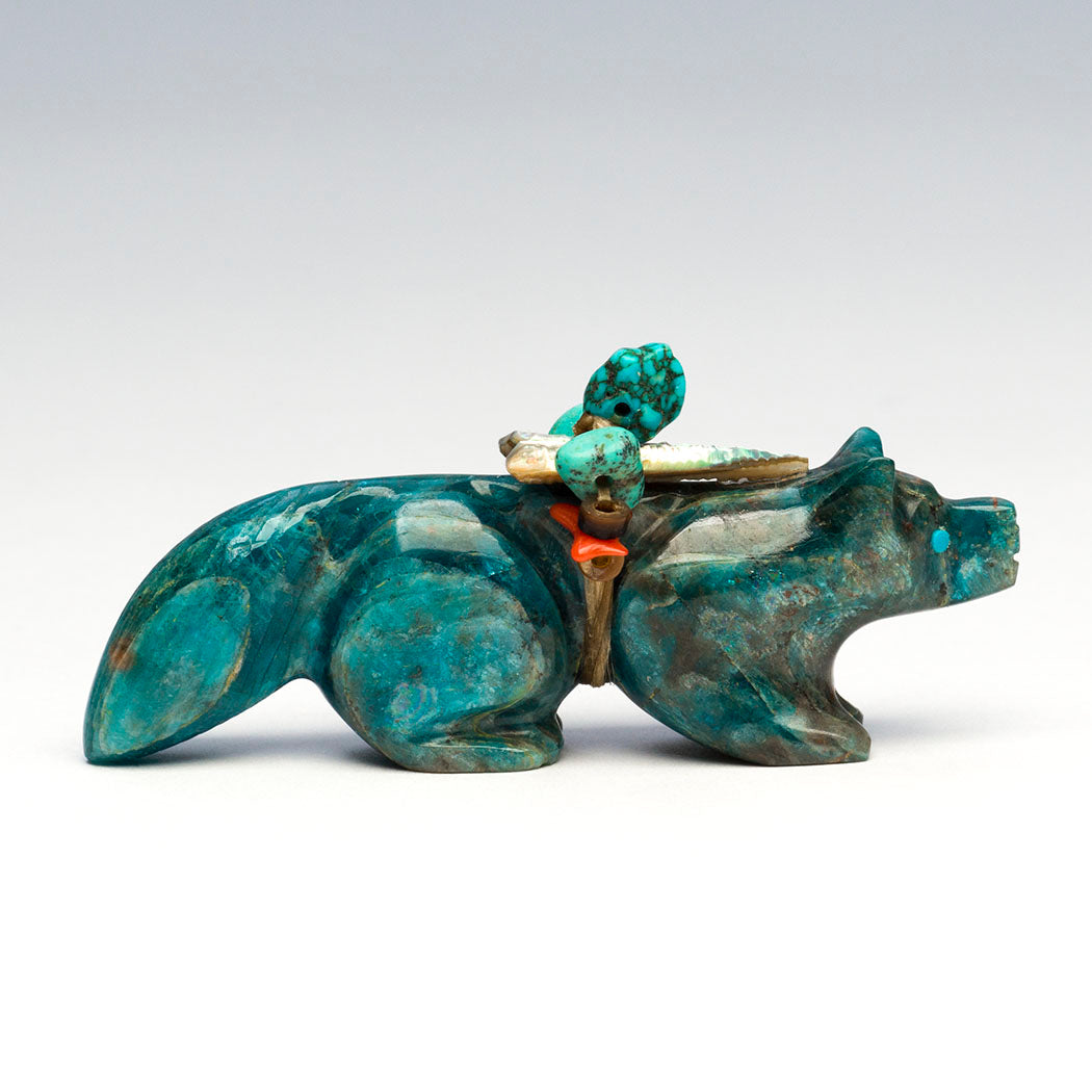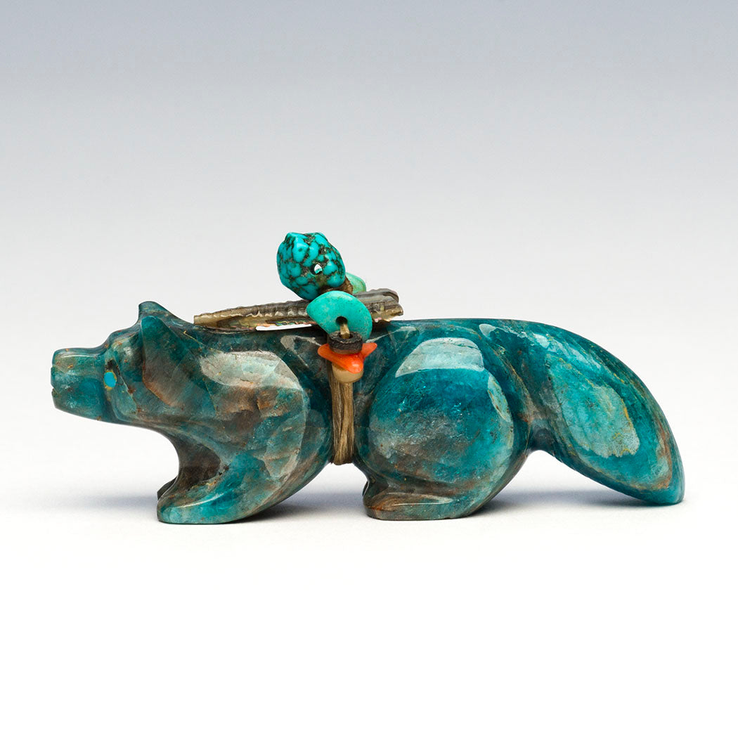 European colonizers brought the idea that wolves are deceitful and sinister. Beneficial wolves have been portrayed as villains in fairy tales, movies and even pharmaceutical television commercials. You can defend wolves by supporting legislation that aims to enhance protections for them. They are vital in keeping ecosystems functioning properly. For the A:Shiwi (The People) wolves are respected for their spiritual significance and are a revered animal within a Six-Direction grouping, associated with strong hunting powers. Rosella and Loubert Soseeah's colorful Wolf (Fox or Coyote) has been sculpted from apatite and inlaid with turquoise eyes. An iridescent abalone point, turquoise, red coral and shell bead offering is a gift of gratitude for important wolves. About 2 1/4" long, 3/4" wide and 1 1/8" tall.