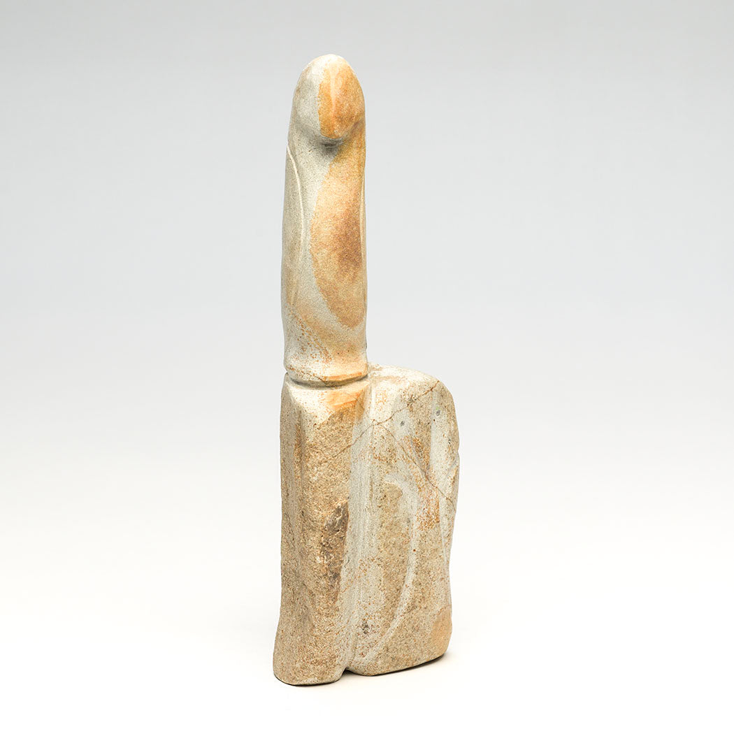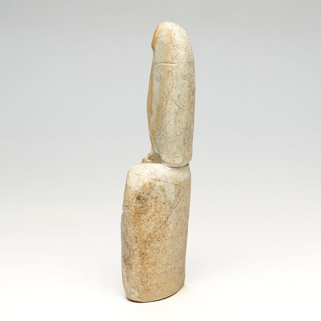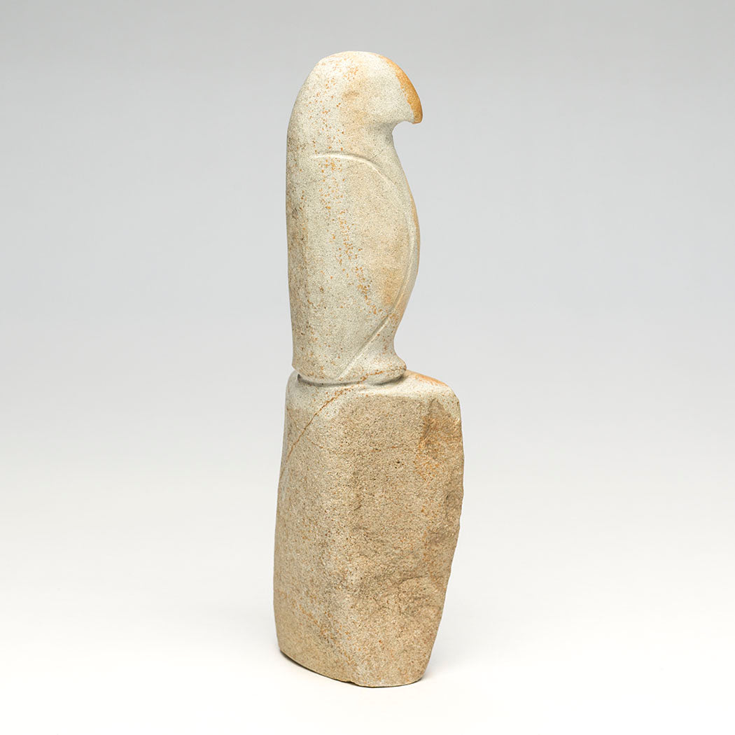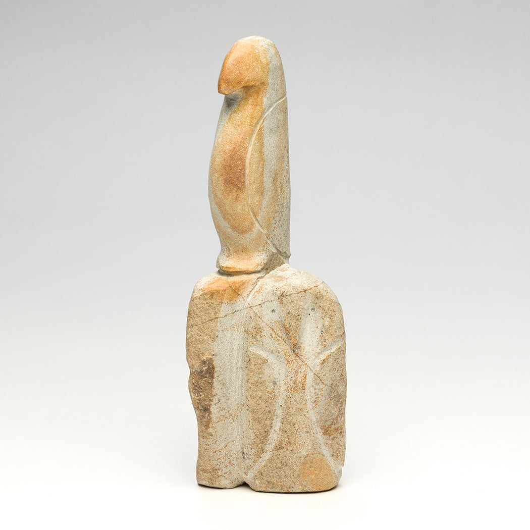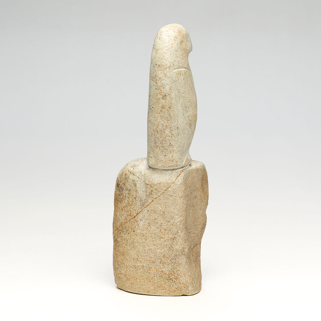 An invisible Owl cloaks cliffside as a hooked-beak Eagle or Hawk perches above. Animal crypsis is a remarkable ability to blend into surroundings using cryptic coloration. Creatively sculpted from one found stone by carving great Salvador Romero, the raptor's together measure about 8 3/4" tall, 2 3/4" wide and 1 1/2" deep. The owl's alert eyes are etched and filled with graphite.