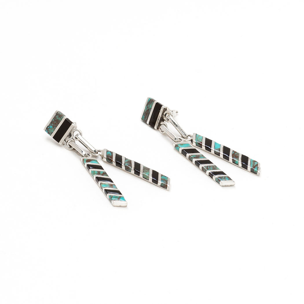 Master Zuni jeweler Shawn Sheyka pushes the boundaries of traditional channel inlay design with an avant-garde pair of sterling silver, Egyptian turquoise and jet earrings. The stunning chevron pattern enhances the enduring beauty of the Egyptian turquoise which is still mined from the same deposits utilized by Egyptian god-kings. Its connection to the ancient Pharaohs makes it a truly special variety of turquoise. For pierced ears, these lightweight earrings showcase Shawn's cleverness in construction and creative vision. About 2" long and 3/8" wide. Signed by the artist.