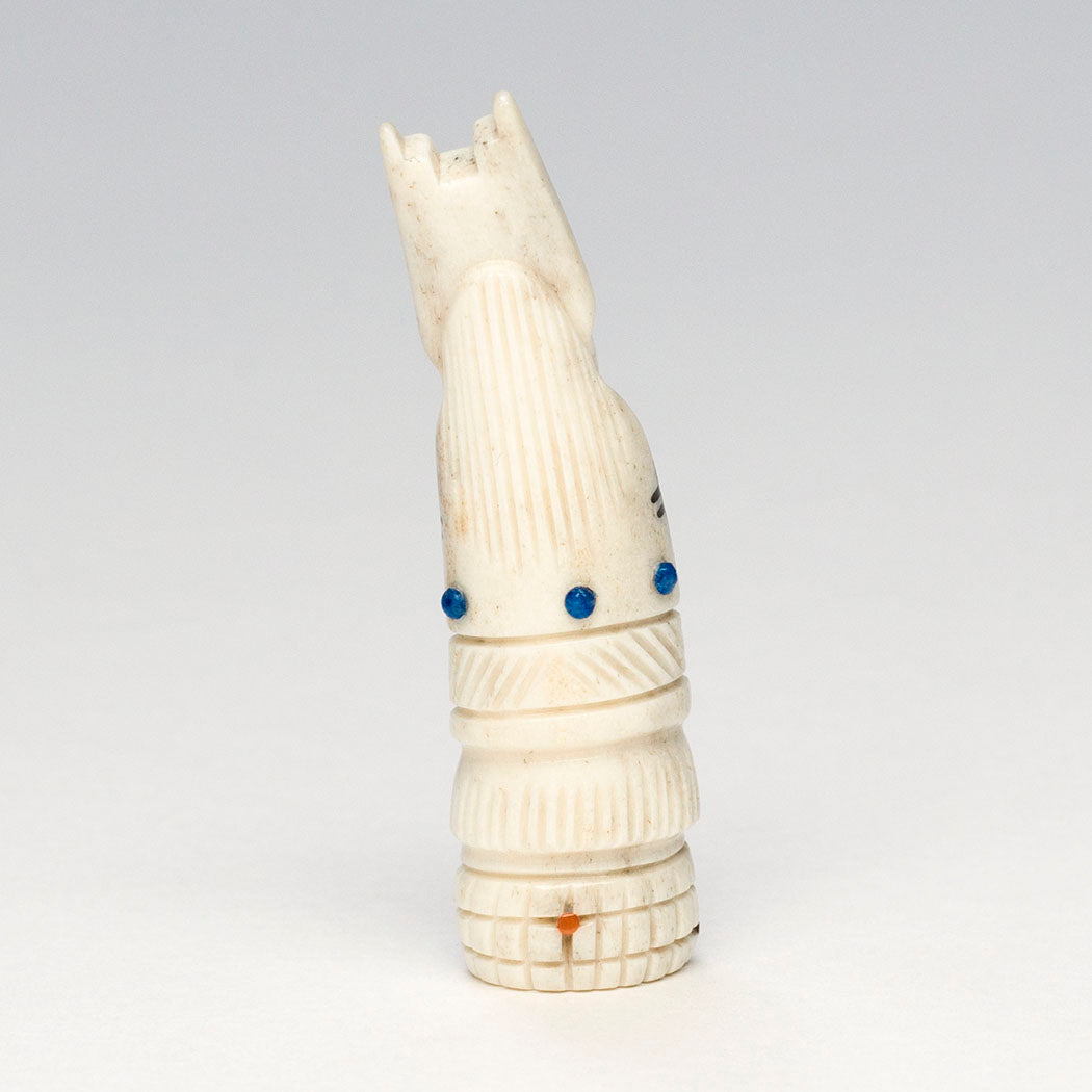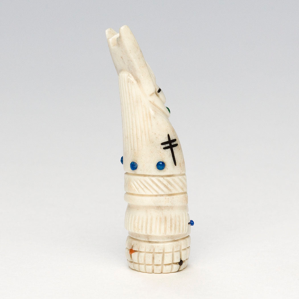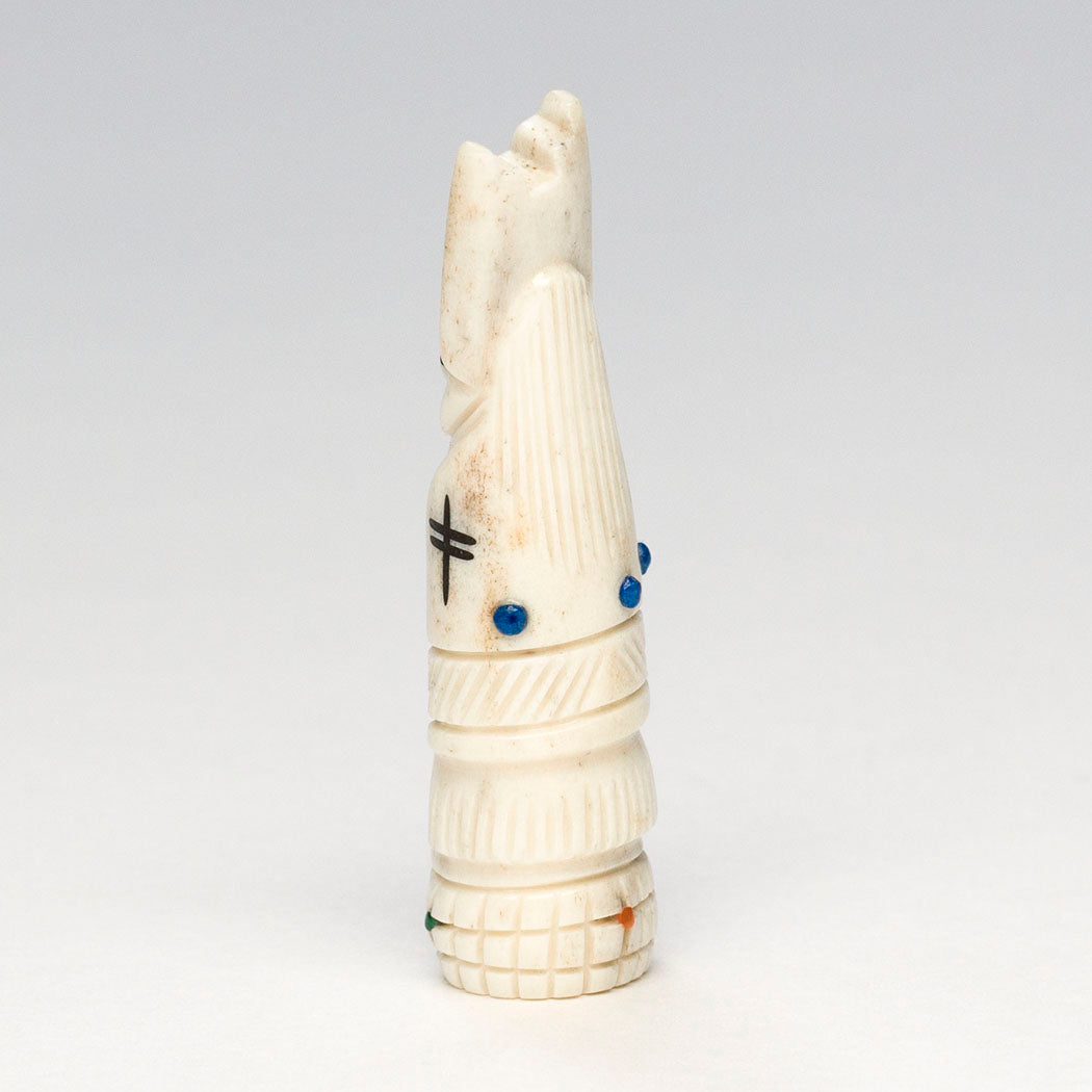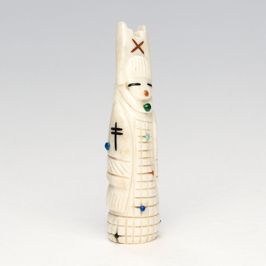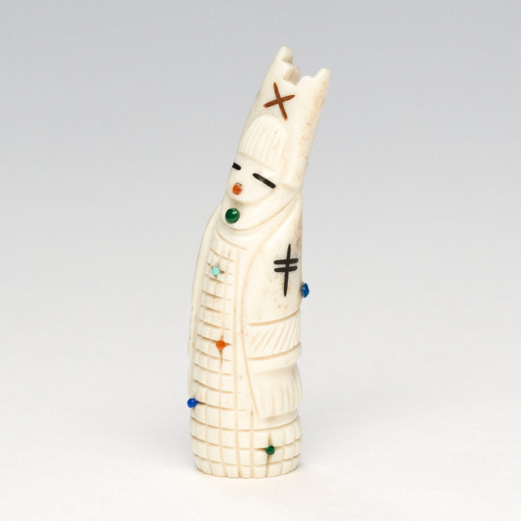 Tablita Corn Maiden dons a traditional headdress that's accented with pipestone paste as she gives thanks for the agricultural cycles and other blessings. Bodily Corn kernels are incised and decorated with a bounty of colorful coral, lapis lazuli, malachite, turquoise and pen shell pieces. A spirit of discernment and voice of wisdom is felt from jet paste eyes and a red coral inlay. Beautiful long incised hair imparts strength. About 1 3/4" tall, 1/2" wide and 5/8" deep, sculpted from antler by Troy Sice.