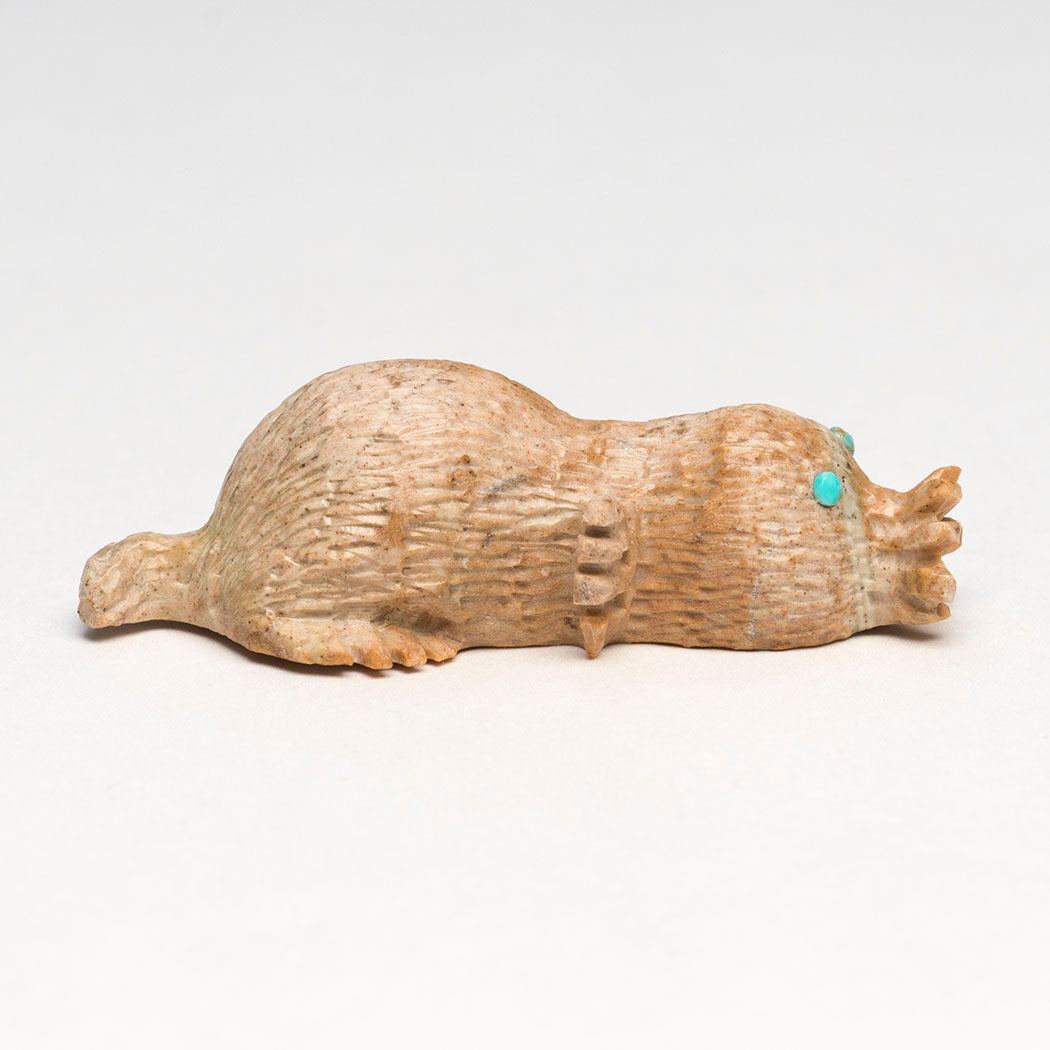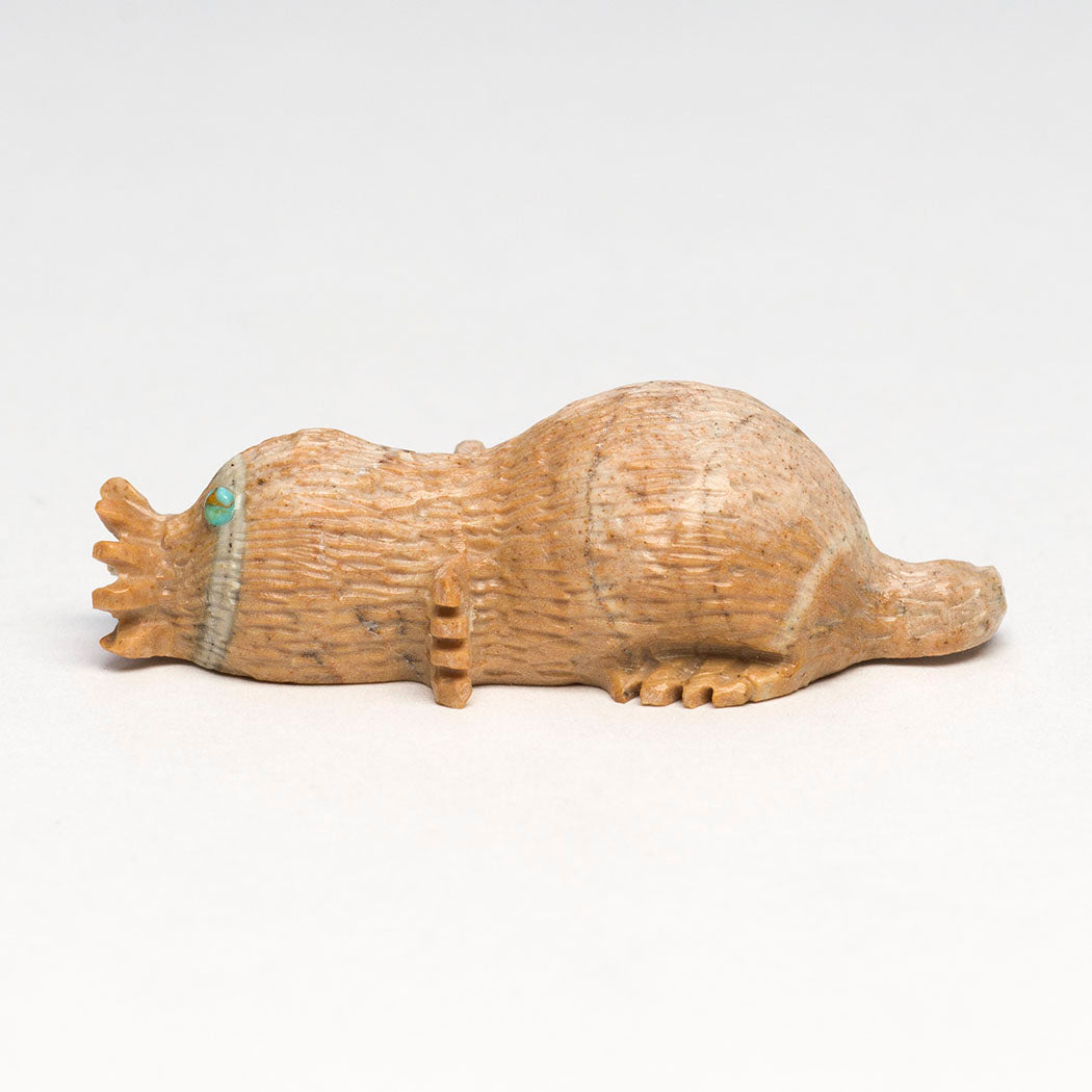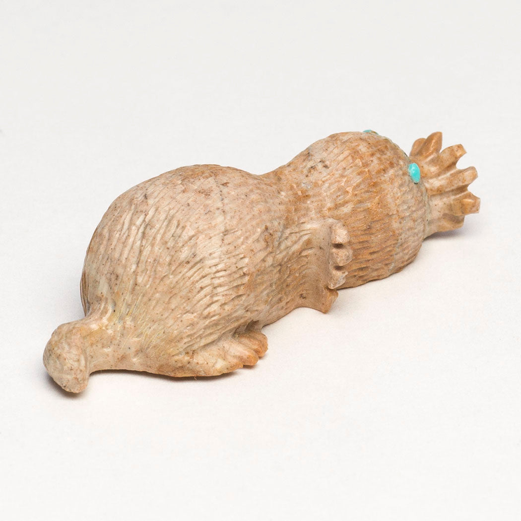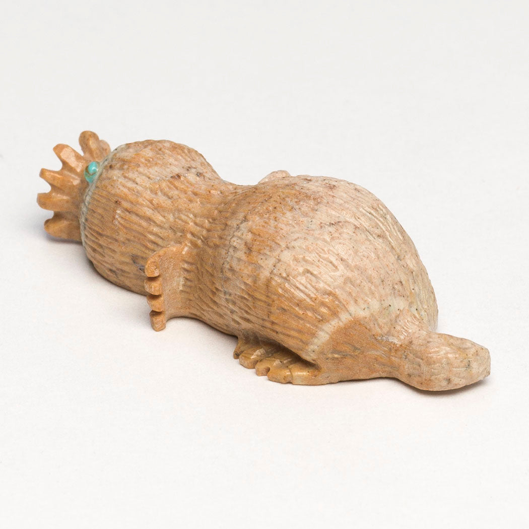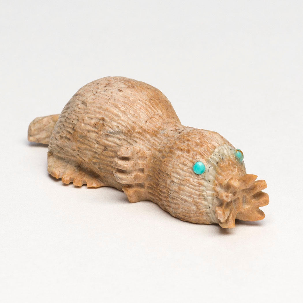 The star-nosed Mole is beloved for a stunning tentacled nose. It's a skilled swimmer and little carnivore with large front paws. The unique nose may detect electrical signals from prey, a special mammalian trait shared with the fascinating platypus. Bernie Laselute's Picasso marble star-nosed mole has wonderful tentacles or rays. Eyes are from turquoise inlays, one of which has a gorgeous natural golden matrix inclusion sort of shaped like a star. About 1 3/4" long, 5/8" wide and 1/2" tall.