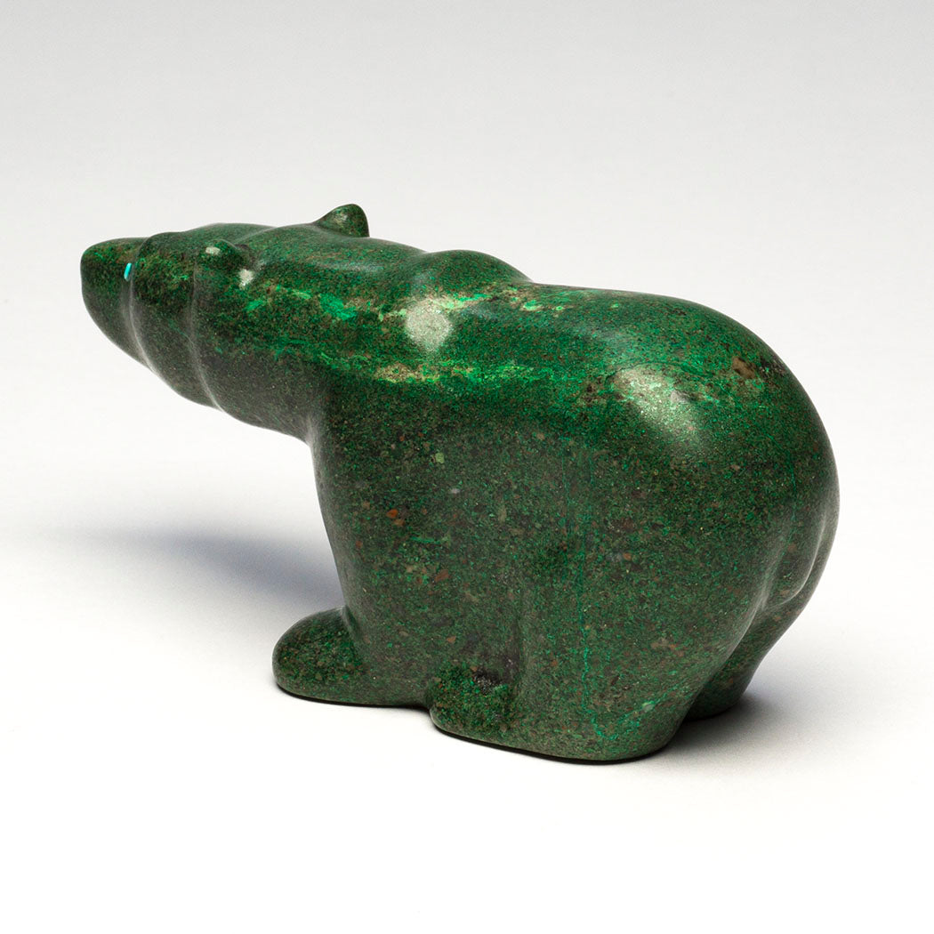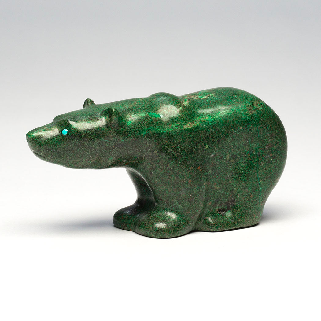Melvin Eriacho allows the mineral to guide the creation of a magnificent Bear. His unparalleled carving skills bring museum-quality animals to life with spirit and personality. He hikes Zuni country to find the best stones like this verdant found chrysocolla with malachite. Its sheer beauty and captivating green hues are healing to the soul. Eyes radiate a gentleness, from turquoise inlays. About 4 5/8" long, 1 5/8" wide and 2 3/8" tall.