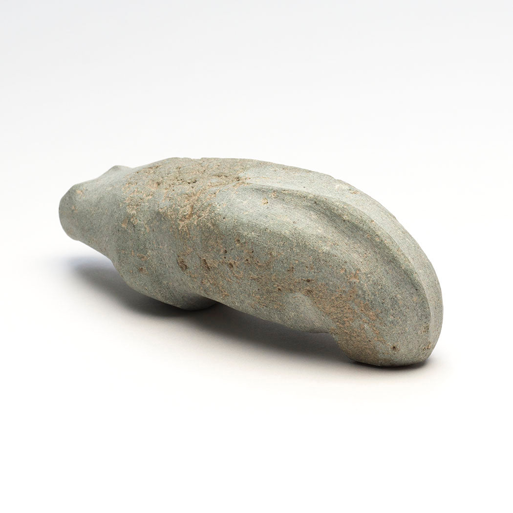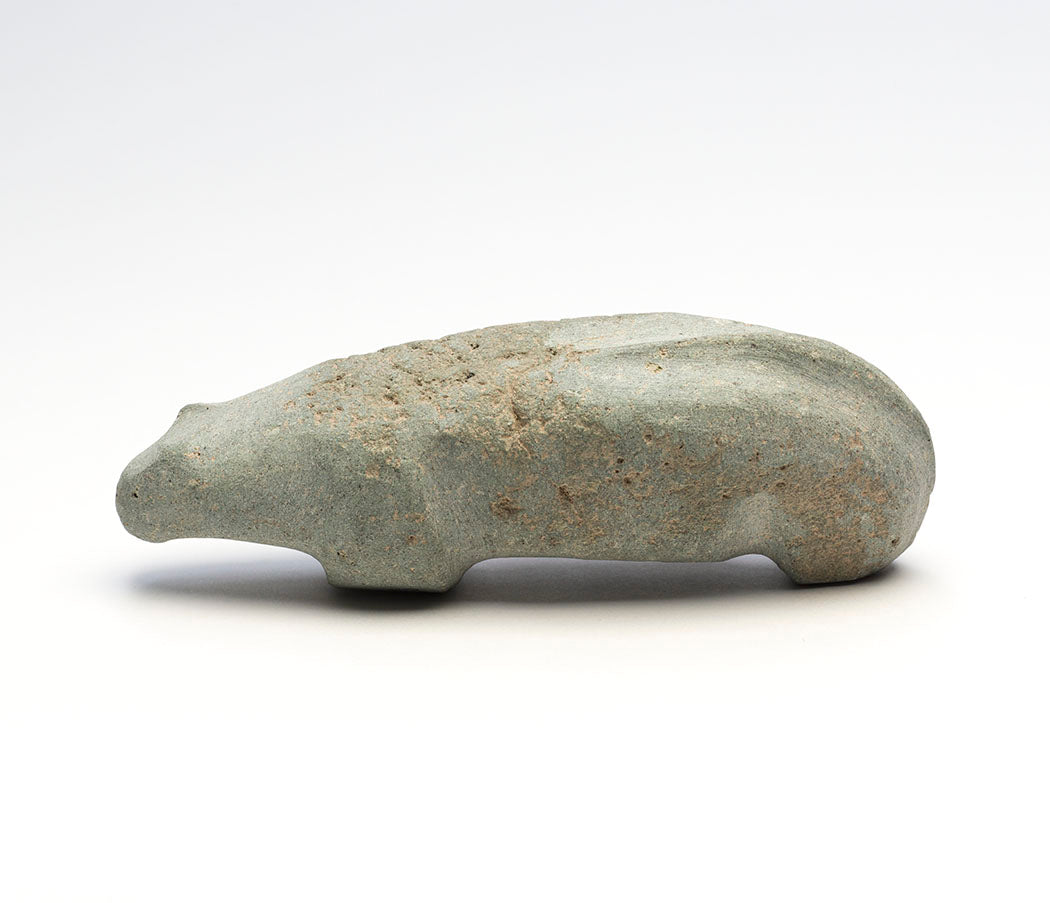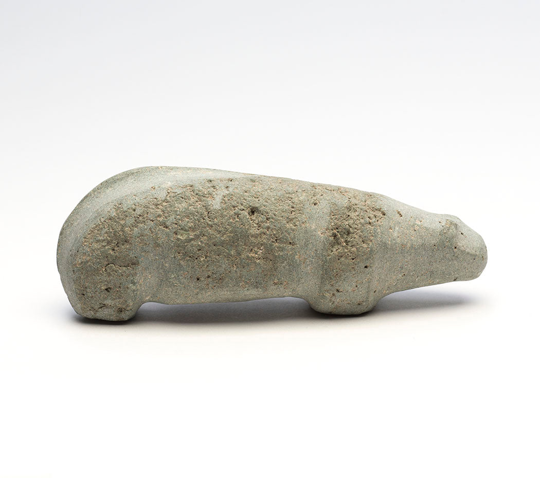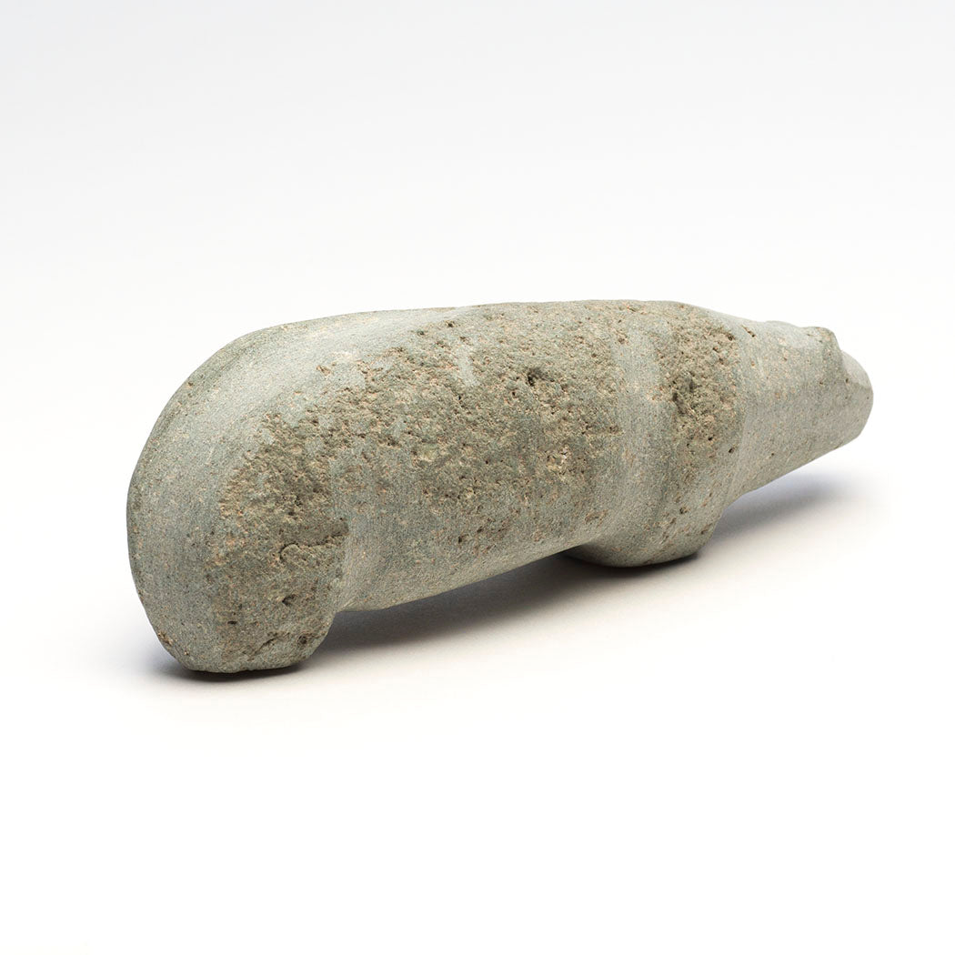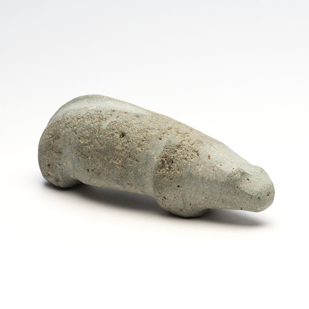 There is something satisfying about seeing and feeling the residual carving marks left by Wilson Romero on an old-style Mountain-lion (panther, puma or cougar) from found stone. They expose the layers of age and provide a tangible connection to the artist's hand. About 5 7/8" long, 1 7/8" wide and 1 7/8" tall.