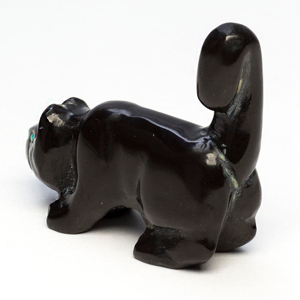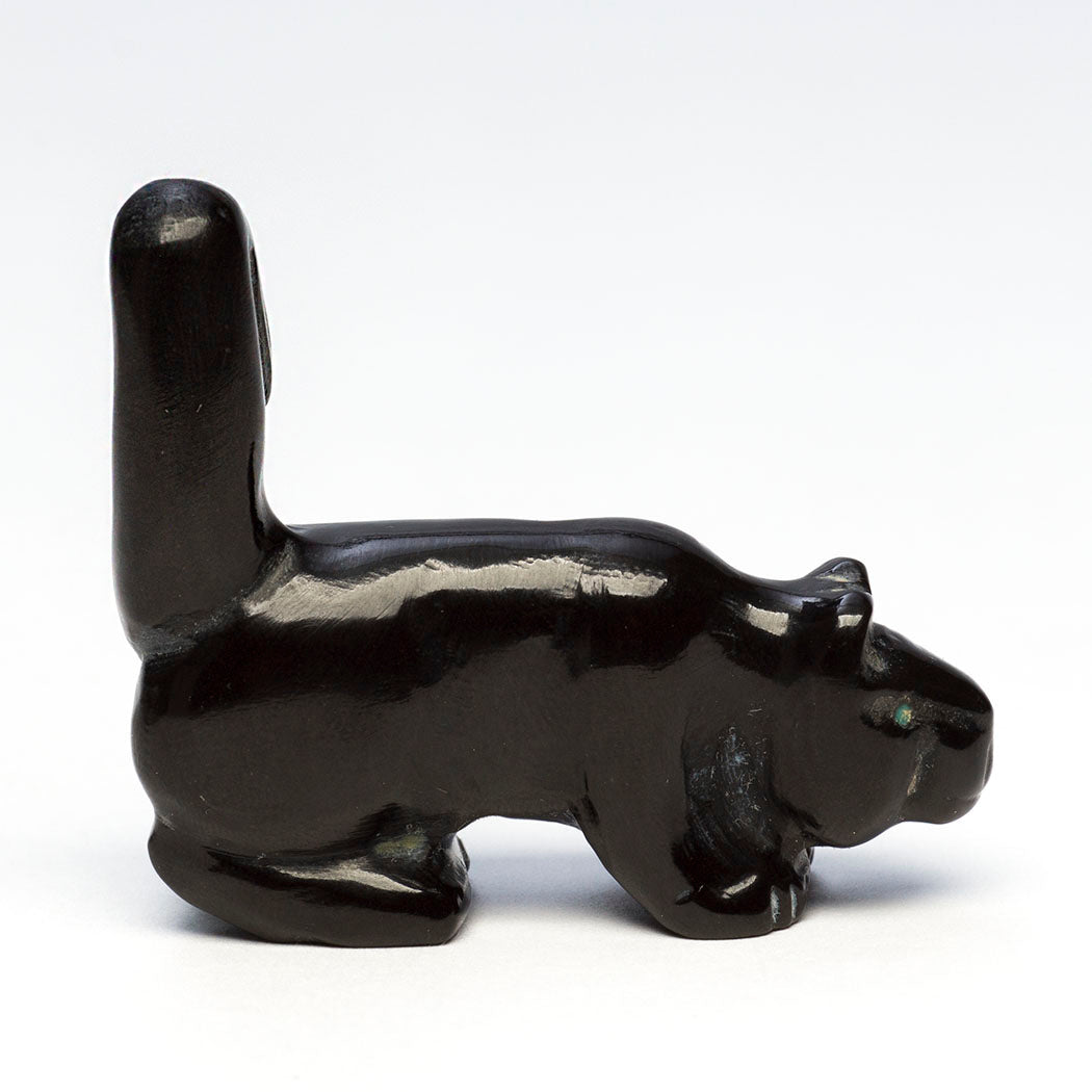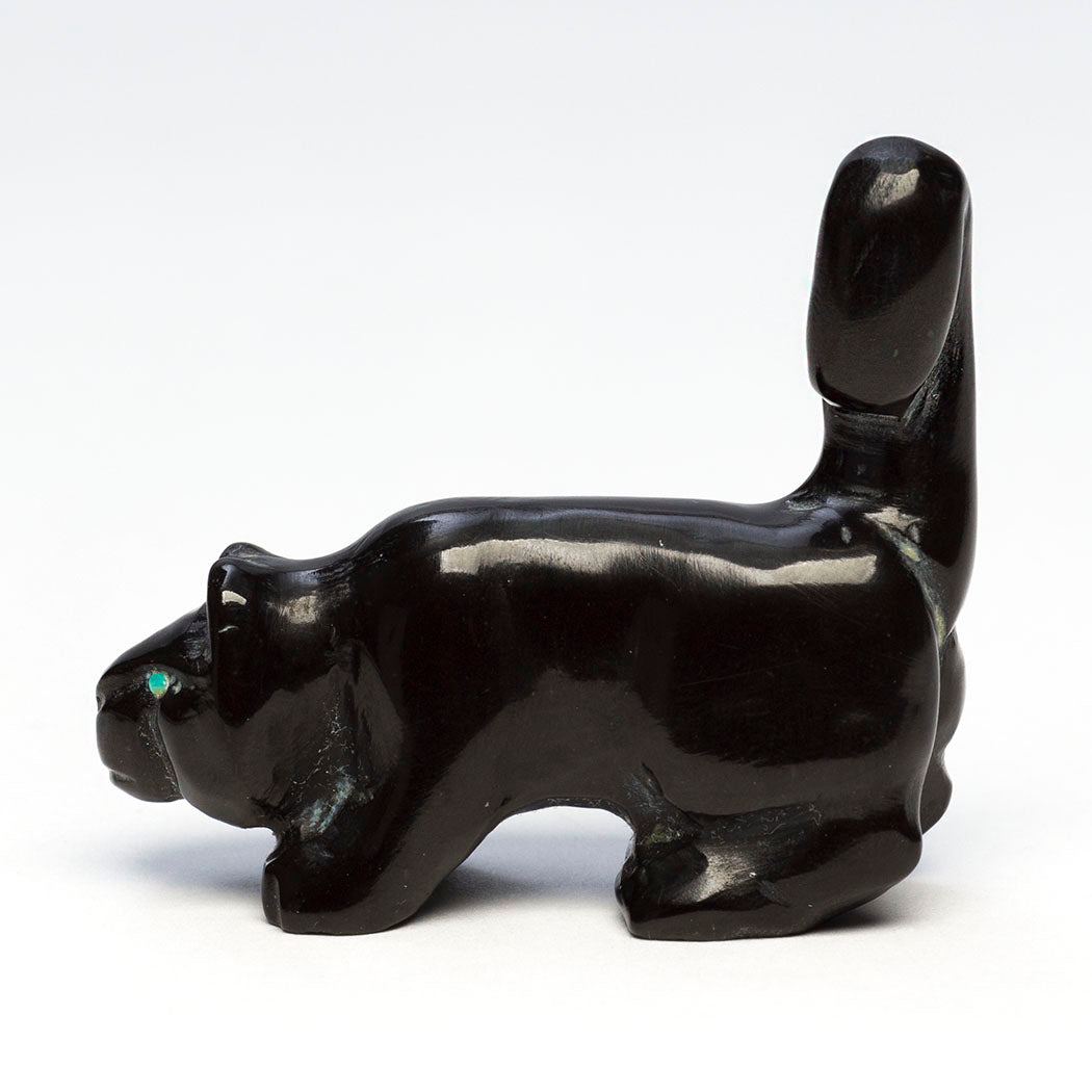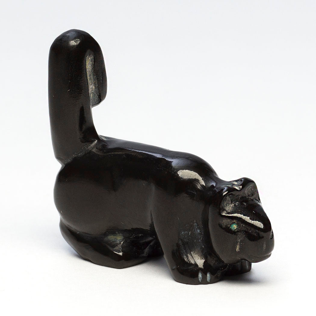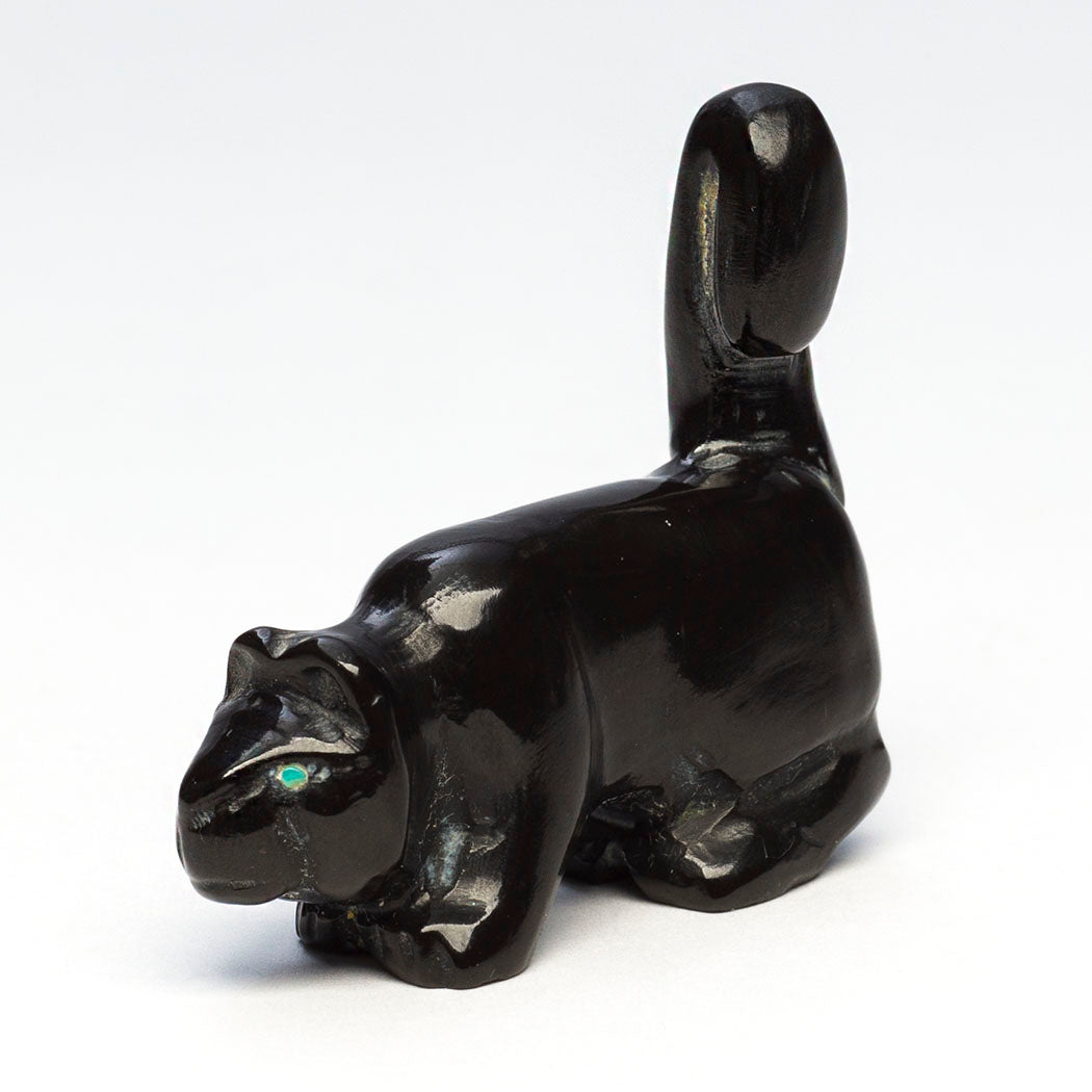 Mountain-lion, puma or cougar) with bright eyes from turquoise inlays is creatively sculpted from marble with an amazing tail on the alert. These magnificent cats are the top predators in dense rainforest homes helping keep other species in balance. They love water. About 1 3/4" long, 5/8" wide and 1 1/2" tall, carved by Bryston Bowannie.