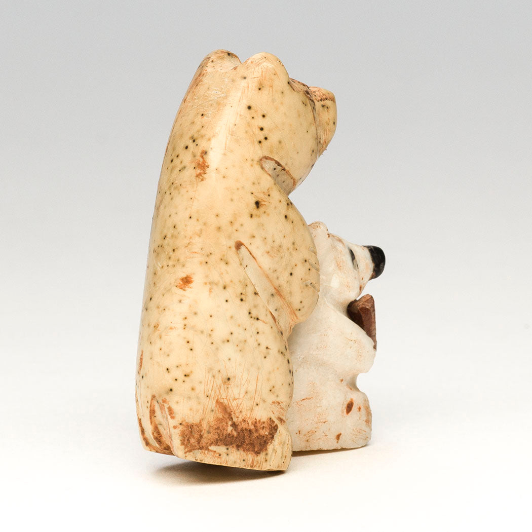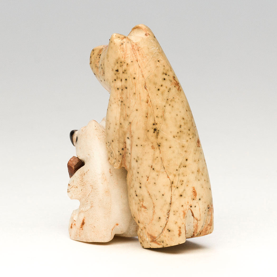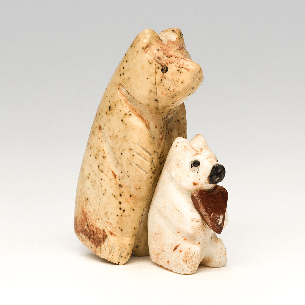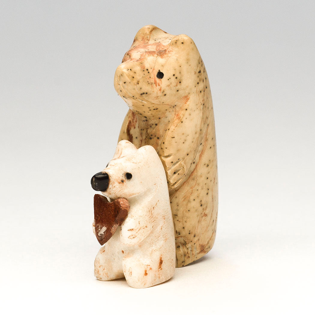 Justin Red Elk's Bears are full of love offering a little pipestone heart to you. They remind us that we are all interconnected and can promote a lifestyle that minimizes harm to Mother Earth and wildlife. The standing bears are carved from either fish rock serpentine or marble, each with endearing eyes from jet inlays. The little cub has a precious nose from jet. About 1 1/2" long, 3/4" wide and 2 1/8" tall.