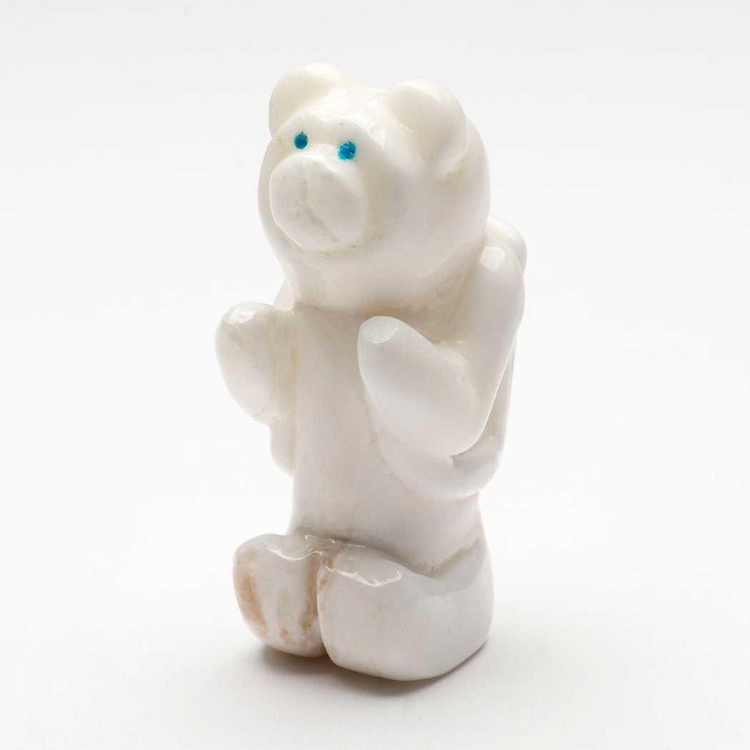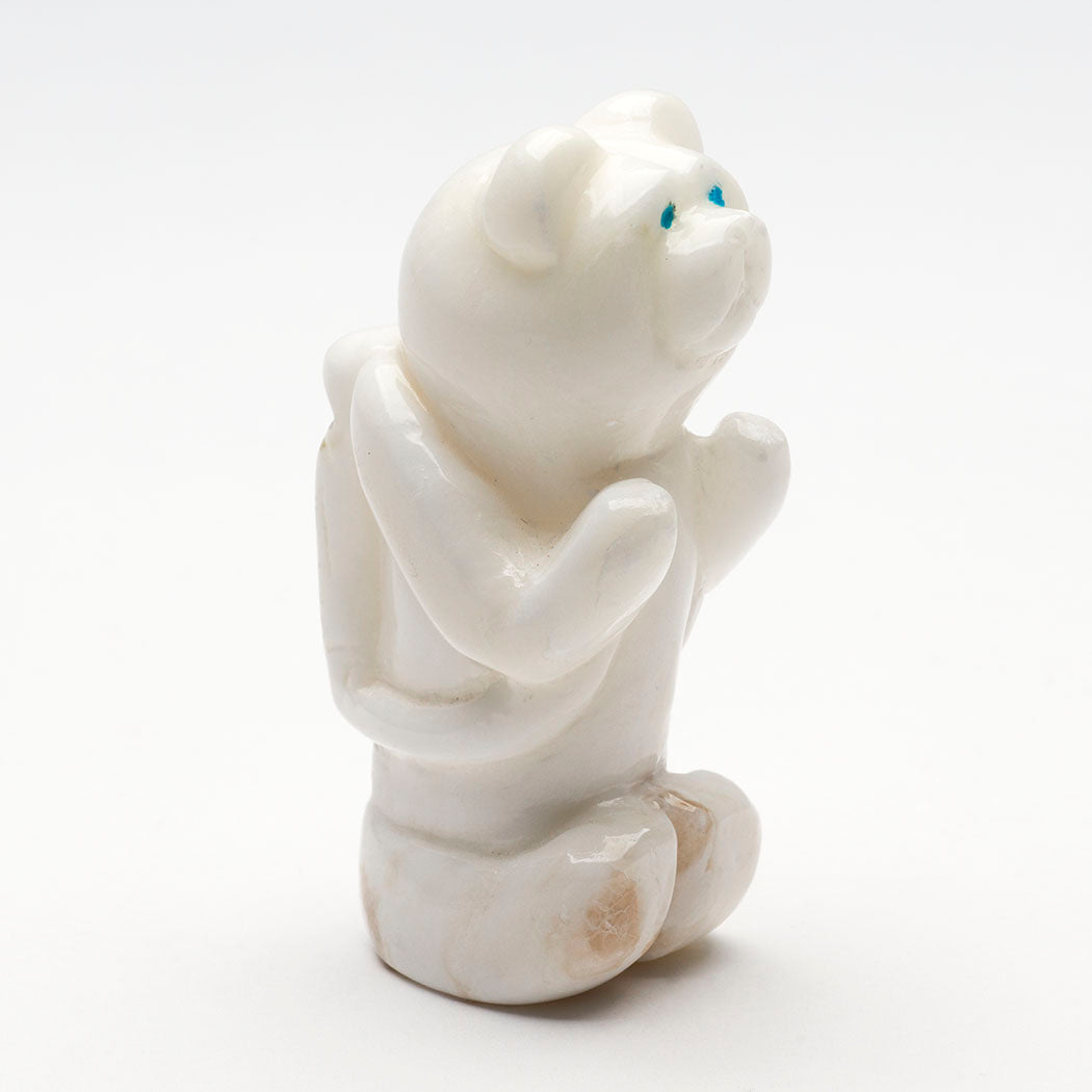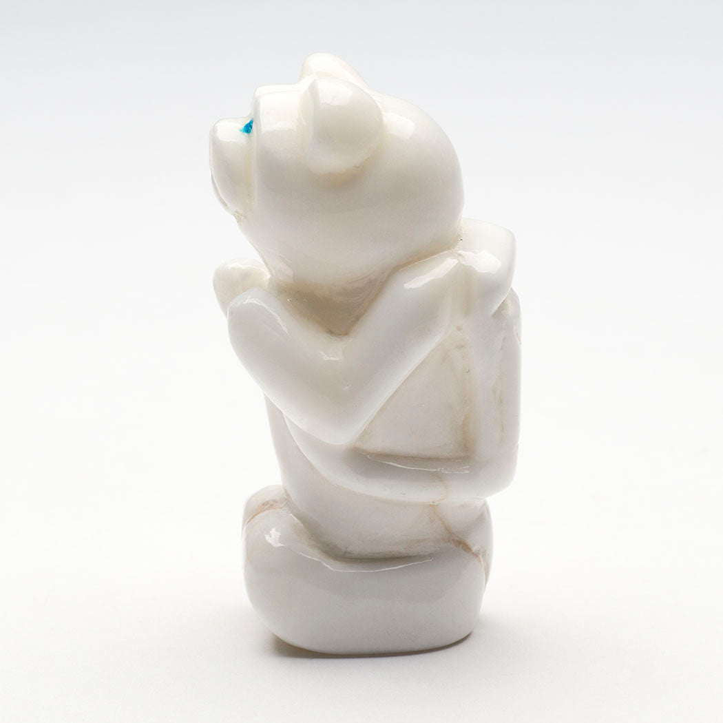 Austin Yatsattie's backpacking Bear (or polar bear) knows the perfect trails. Carved from marble, this friend sits upright at about 2 3/4" tall, 1 1/4" wide and 1 1/2" deep. Charming eyes from twinkling cultured opal inlays enjoy all the forest has to offer. The little sculpted backpack is super sweet.