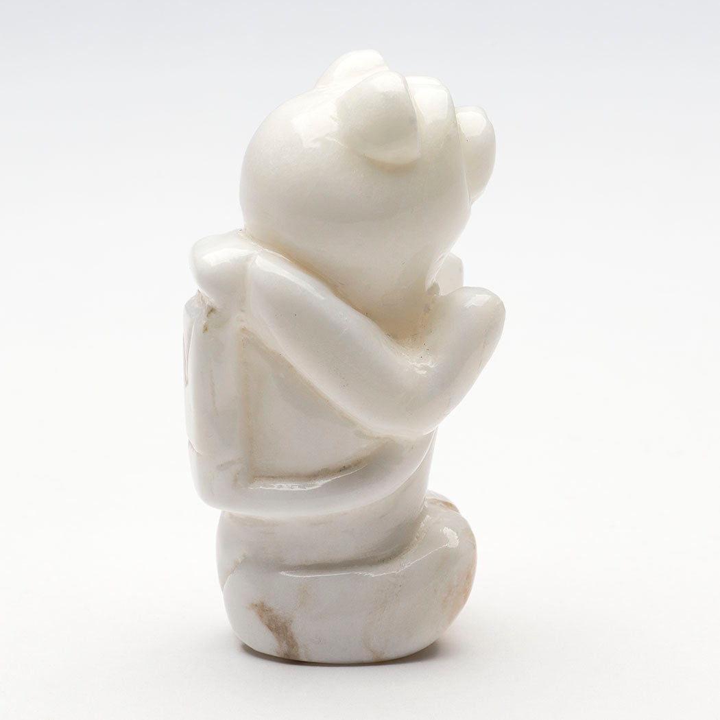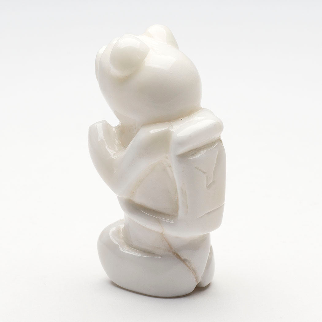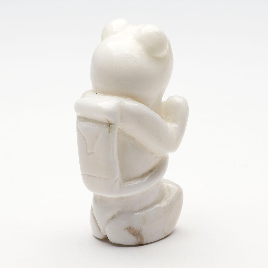 Austin Yatsattie's backpacking Bear (or polar bear) knows the perfect trails. Carved from marble, this friend sits upright at about 2 3/4" tall, 1 1/4" wide and 1 1/2" deep. Charming eyes from twinkling cultured opal inlays enjoy all the forest has to offer. The little sculpted backpack is super sweet.