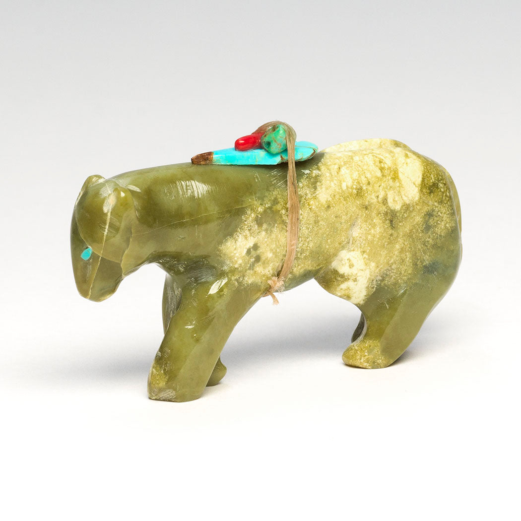 Zuni carver Jimmy Yawakia believes every stone has its own energy. His latest offering is a walking Mountain-lion (puma, panther or cougar) sculpted from a serpentine that simply calms the soul. When we are near mountain lion domain, it's best to make some noise like talking and such to help avoid surprising them. Nice eyes are from turquoise inlays and the measurements of this long-tailed feline are approximately 3" long, 1/2" wide and 1 3/4" tall.