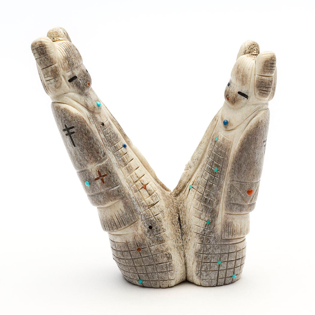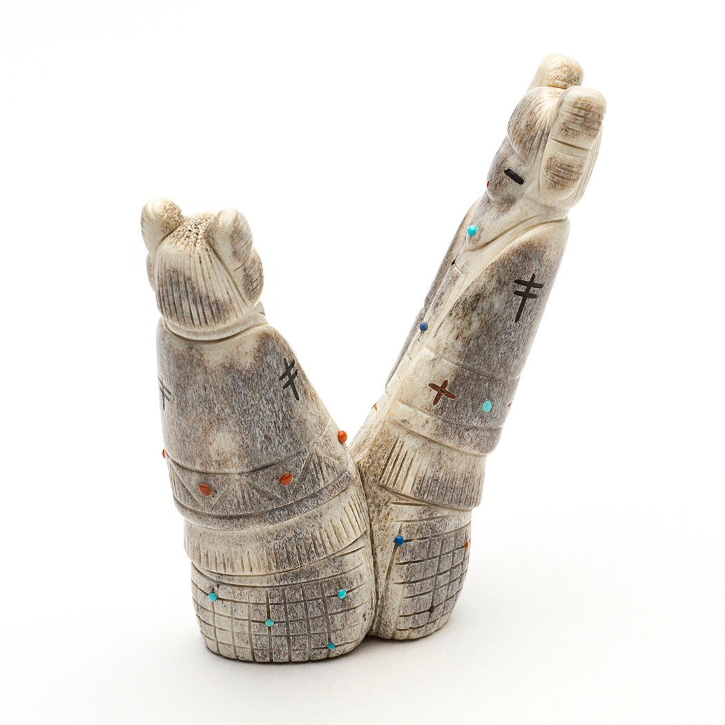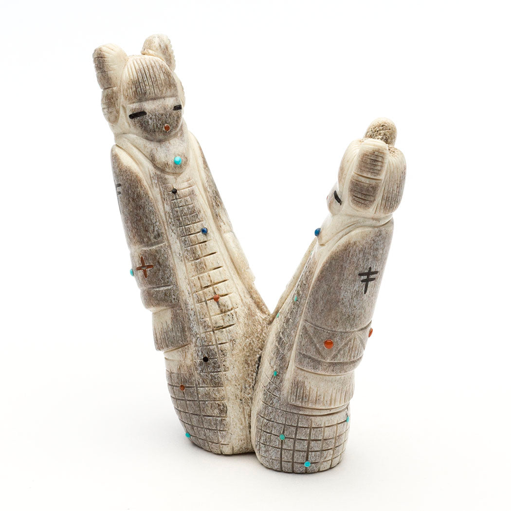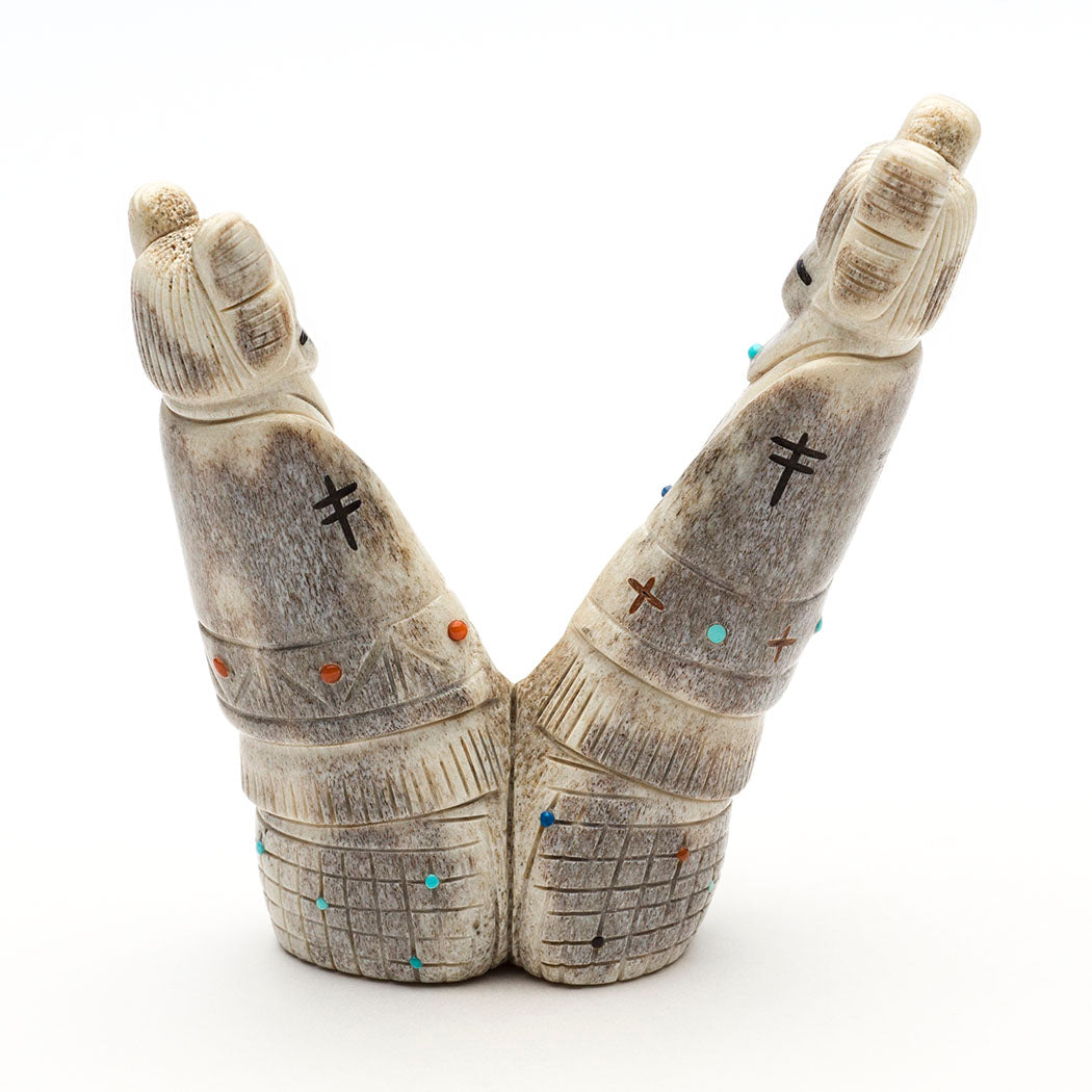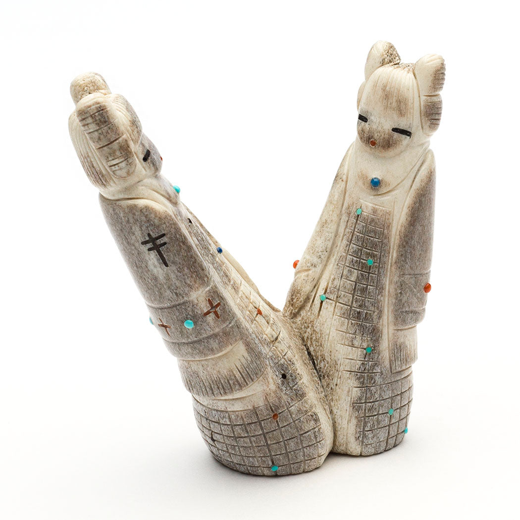 Corn-maiden sisters demonstrate genuine love for each another as they grow in abundance and happiness. Incised corn kernel bodies are accented with turquoise, lapis lazuli, jet, pen shell and red coral inlays. Their beautifully incised fringed shawls are also inlaid with these similar materials. Facial features are etched and filled with jet paste. Mouths are from pipestone. Star and Dragonflies are filled with jet or pipestone paste. Sculpted from one antler specimen, dimensions of this exquisite carving by Troy Sice are about 2 1/4" long, 3/4" wide and 2 1/2" tall.