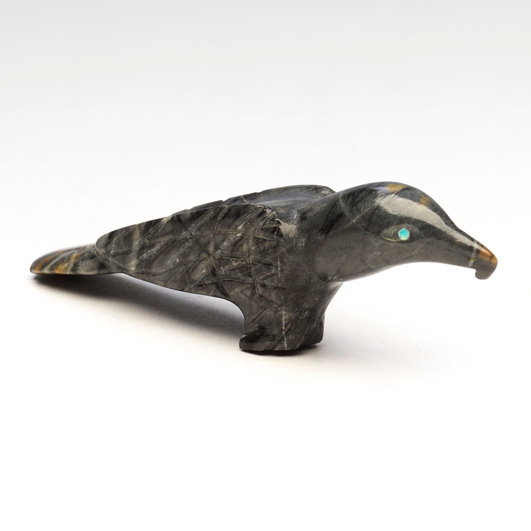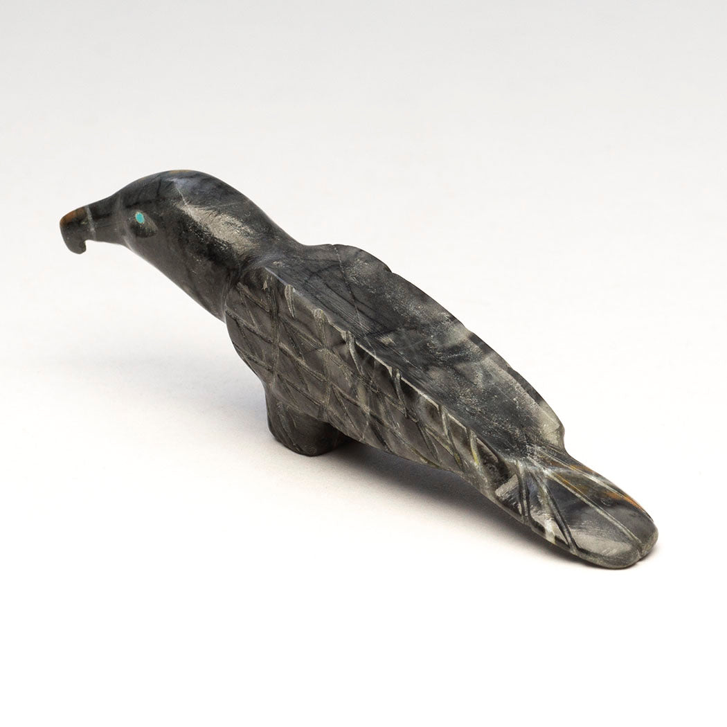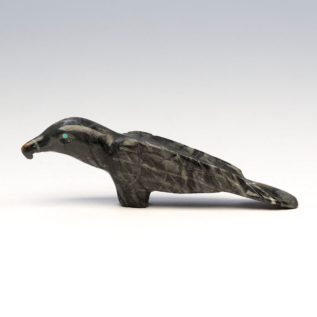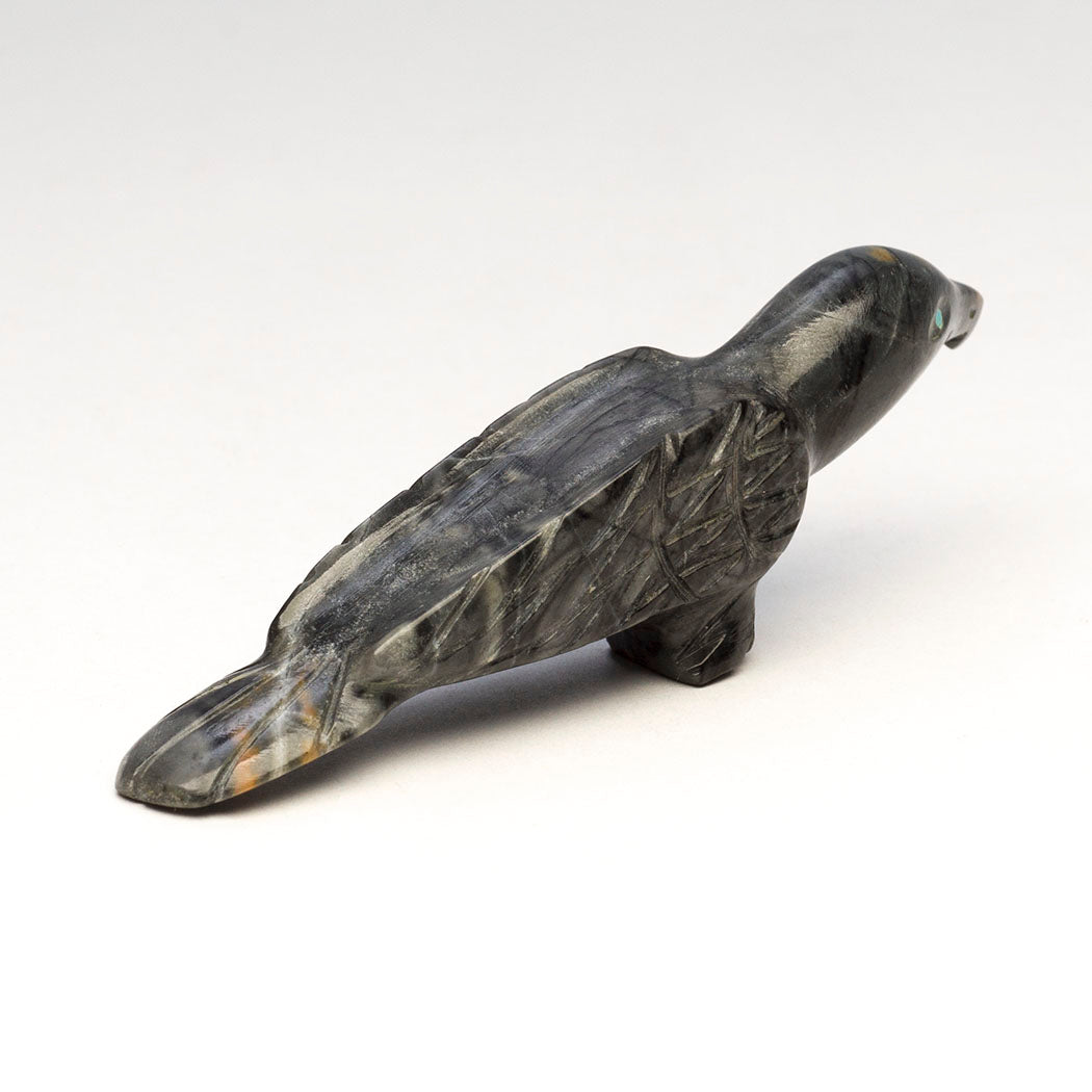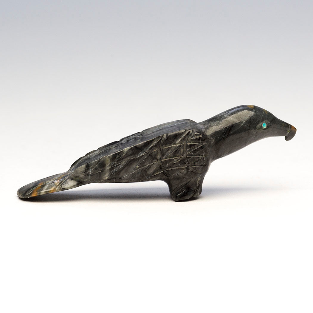 Eagles (or Hawks) gain wisdom from the skies above. Frankie Eustace's Picasso marble raptor has a wonderful hooked beak and discerning eyes from turquoise inlays. He started carving when he was 25 years old back in the 80's. He told us "I enjoy making them. After they are finished, I say a prayer: Thank you for letting it come out. If they break, I don’t throw them away. Just like reality, if someone gets sick, you don’t throw them away." About 3 3/8" long, 5/8" wide and 1" tall.