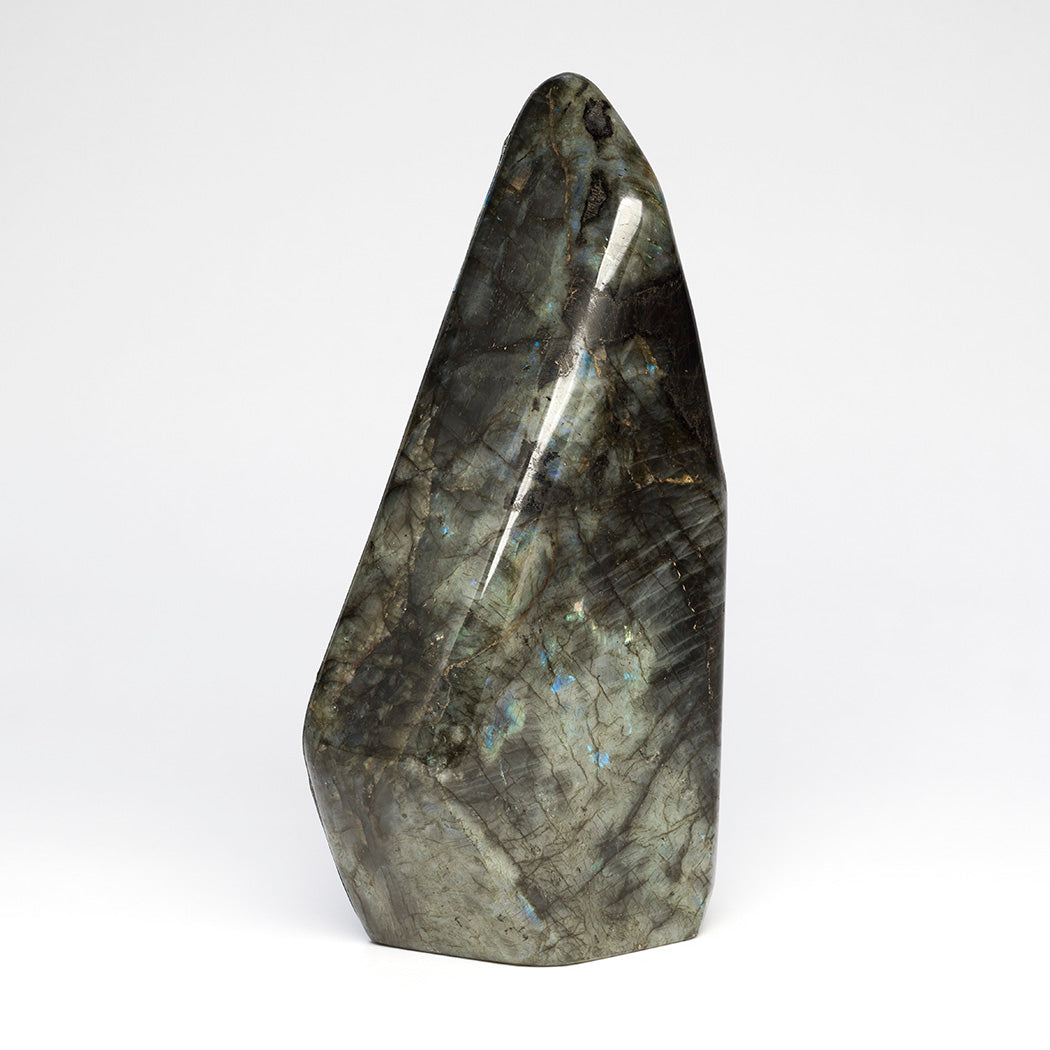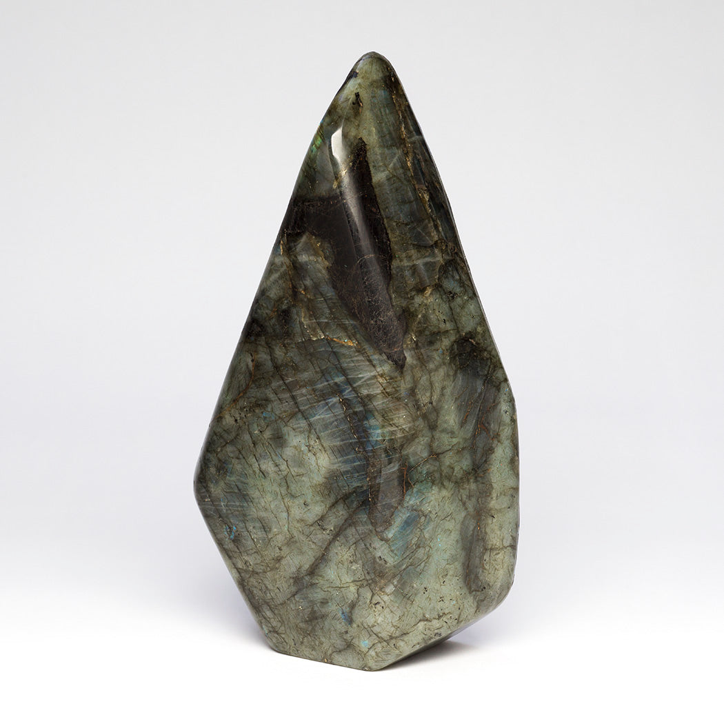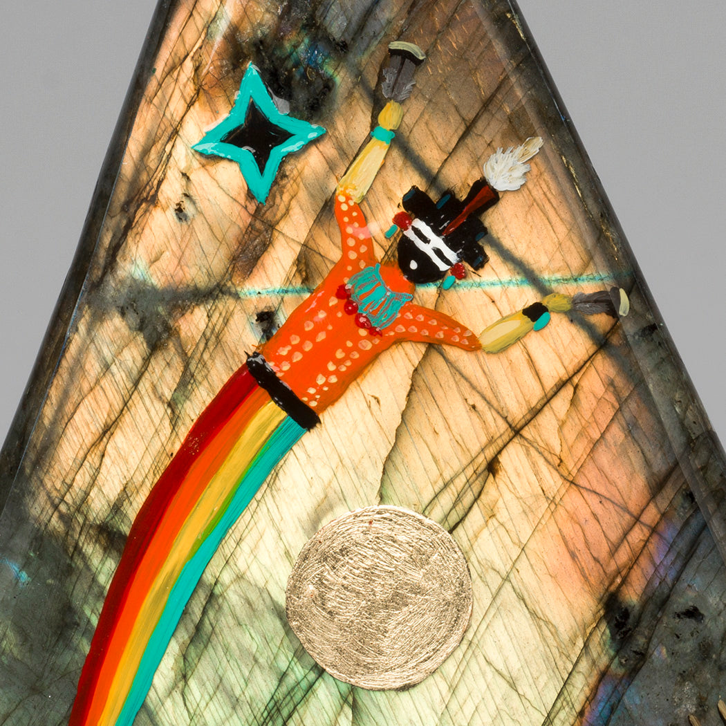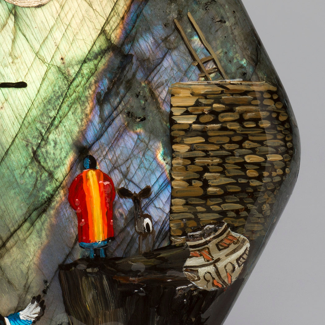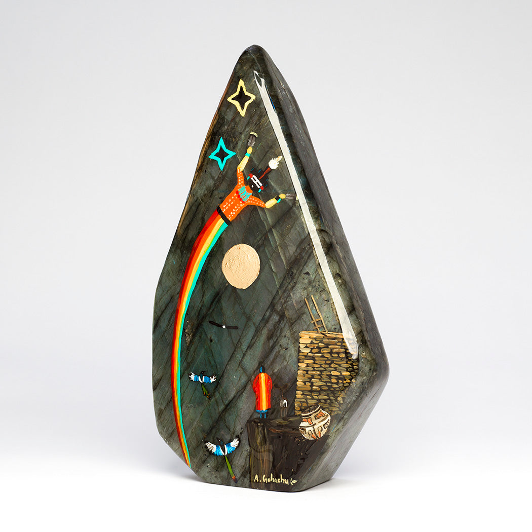 Anthony Gchachu's "Everlasting Prosperity" is a breathtaking original acrylic and rich gold leaf painting on glowing labradorite. Many intricate details draw you into a special world where sacred Rainbow Man represents the receiving of blessings. Two stars are the Morning Star and the Evening Star. Friendly magpies mean enduring togetherness because they mate for life. Father Eagle is a guide and Deer is a gentle lifelong companion. The exquisite olla pottery and ancient village represent the vital continuation of tradition and culture. A light epoxy coating protects the museum-quality artwork that weighs approximately 5 pounds and 9 ounces. Signed by the artist, dimensions are about 9 5/8" tall, roughly 5 3/4" wide and 2 1/2" deep. Please click here to meet this extraordinary artist from Zuni.