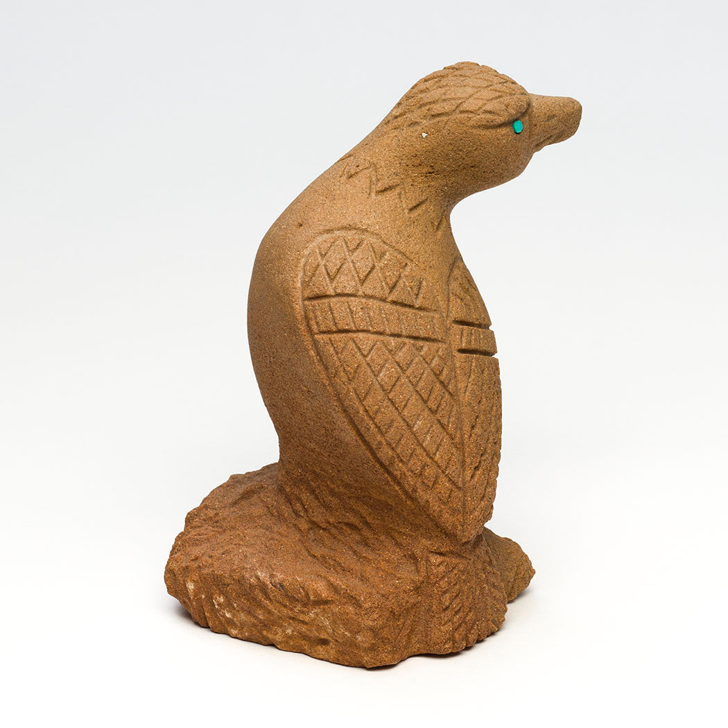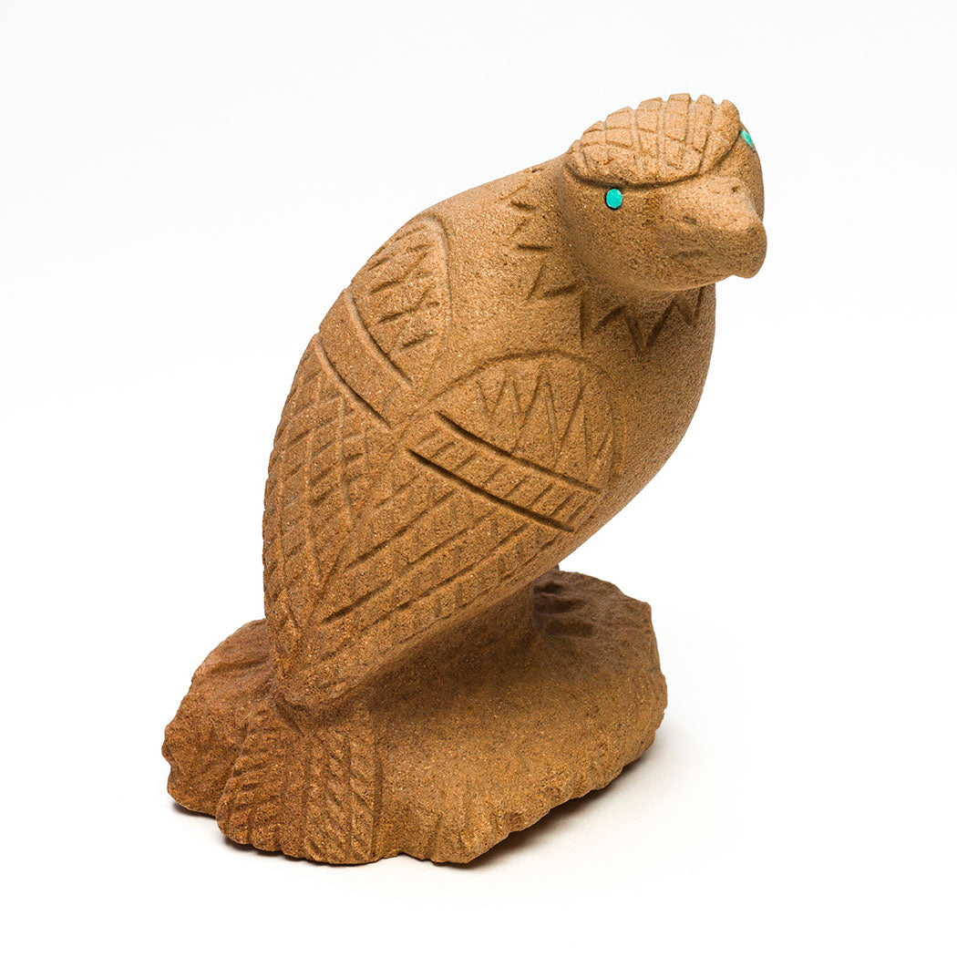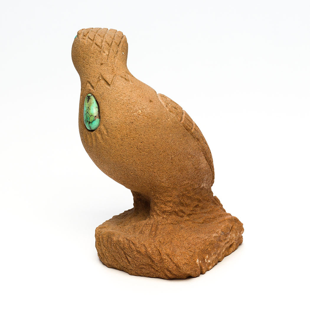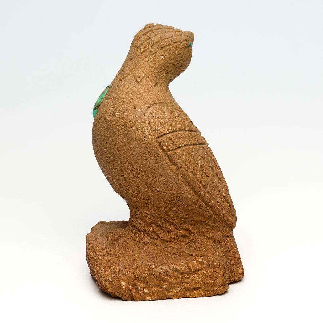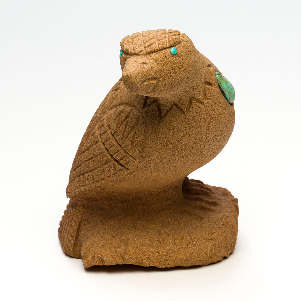 Eagles have extraordinary vision giving them a holistic view of Mother Earth. Their animal medicine teaches us to live with discernment, that is to try and look at the big picture weighing all the factors as we walk each day. Darrell Westika's investigative Eagle (or Hawk who in Zuni tradition is considered little brother to eagle) has been carved from one portion of rich sandstone. Piercing eyes are from turquoise inlays and incised contour feathers are accented with a handsome turquoise cabochon. About 5" tall, 3 1/2" wide and 4 1/2" deep.