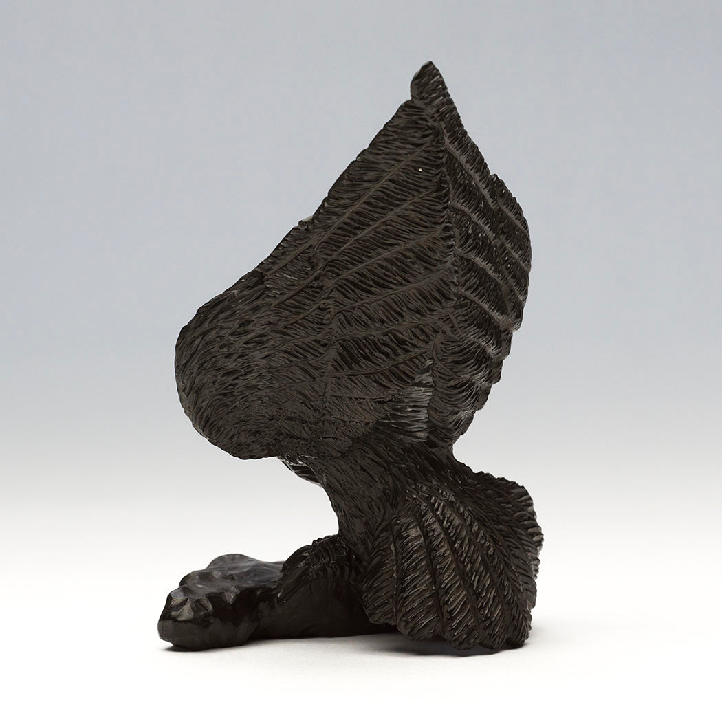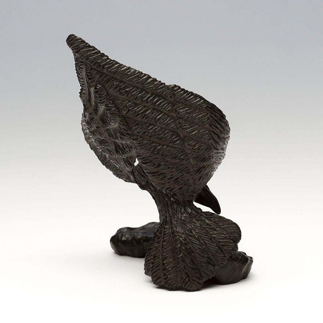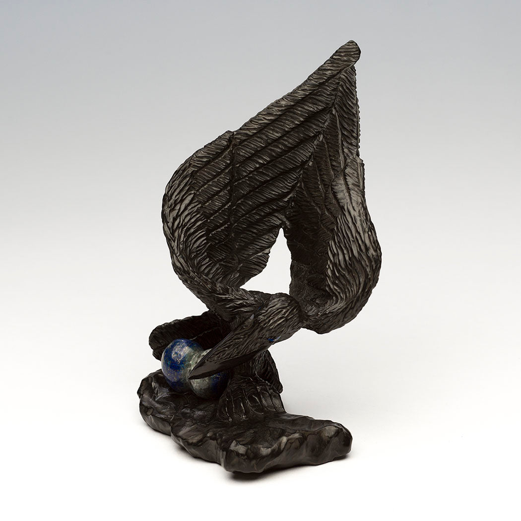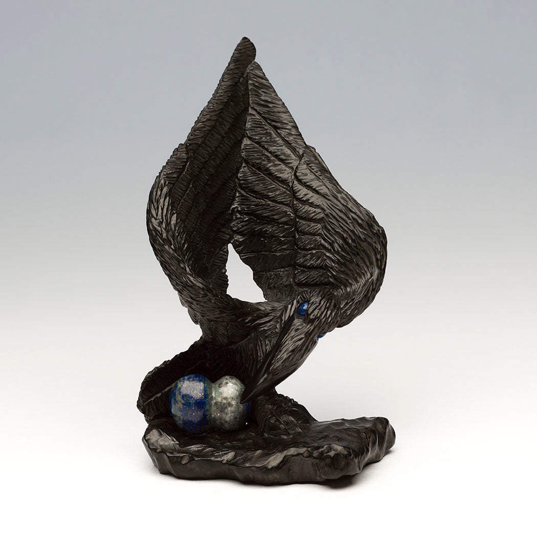 Keli'i Eli beautifully captures the quiet activity happening just below the high treetops as a devoted mother Raven (or crow) tends to her precious eggs carved from dazzling lapis lazuli. Rich with detail, the lapis-eyed corvid's sleek beak and intricate plumage are stunning. Raven mothers are very territorial protecting the nests with all their hearts. About 3" long, 3 1/4" wide and 4 3/4" tall, sculpted from one portion of jet.
