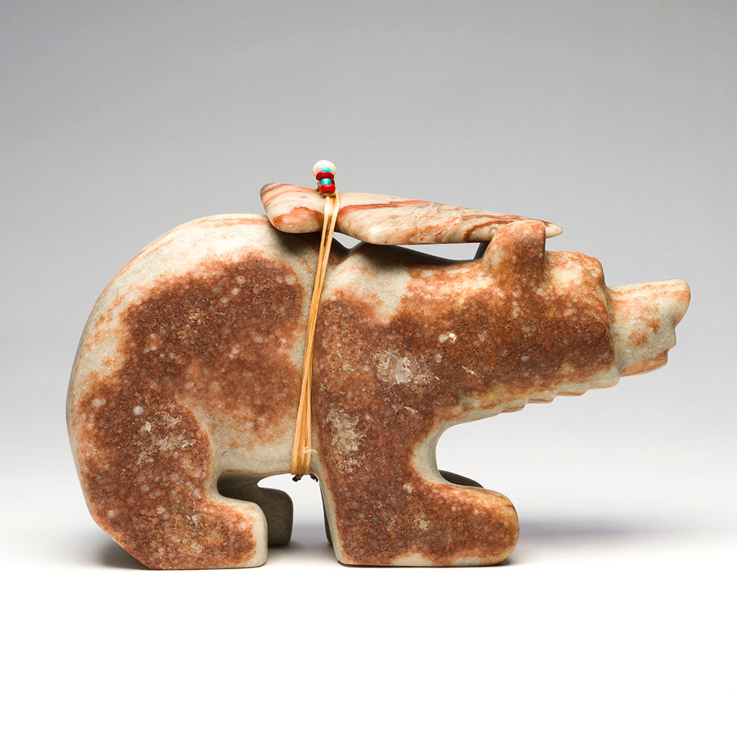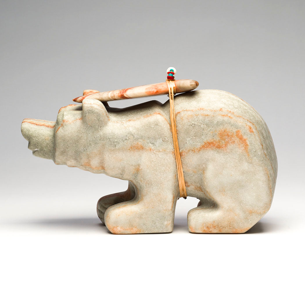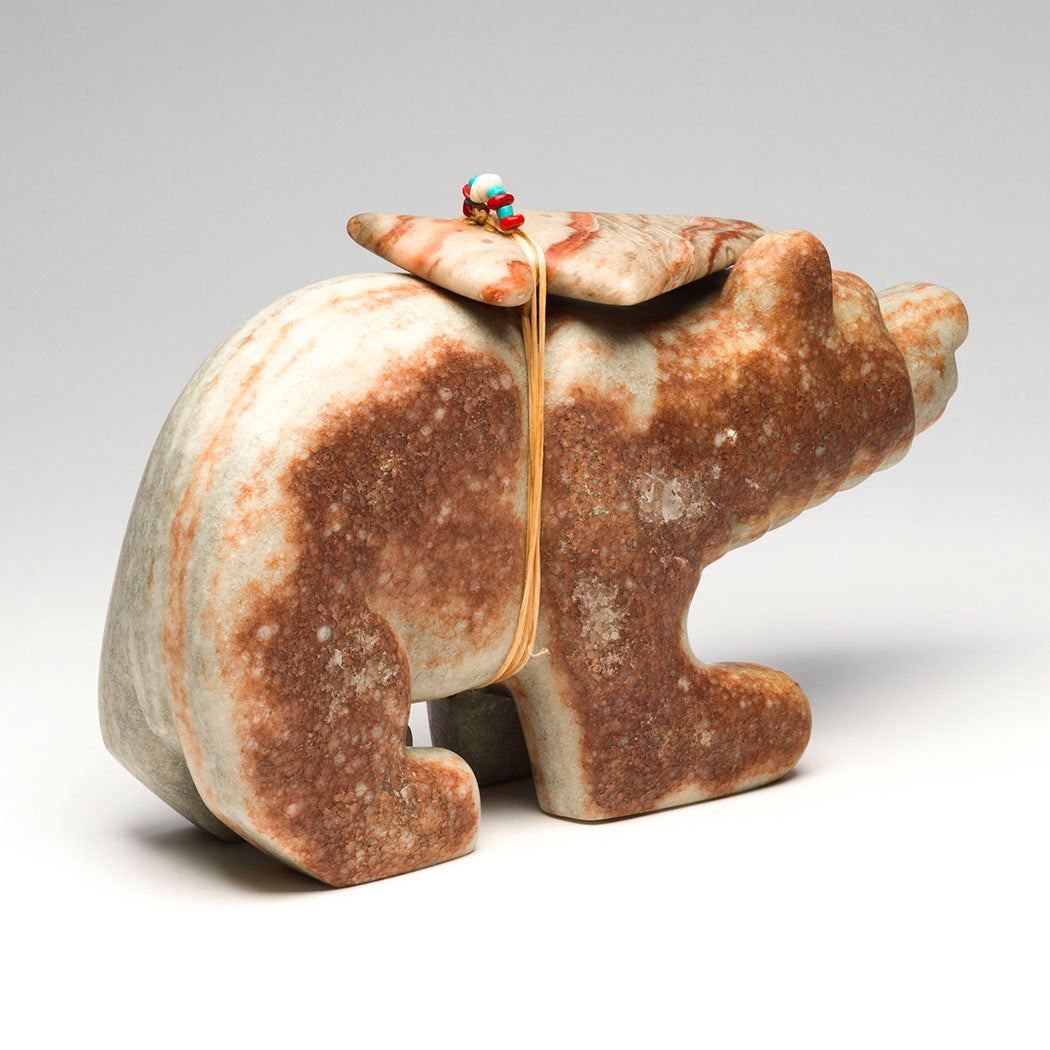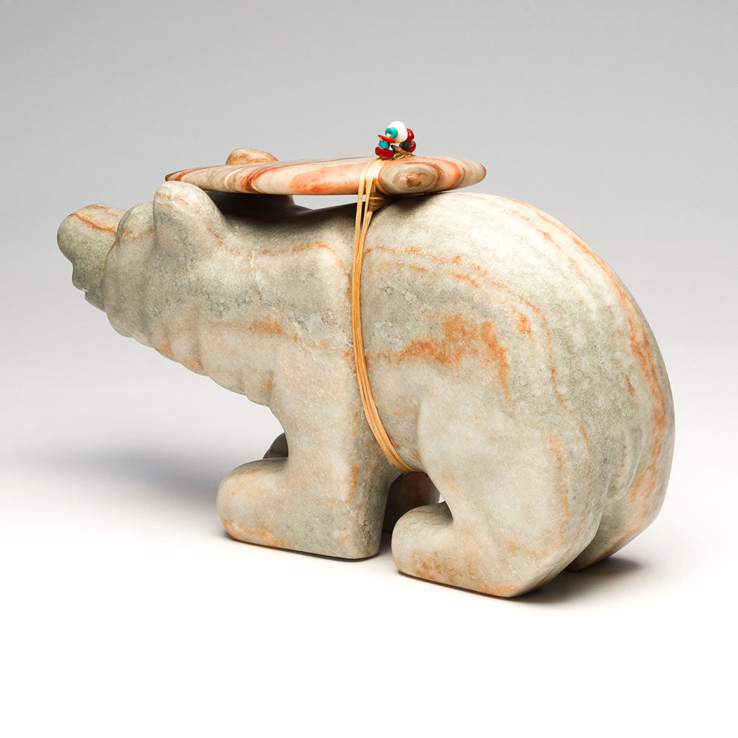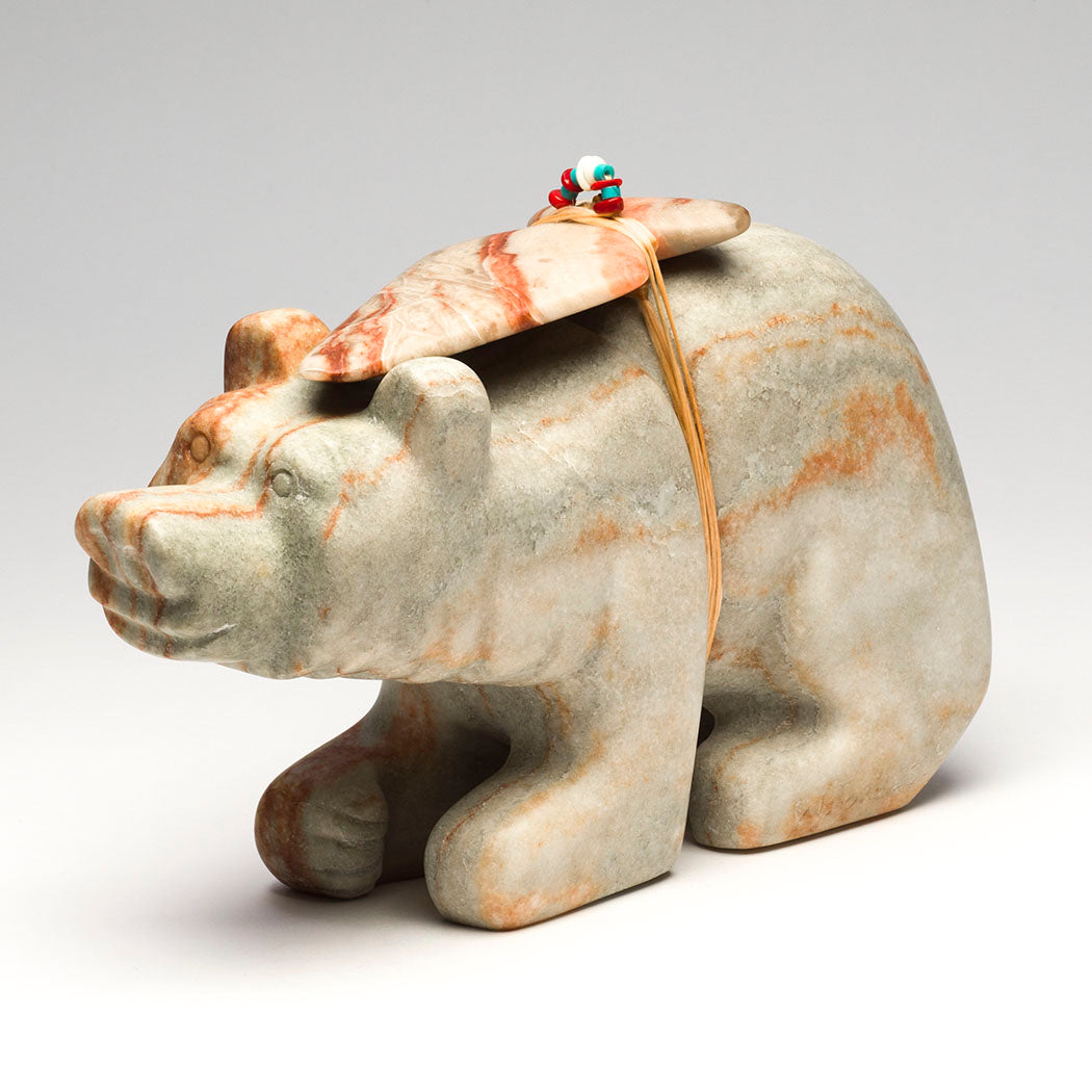 Acoma Pueblo artist Walter Torres has preserved the power of Bear in a large scale sculpture from rich alabaster. We're happy to welcome him to keshi.com. He's been carving for many years creating expressive animal figures. He's also a fabulous potter. We love the varied hues of the alabaster, it is like getting two bears in one because each side is so unique. Wonderful facial features include carved eyes and soft ripples under the chin. An offering bundle gift is from a stunning alabaster point. Dimensions of this gentle giant are about 11" long, 3 1/4" wide and 7" tall.