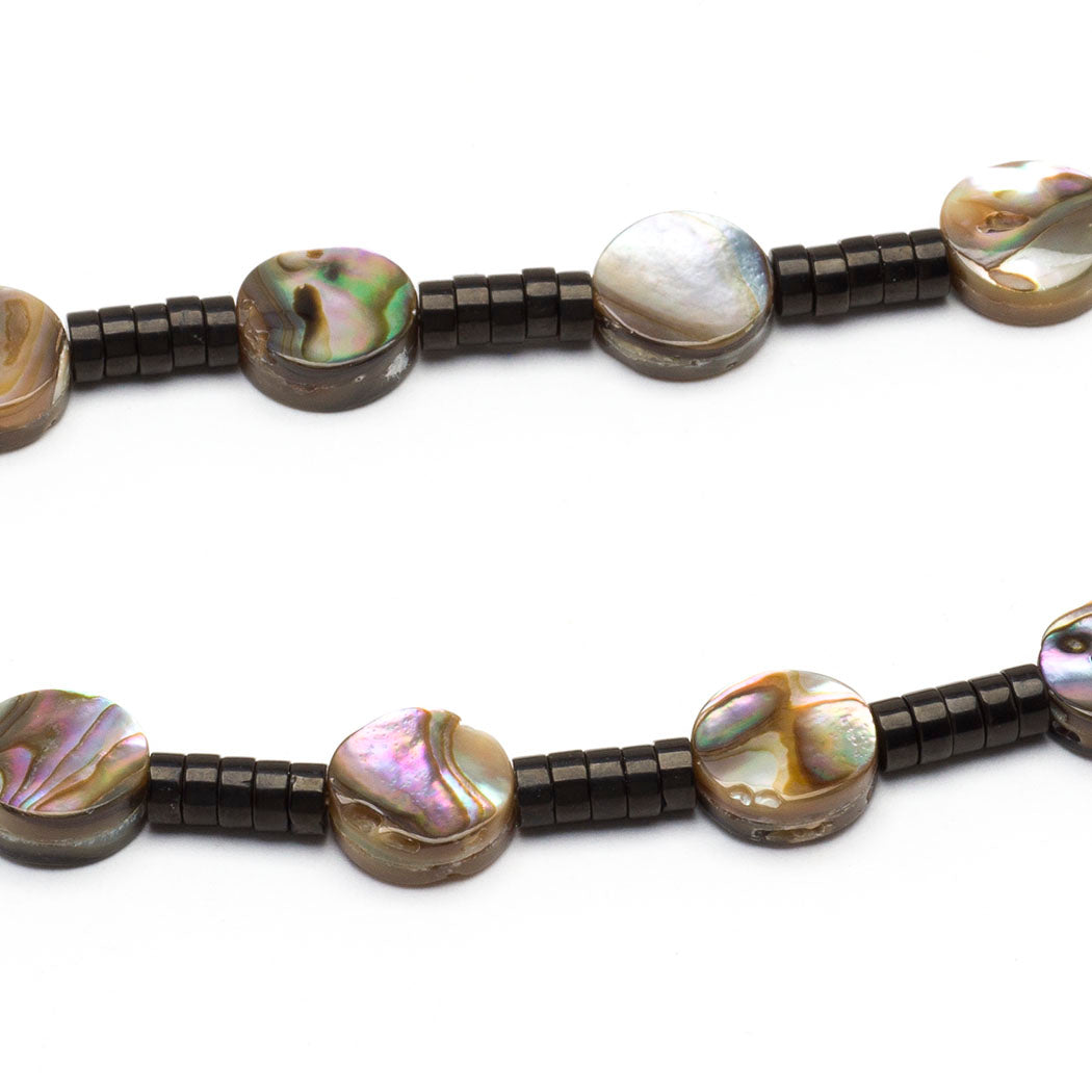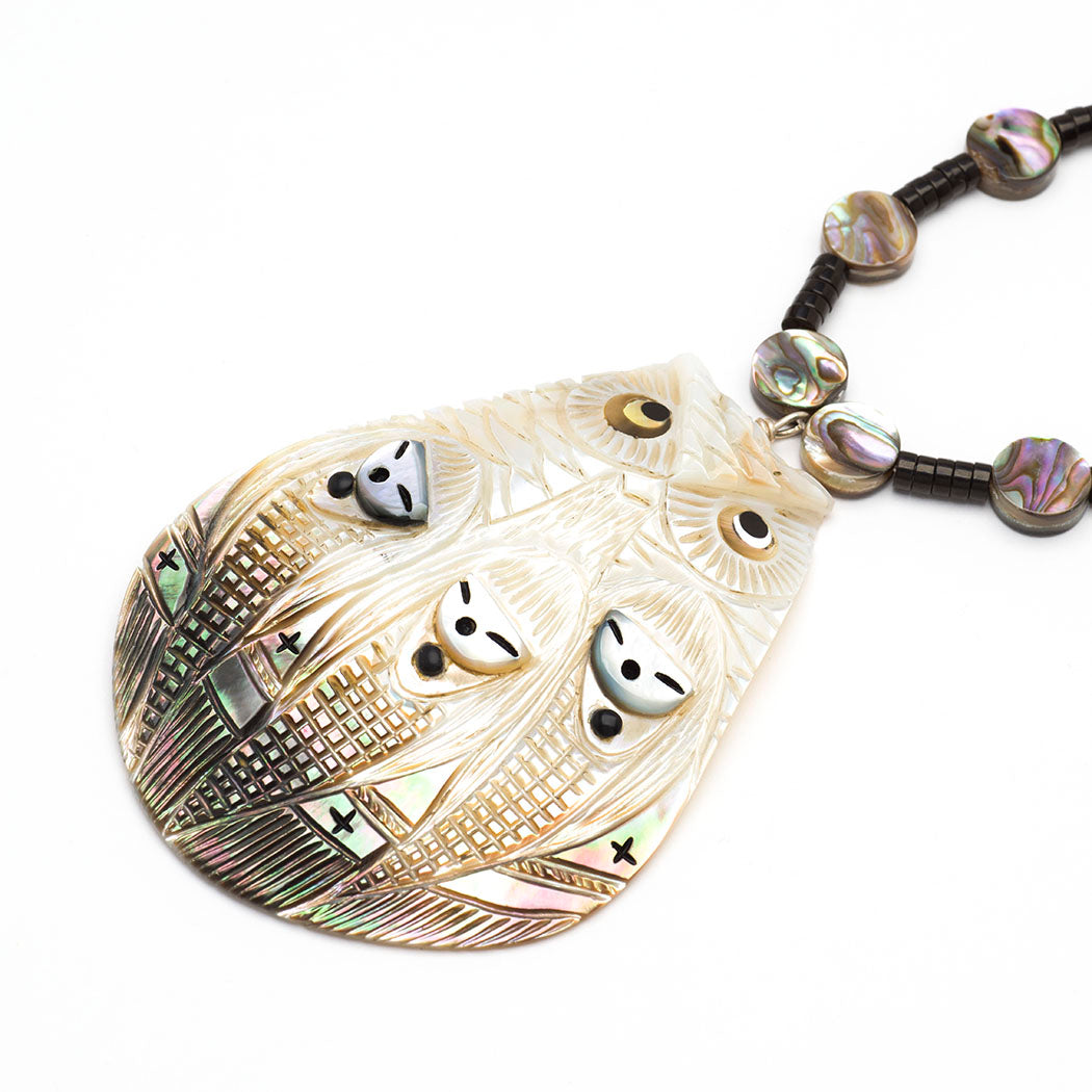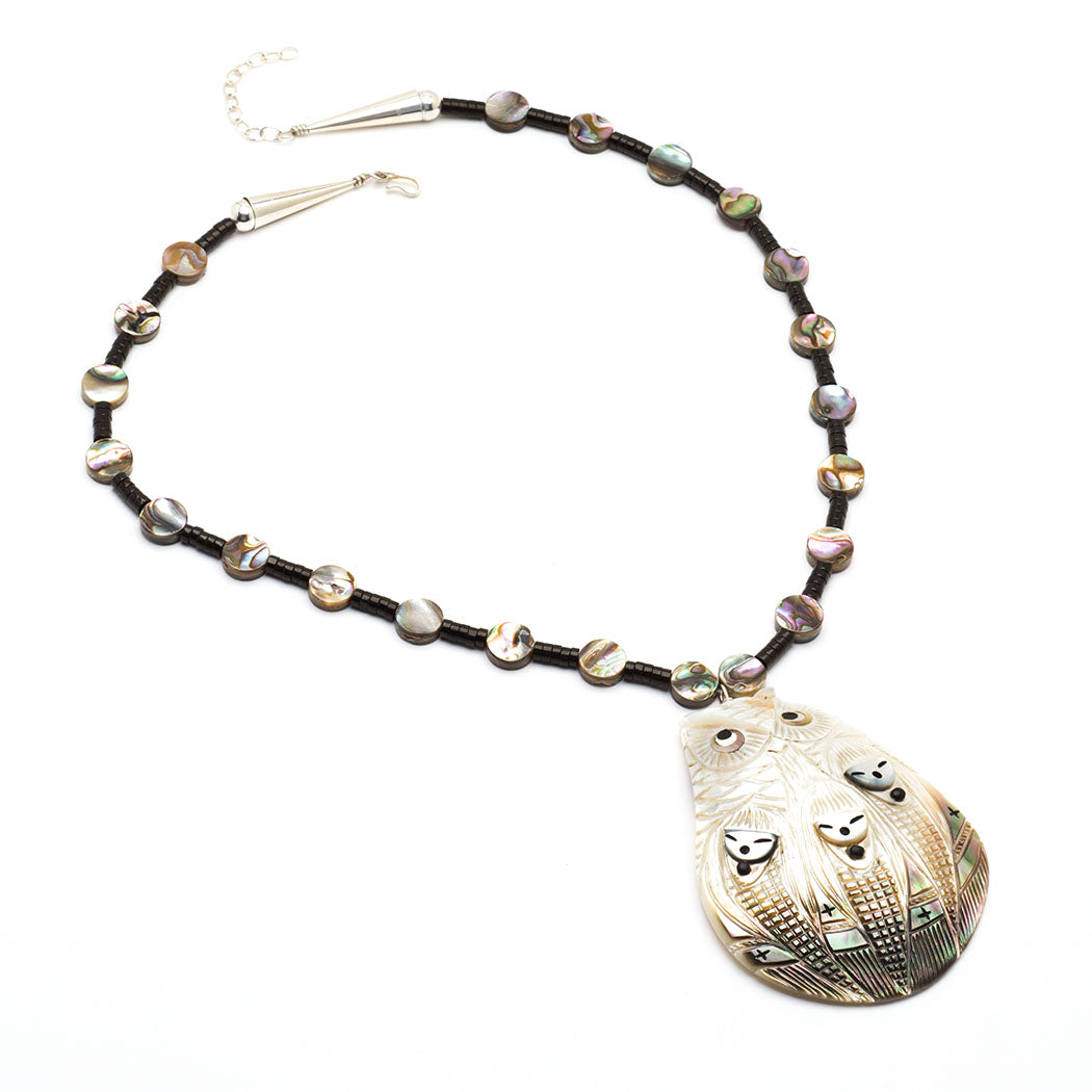 Kateri Quandelacy Sanchez tells a sacred story through this stunning work of wearable art. It is about Grandfather Owl who dutifully protects three Corn Maiden sisters. They bring nourishment and prosperity to A:Shiwi (The People), while Grandfather Owl acts as a Guardian. The elegant Corn Maiden's faces are from mother-of-pearl etched and filled with jet paste, while the powerful bird's watchful eyes are from pen shell in gold lip shell. Incised layered plumage and the individual corn kernels are a feast for the eyes. The pendant necklace is strung with alternating iridescent abalone and perhaps jet beads, which go hand in hand with the richness of the smoky mother-of-pearl pendant. The individual abalone beads are about 3/8" in diameter. Picture the praise coming your way when wearing this captivating pendant necklace. It is adjustable from approximately 20 3/4" to 22 1/2" long. The slightly convex pendant itself including the silver bale is roughly 3 1/4" long, 2 3/8" wide and 1/2" deep.