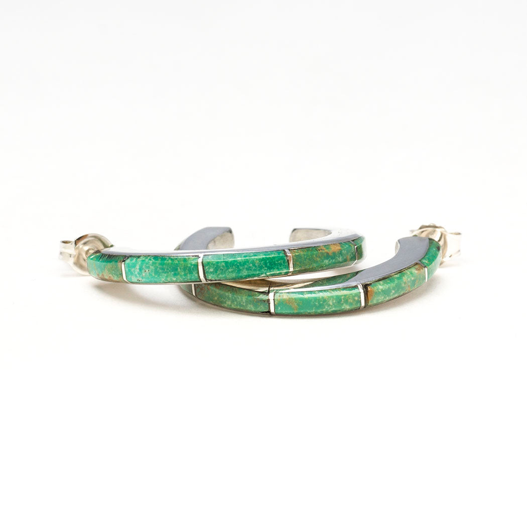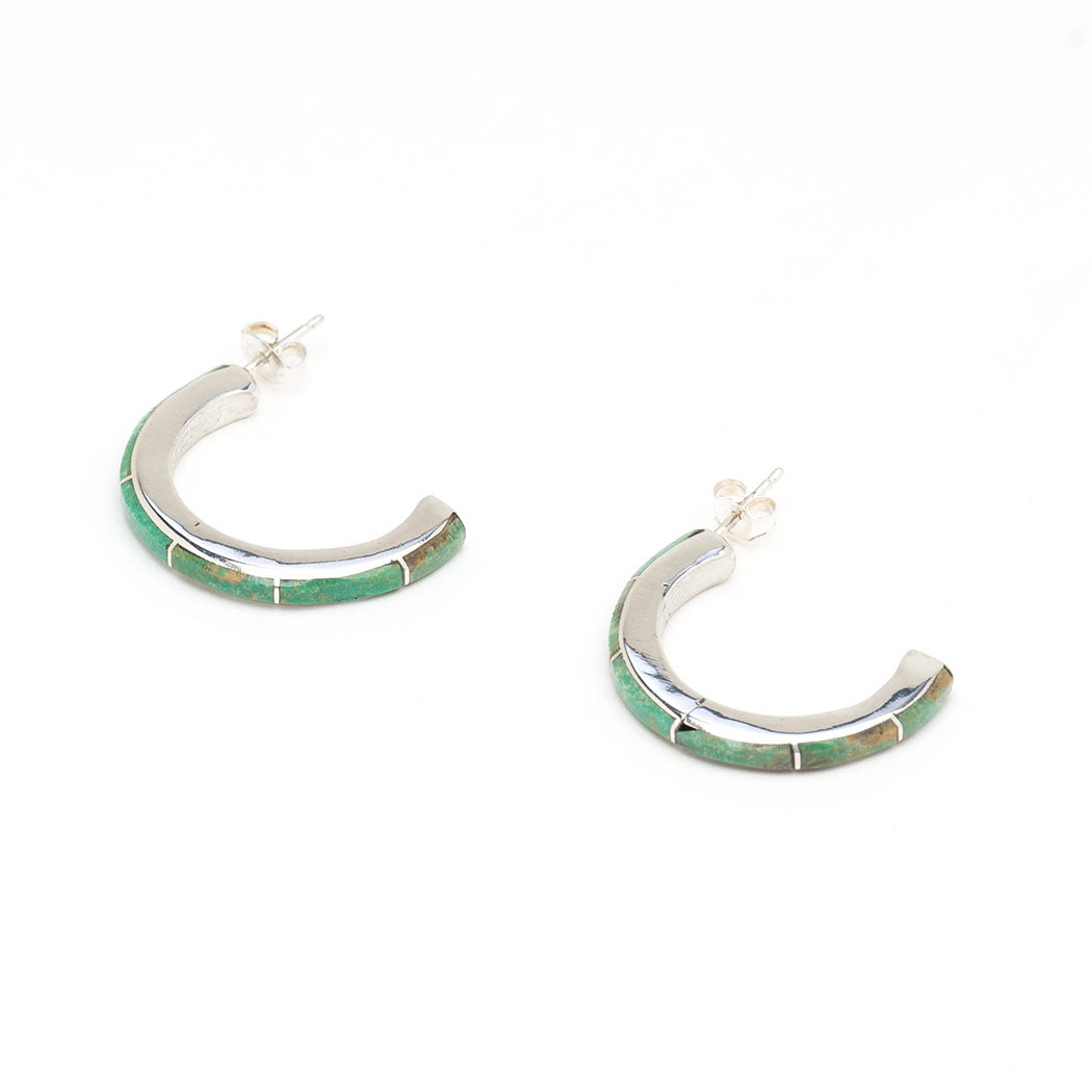Zuni artist Rosalie Hustito's incredible lapidary and silversmithing skills shine through in a classic pair of well-polished sterling silver and refreshing turquoise channel inlaid half-hoop earrings. For pierced ears, they are lightweight and measure approximately 1 1/8" long, 1/8" wide and 3/4" deep. Signed by the artist. Please click