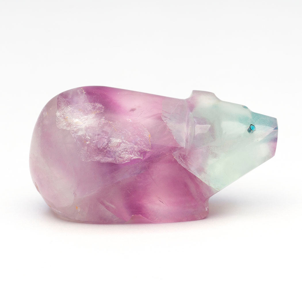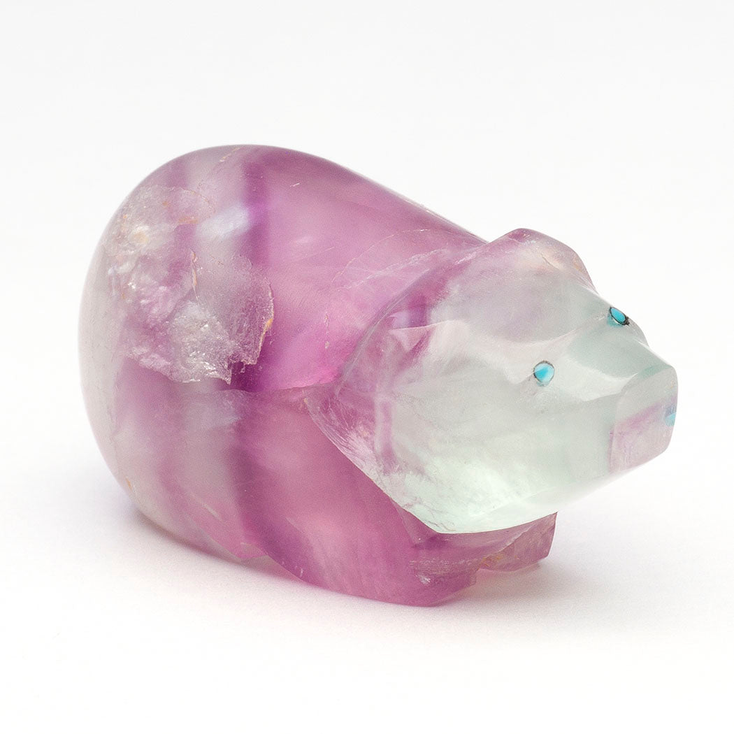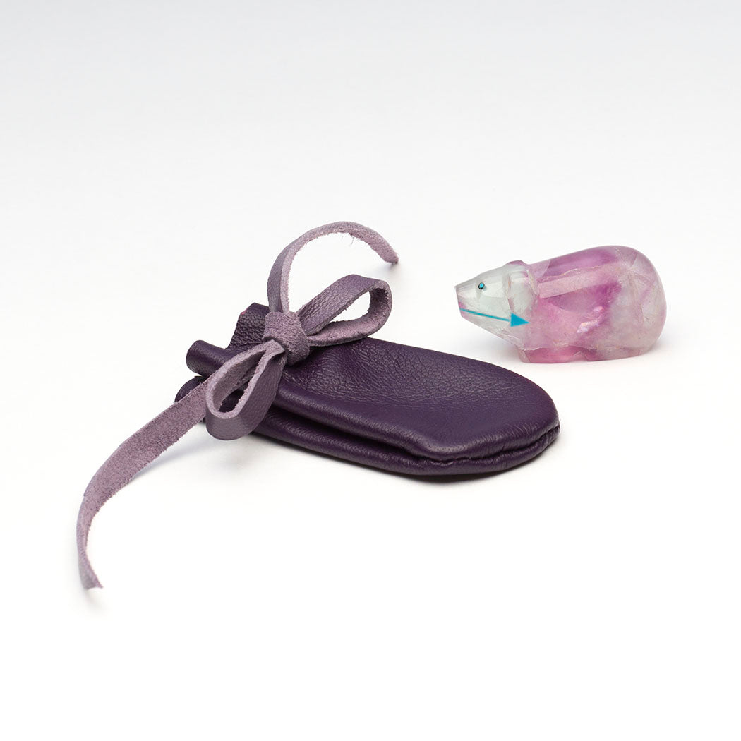 Bear's torpor is a wonderful example that taking time for ourselves away from the world means to heal and to restore, always good medicine. Abby Panteah's pretty fluorite bear could be your reminder. Eyes and a heartline or breath path are from turquoise inlays executed by Clayton Panteah. A soft handmade leather pouch by Moon Bags accompanies the bear making for a fabulous, good-looking 2-piece set. Sweet bear measures about 1 5/8" long, 3/4" wide and 7/8" tall, while the two-tone purple pouch measures in the neighborhood of 2 7/8" long and 2 3/8" wide.