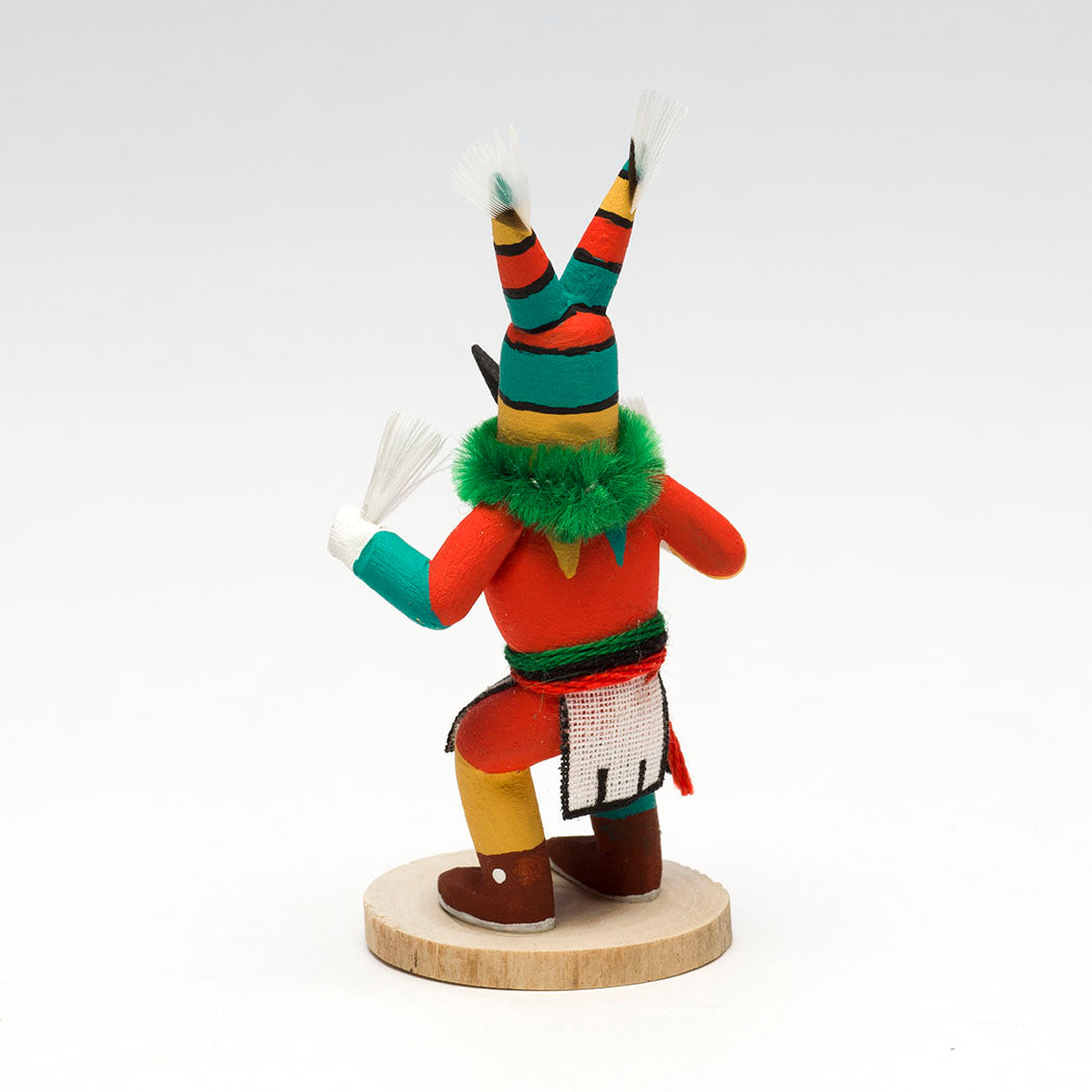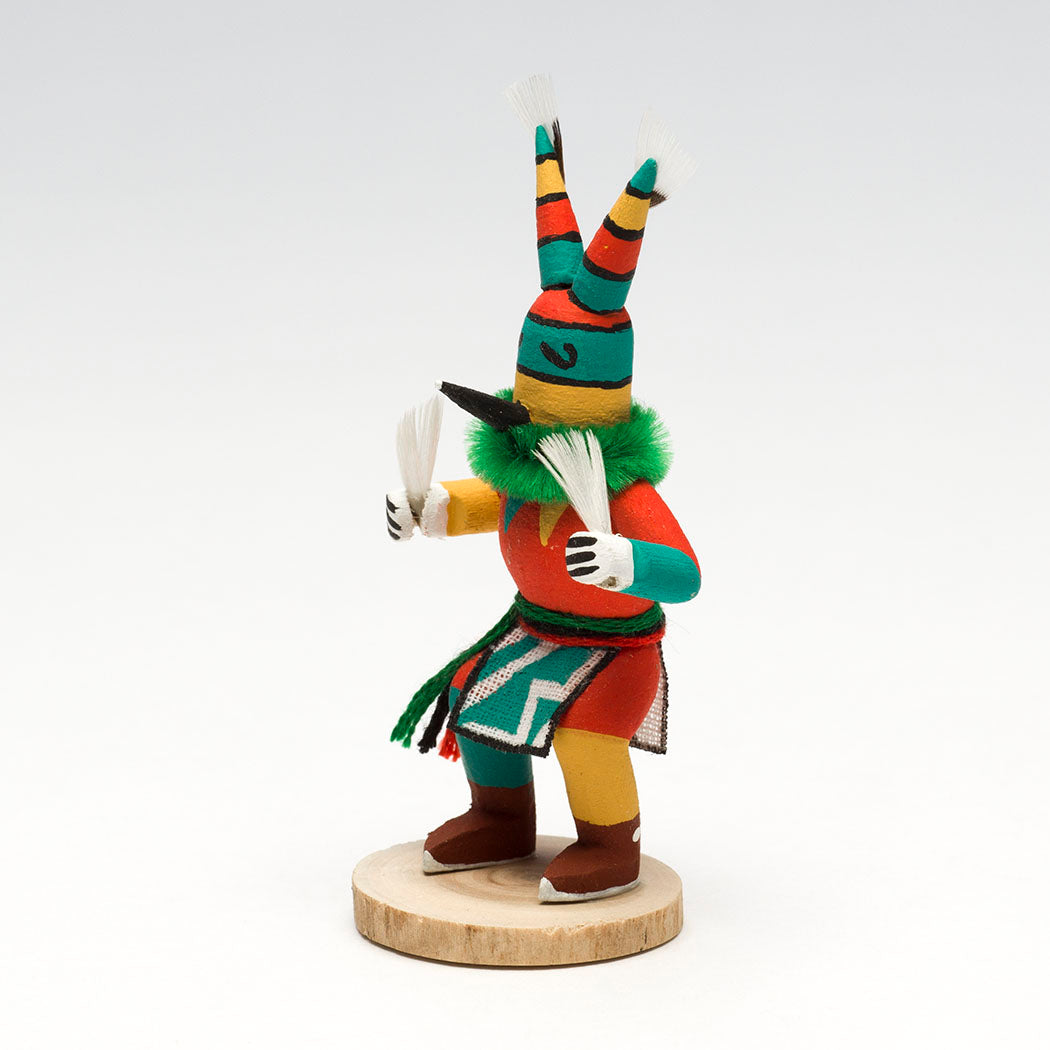 The Hopi People believe Katsinas bring harmony to Mother Earth, beneficial rainfall, good crops, fertility and successful hunting. They are various masked ancestral spirits who come during their religious dances. Adrian Leon creates colorful small-scale katsina dolls like this miniature "Hopi Hornet" who is detailed with feathers, embroidery thread, cheesecloth and pipe cleaner on a carved cottonwood body painted with acrylic paints. Signed by the artist, this collectible woodwork including base is approximately 2 7/8" tall, 1 3/8" wide and 1 1/8" deep. Signed by the artist.