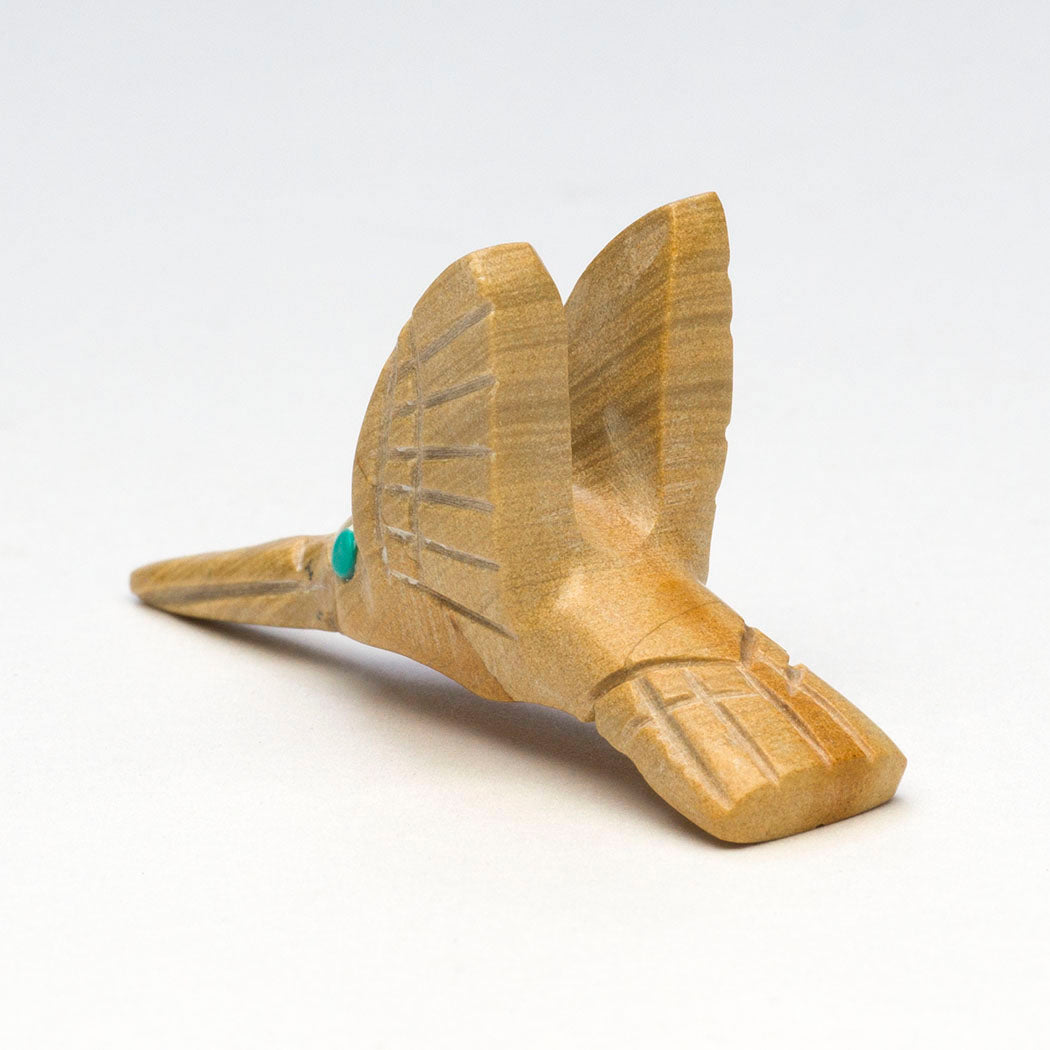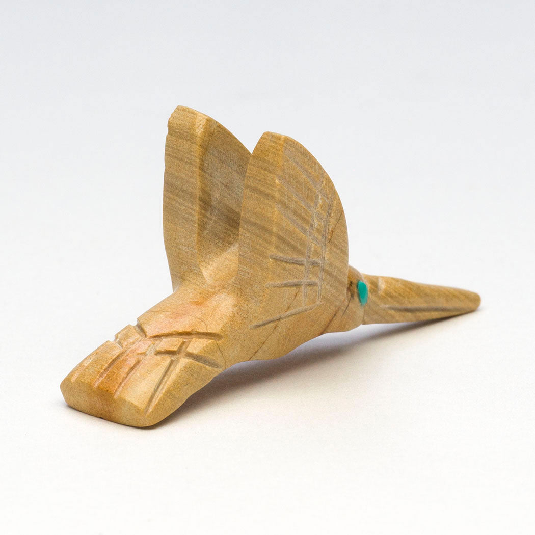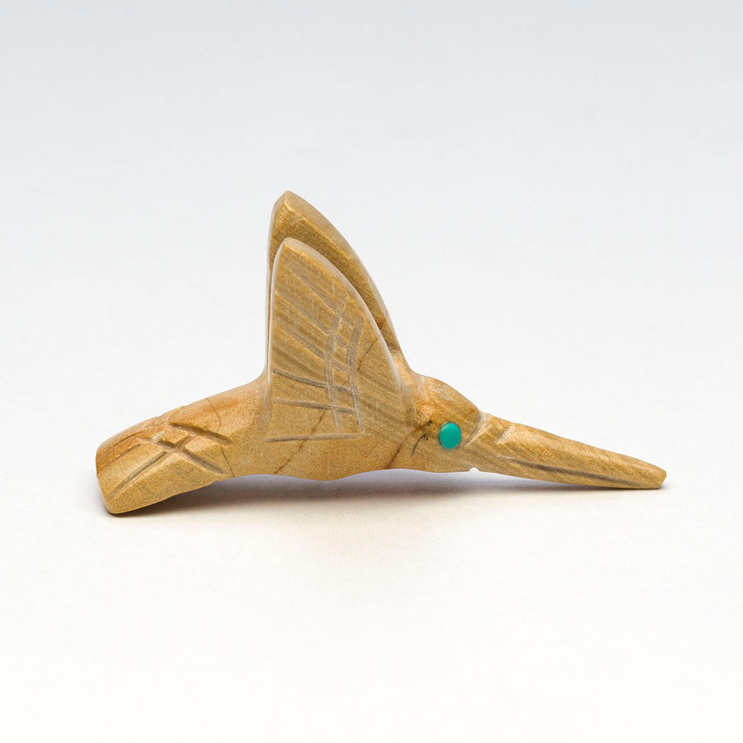 Hummingbirds are found only in the western hemisphere so many stories about these tiny warrior birds exist in Indigenous beliefs. The Chayma People of Trinidad believe that hummingbirds are dead ancestors and it is improper to harm them. Ancient Mayan legend tells of a hummingbird piercing the tongues of age-old kings. When the blood was drizzled on sacred scrolls and burned, divine ancestors manifested in the smoke. Fabian Tsethlikai's determined Hummingbird has been carved from picture jasper. A wonderful beak and focused eyes from turquoise inlays complete this roughly 1 3/4" long, 1/2" wide and 7/8" tall spirited feathered friend.