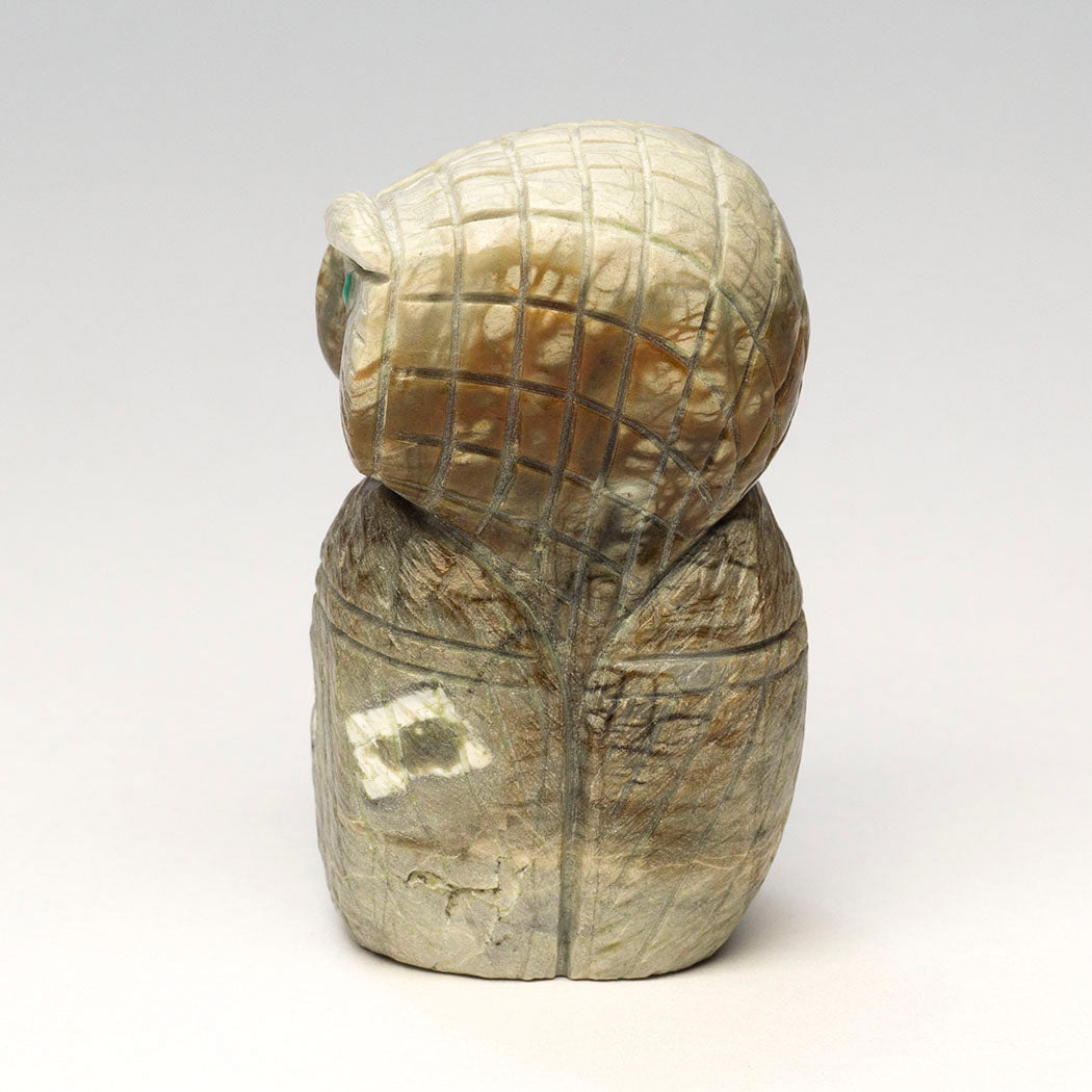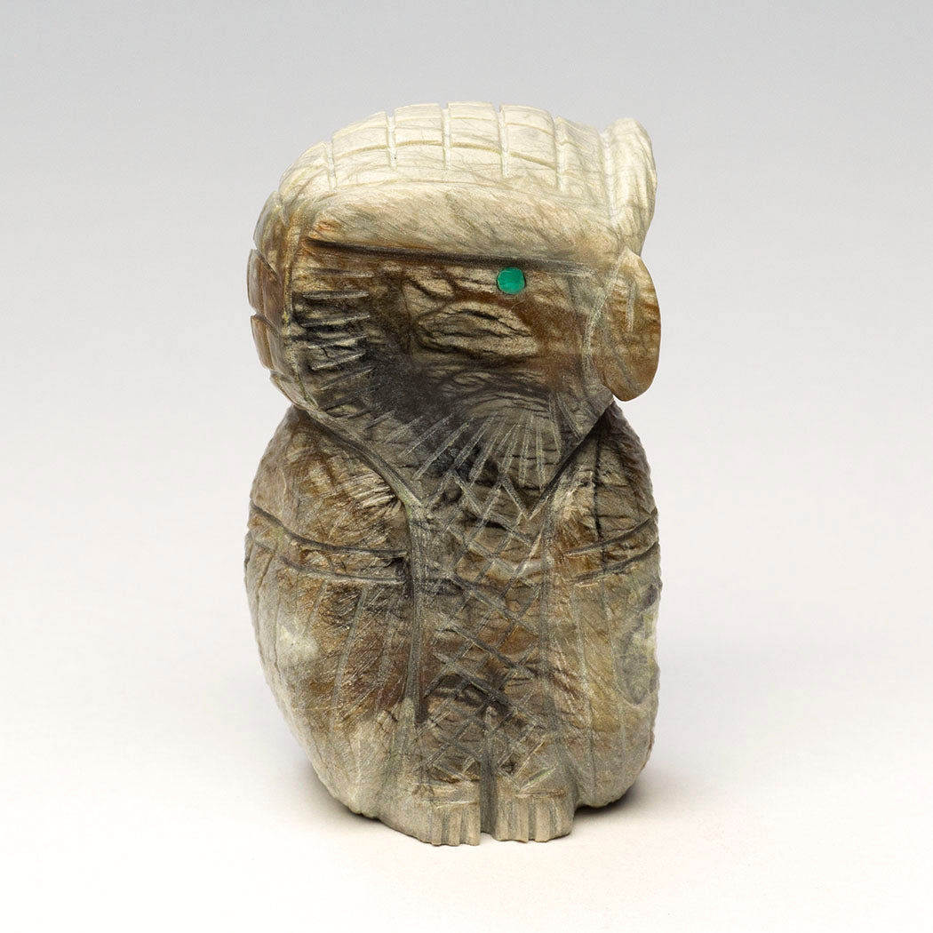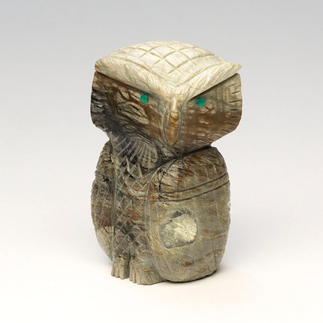 Jonas Hustito's midnight muse silently contemplates the wise course teaching us that quiet reflection is better than impulsive action. Carved from Picasso marble, a chorus of wings and whispers live in this approximately 2 1/4" tall, 1 1/2" wide and 1 1/2" deep Owl guardian of the night. Ever-watchful eyes are from turquoise inlays.