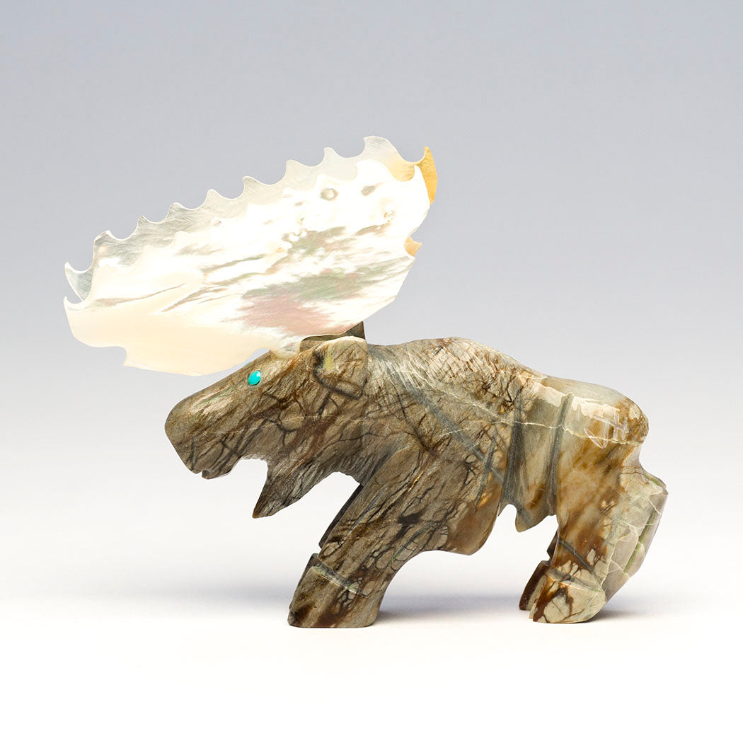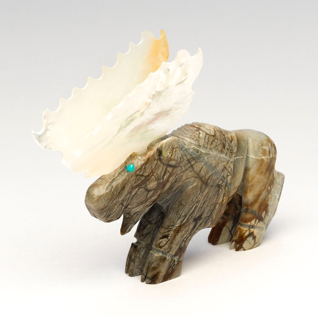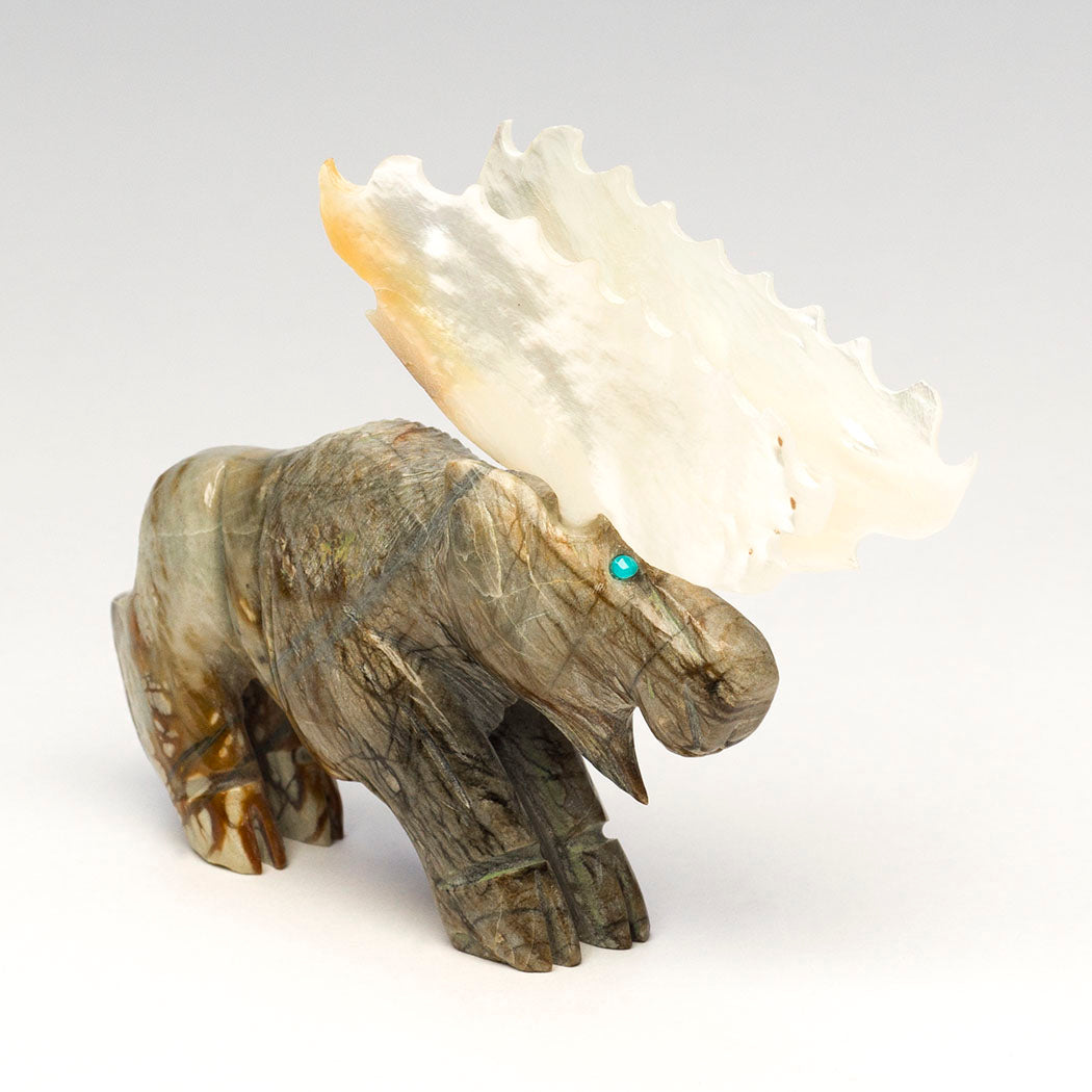 Jonas Hustito's peaceful herbivore emerges from a deep lake where abundant aquatic plants were on the menu. Moose are gifted swimmers able to journey long distances in water. Sculpted from Picasso marble and blessed with iridescent gold lip mother-of-pearl shell palm-shaped antlers, this slow-moving browser is about 3 1/2" long, 7/8" wide and 2 3/4" tall. The blues of the vast sky are seen in the turquoise eyes. The artist's initials are incised on the hip region.