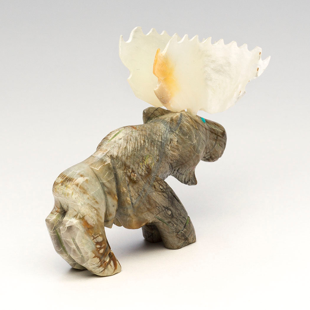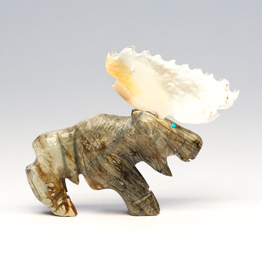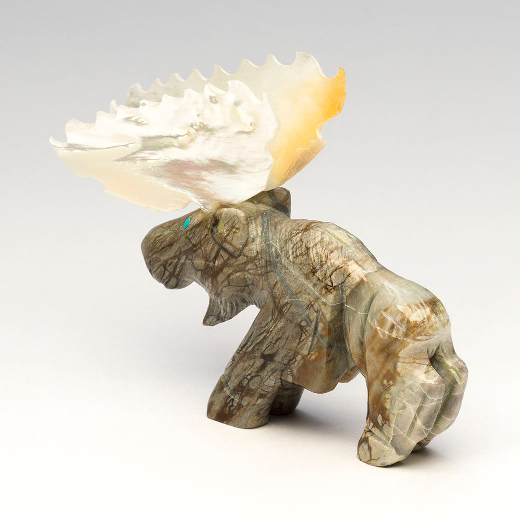 Jonas Hustito's peaceful herbivore emerges from a deep lake where abundant aquatic plants were on the menu. Moose are gifted swimmers able to journey long distances in water. Sculpted from Picasso marble and blessed with iridescent gold lip mother-of-pearl shell palm-shaped antlers, this slow-moving browser is about 3 1/2" long, 7/8" wide and 2 3/4" tall. The blues of the vast sky are seen in the turquoise eyes. The artist's initials are incised on the hip region.
