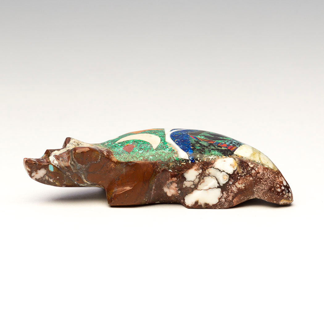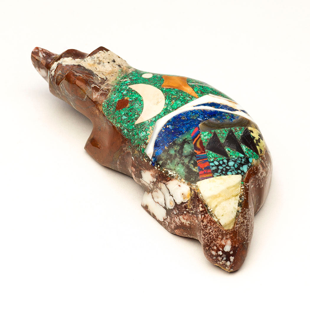 As night falls, Badger begins a crescent moon adventure where every path leads to enchanted places. Sculpted from magnesite, Jayne Quam's magnesite creature has a gorgeous nightscape mosaic from crushed chrysocolla, fish rock serpentine, pipestone, marble, crushed lapis lazuli, white shell, iridescent abalone, ruby in zoisite, rainbow calsilica, pen shell, Kingman black web turquoise and serpentine all meticulously inlaid. Wanderlusting eyes are from turquoise inlays. About 3 1/8" long, 1 3/8" wide and 3/4" tall.