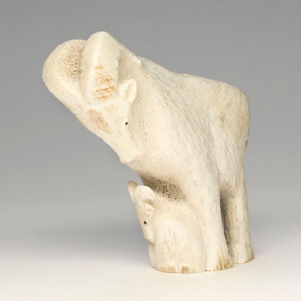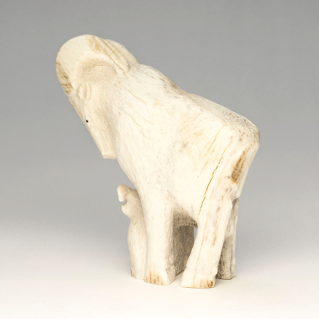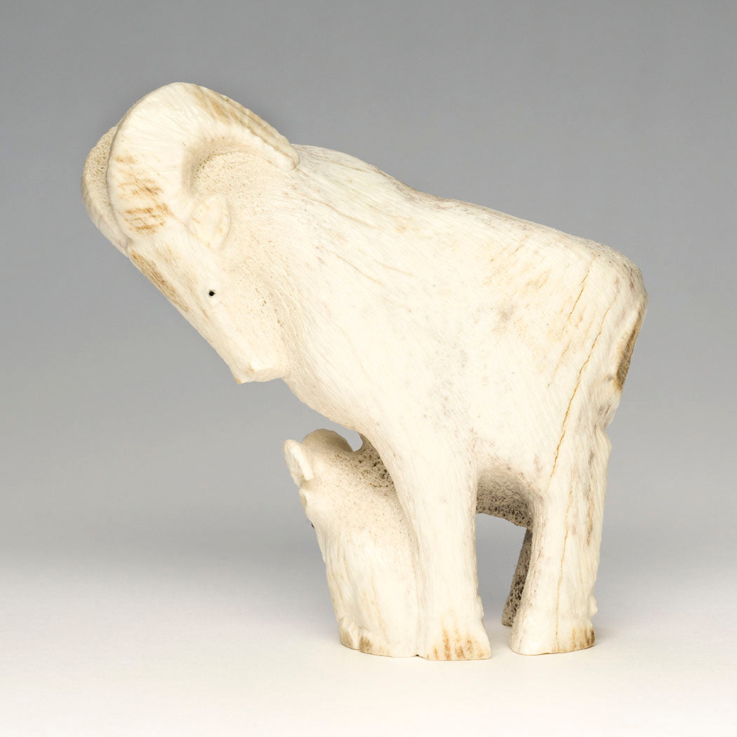 Bighorn sheep are dedicated mothers following through on essential training. They lead their little lambs through rugged landscapes teaching them vital climbing and predator evasion skills. Maxx Laate's loving ewe and baby share a tender moment in time sculpted from one portion of antler to a dimension of roughly 4 7/8" long, 2 1/4" wide and 4 5/8" tall. Expressive eyes are from jet inlays. Their curved horns are amazing enhanced by the natural features of the antler specimen.