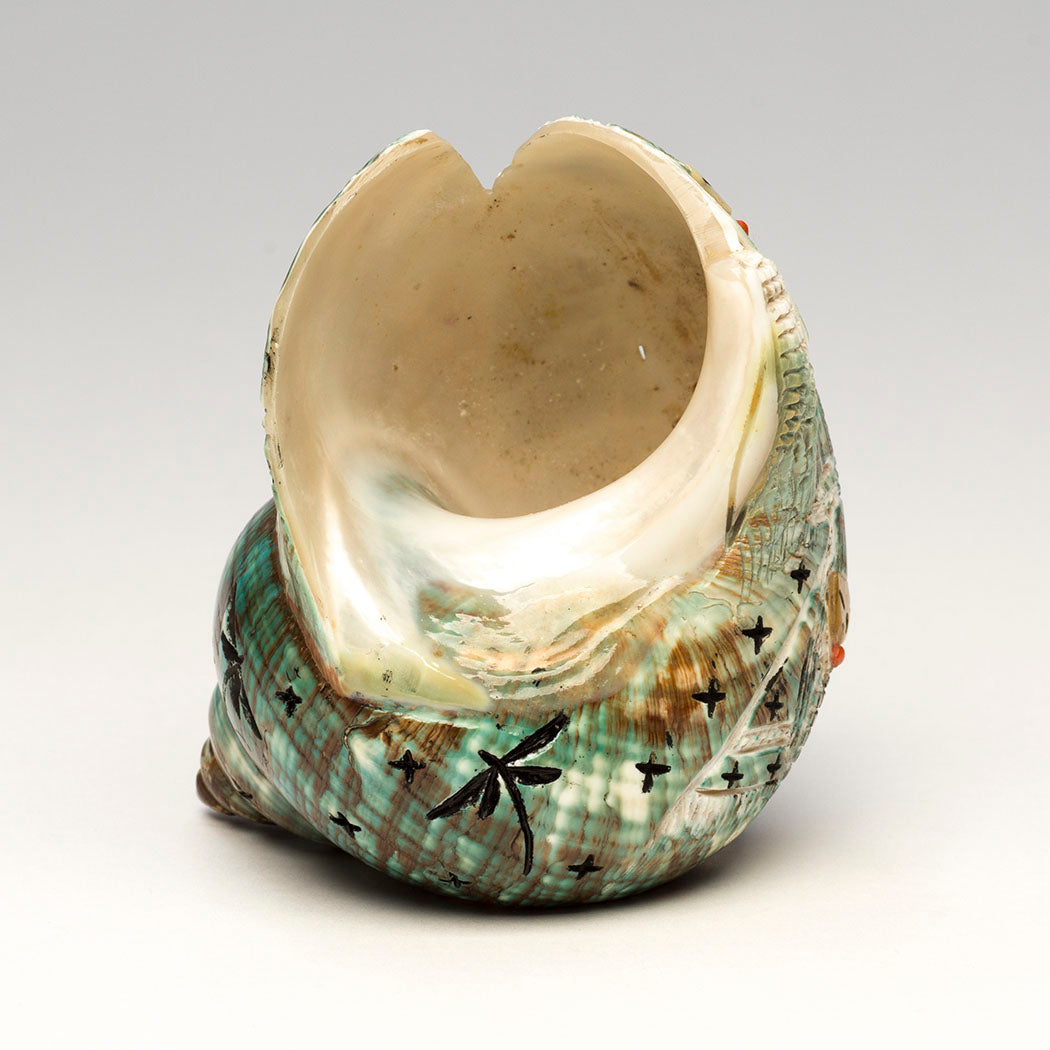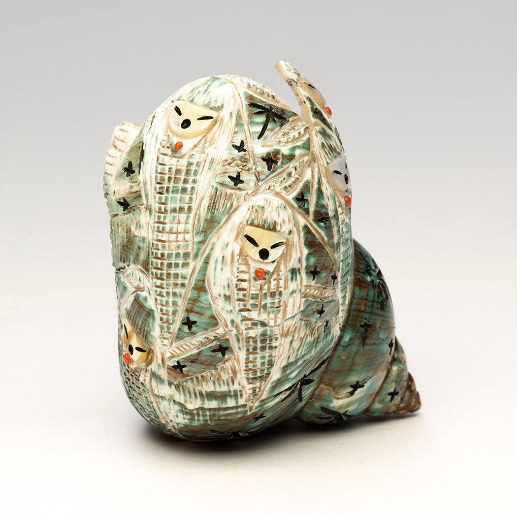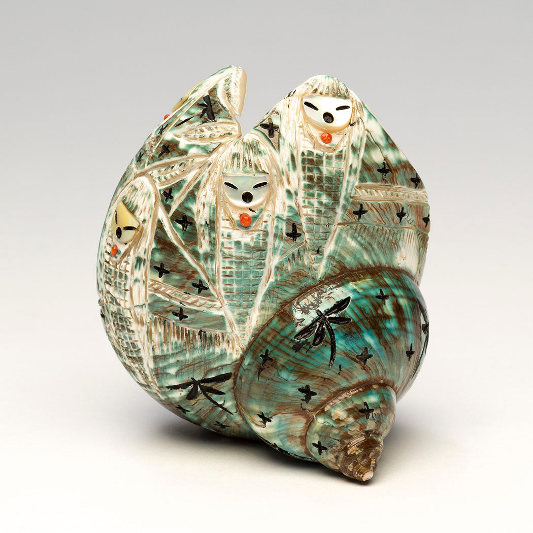 Pacific green snail shell is also known as green turban shell. These gorgeous marine snails live in tropical oceans around Japan and the western Pacific. The unique natural watery environments create varying characteristics in each shell as seen in Kateri Quandelacy Sanchez's assembly of Corn-Maidens. The verdant shell is a lovely backdrop to sisters whose soothing faces are from iridescent gold lip shell. They wear colorful red coral cabochons and many Dragonflies and stars dance among them. About 2 3/4" long, 2 5/8" wide and 3 1/4" tall.
