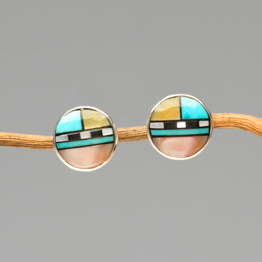 These plump little beauties are handmade in the challenging stone to stone jewelry technique by Delbert Kallestewa. Honoring the Zuni Sunface symbol which represents a balance of the elements, materials utilized in the creation of these affordable post earrings are sterling silver, bright turquoise, refreshing serpentine, pen shell, iridescent mother-of-pearl and lovely pink mussel shell. They are featherweight in wearability. About 3/8" long, 3/8" wide and 1/8" deep.