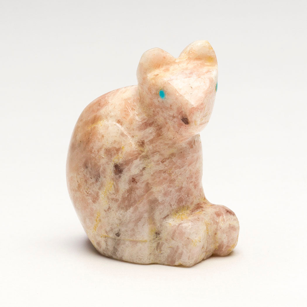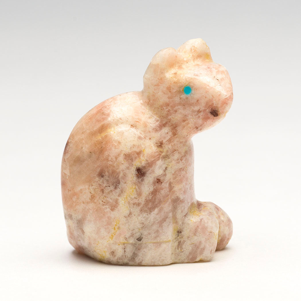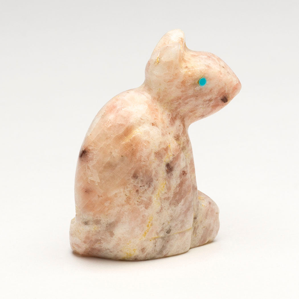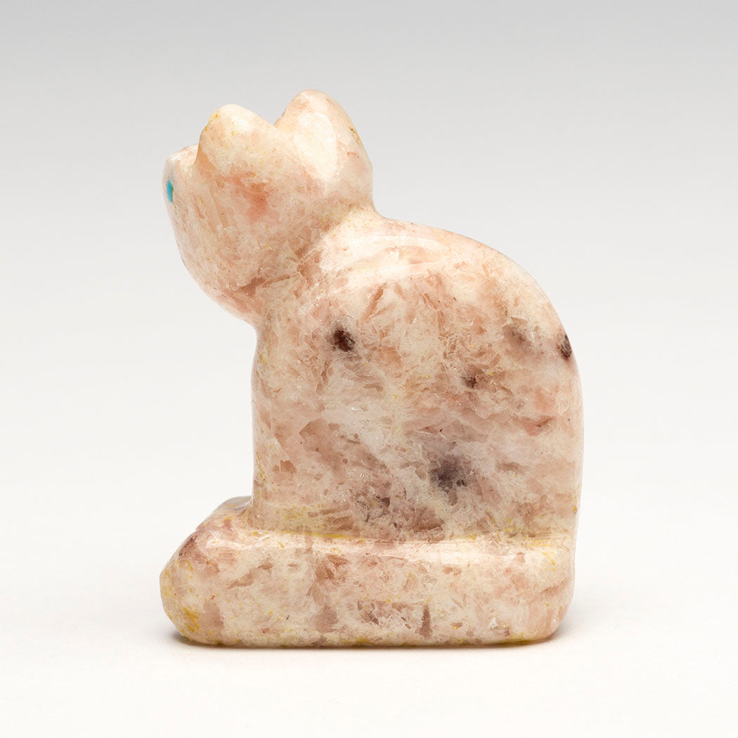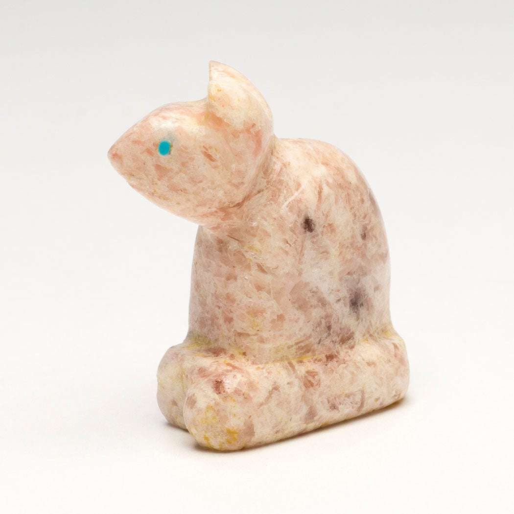 An old-growth pine forest in northern New Mexico is home to the pine marten or Pacific marten, an elusive woodland creature. They are considered an indicator species because their presence conveys the overall health of the forest. Gilbert Lonjose's territorial pine marten with turquoise inlaid eyes spots the perfect tree hollow to build a cozy winter nest in. Sculpted from pink marble with quartz inclusions, this sweet solitary mammal measures approximately 1 1/2" long, 7/8" wide and 2" tall.