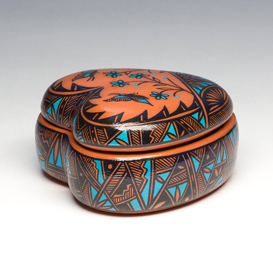 The power of flowers is for everyone including Mother Earth's airy pollinator butterflies. Noreen Simplicio's ceramic clay heart box is artfully painted with ceramic paints and glaze depicting sweet Butterflies who dance among the flower-draped woods. Noreen says the scenes depicted on her work stress the universal harmony that should be maintained among all living things. Signed by the artist. About 4 1/8" long, 4 1/4" wide and 2 1/4" tall, measurements include the lovely lid. A 2-piece set to hold jewelry or whatever your heart desires.