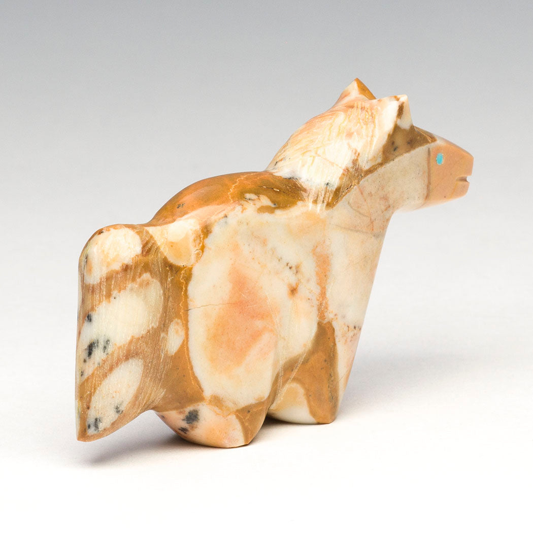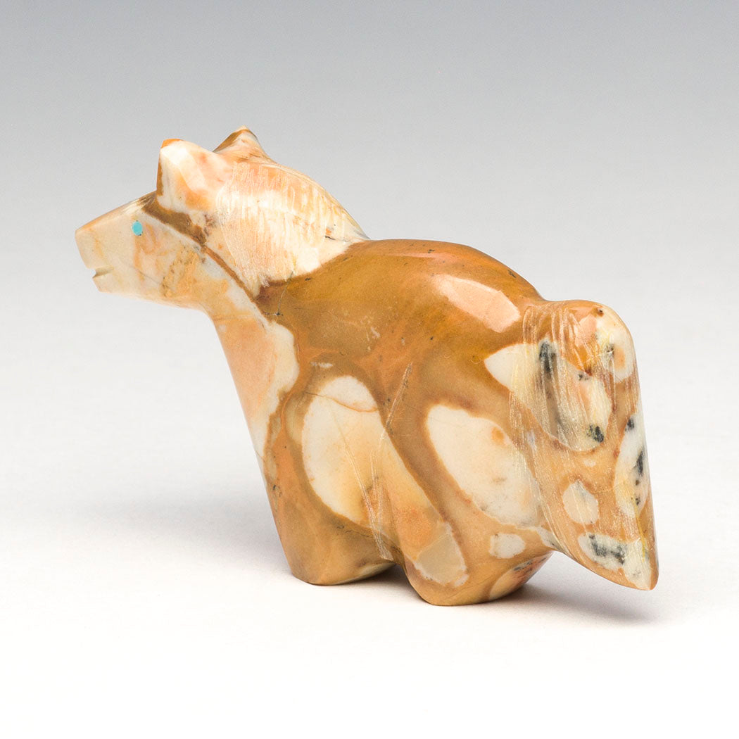 Grazing among the rolling Zuni fields, Daphne and Leland Boone's tidgilite Horse invites you to slow down and savor the quiet beauty of Indigenous Pueblo life through Mother Earth's gifts and Sun Father's blessings. A gentle equine spirit comes from this noble friend with welcoming eyes from turquoise inlays. Approximately 2 7/8" long, 1/2" wide and 1 3/4" tall.